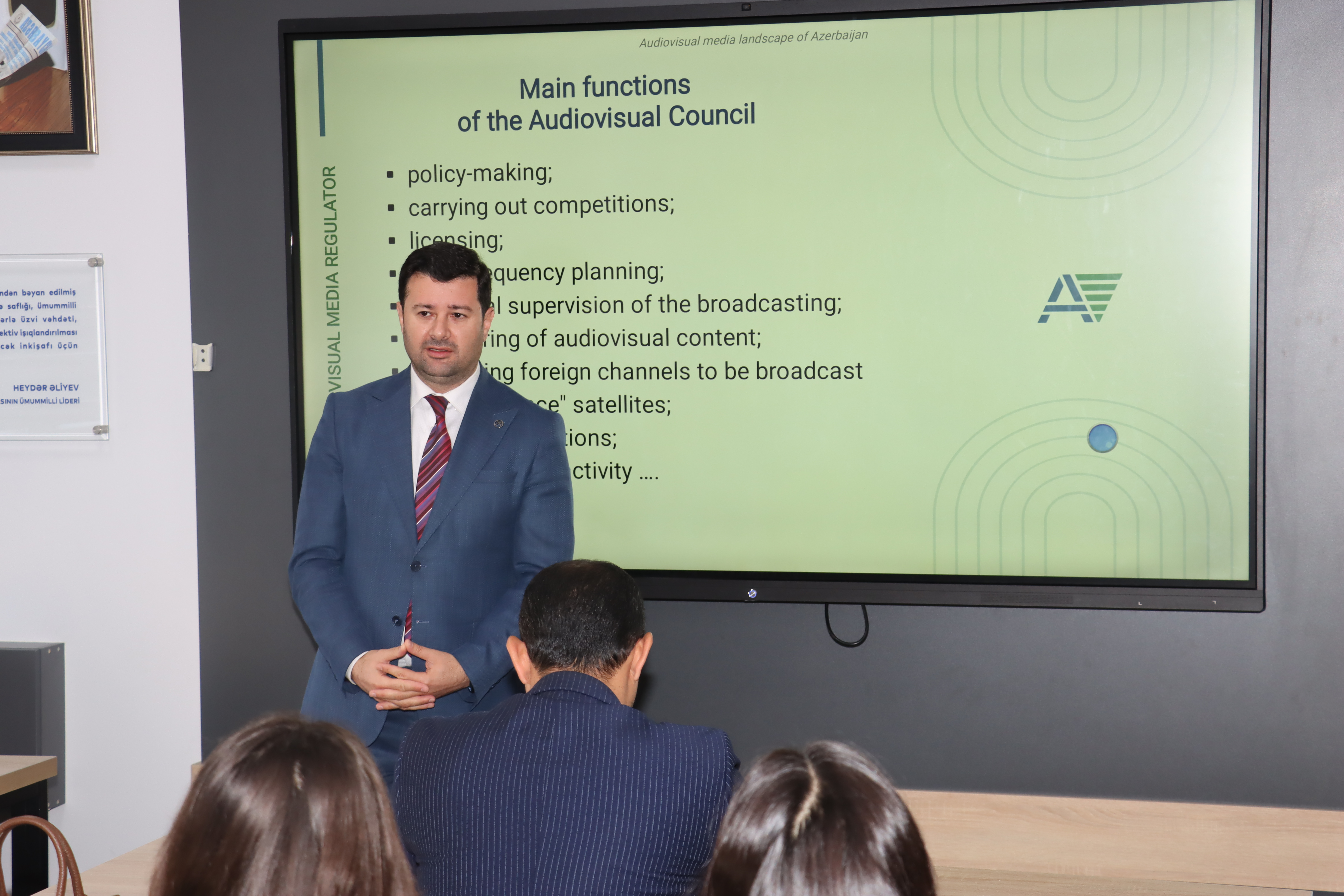 Audiovizual Şuranın Hüquq və beynəlxalq əməkdaşlıq şöbəsinin baş məsləhətçisi Ayxan Sadıqlı “Azərbaycanda audiovizual media və onun tənzimlənməsi” mövzusunda təqdimatla çıxış edərək, tələbələrə audiovizual media subyektləri və onların fəaliyyəti, mediada yayımlanan informasiyaya qoyulan tələblərdən söz açıb.