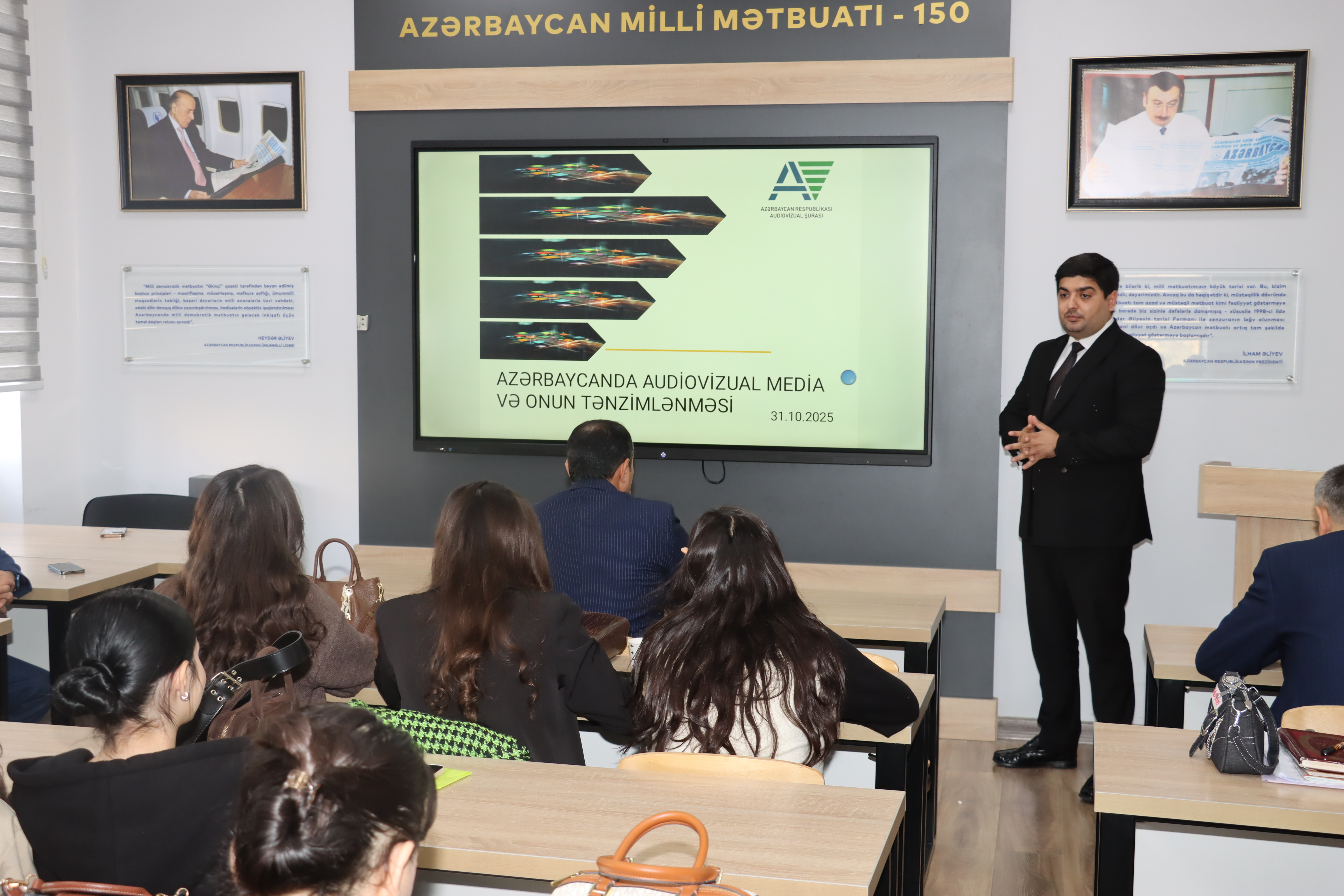 Audiovizual Şuranın Kommunikasiya sektorunun müdiri Taleh Quliyev Şuranın fəaliyyət istiqamətləri, audiovizual media subyektləri, həmçinin görülən işlər barədə tələbələrə ətraflı məlumat verib. Audiovizual Şuranın keçirdiyi tədbir və layihələrdən söz açıb.