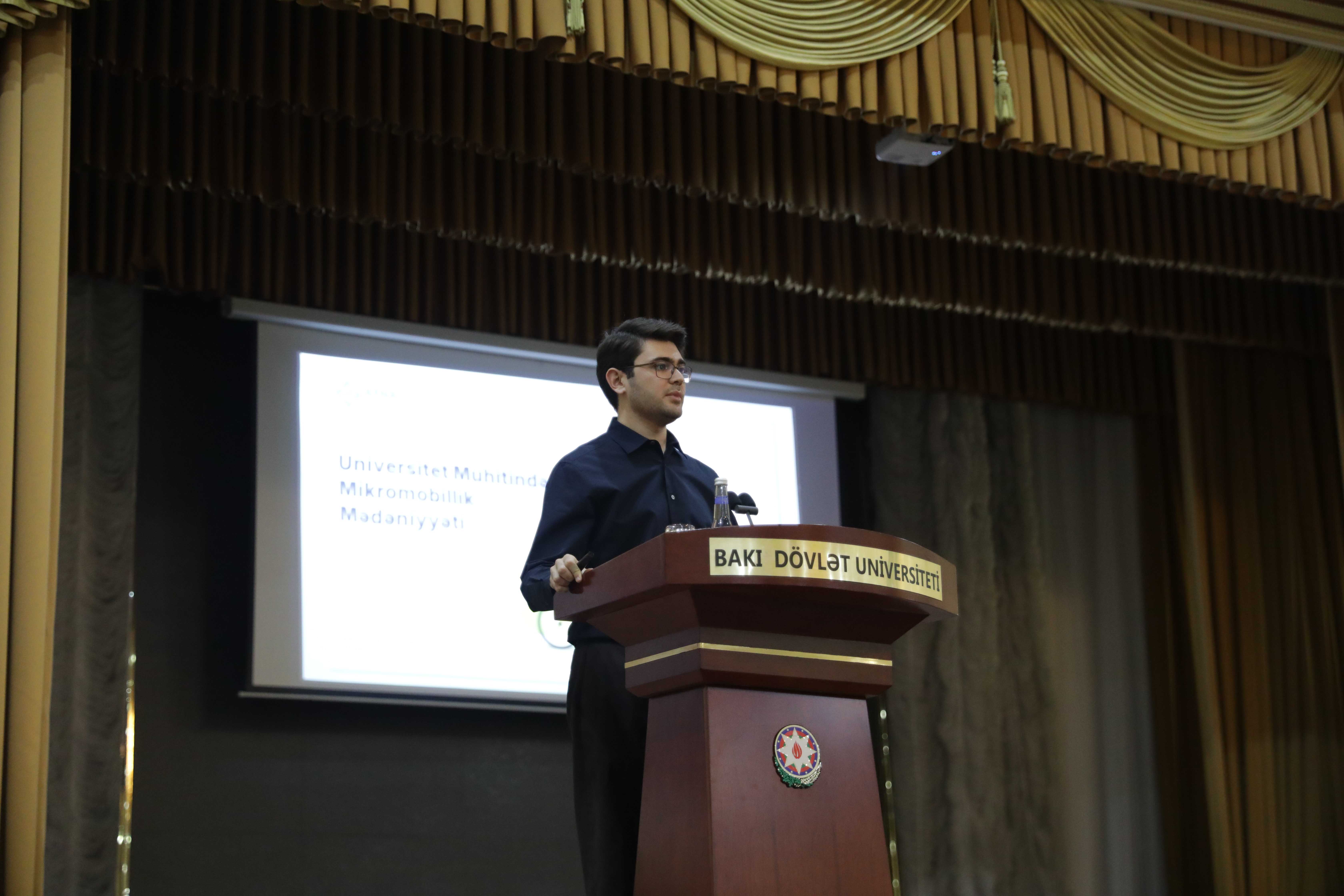 AYNA-nın Kommunikasiya departamentinin əməkdaşı Ruhlan Əbülfəzzadə mikromobillik infrastrukturunun inkişaf etdirilməsi ilə bağlı görülmüş işlər barədə tələbələrə məlumat verib. Qeyd edib ki, mikromobilliyin tətbiqi əhalinin mobilliyini artırmaq, şəhər mərkəzlərində nəqliyyat yükünü azaltmaq və ekoloji vəziyyəti yaxşılaşdırmaq məqsədi daşıyır. Dünyanın bir çox şəhərlərində olduğu kimi, paytaxt Bakıda da nəqliyyat sıxlığını aradan qaldırmaq, velosiped, elektrik mühərrikli kiçik nəqliyyat vasitələri istifadəçiləri və digər hərəkət iştirakçılarının təhlükəsizliyini təmin etmək məqsədilə işlər görülür. Hazırda Bakı şəhərində mikromobillik zolağının ümumi uzunluğu 60,5 kilometr təşkil edir. Şəbəkənin uzunluğunun 100 kilometrə çatdırılması planlaşdırılır. Görülən işlər çərçivəsində skuterlər üçün 872, velosipedlər üçün isə 623 parklanma məntəqəsi təşkil edilib. Əhali arasında mikromobillik vasitələrinə artan marağı, eləcə də bu nəqliyyat növünün geniş istifadəsinin mikromobillik, nəqliyyat sıxlığının azaldılması, ətraf mühitin qorunması, fiziki fəallığın artırılması və sağlam həyat tərzi baxımından əhəmiyyətini nəzərə alaraq, sakinlər üçün mikromobillik zolaqları şəbəkəsinin genişləndirilməsi davam etdiriləcək.