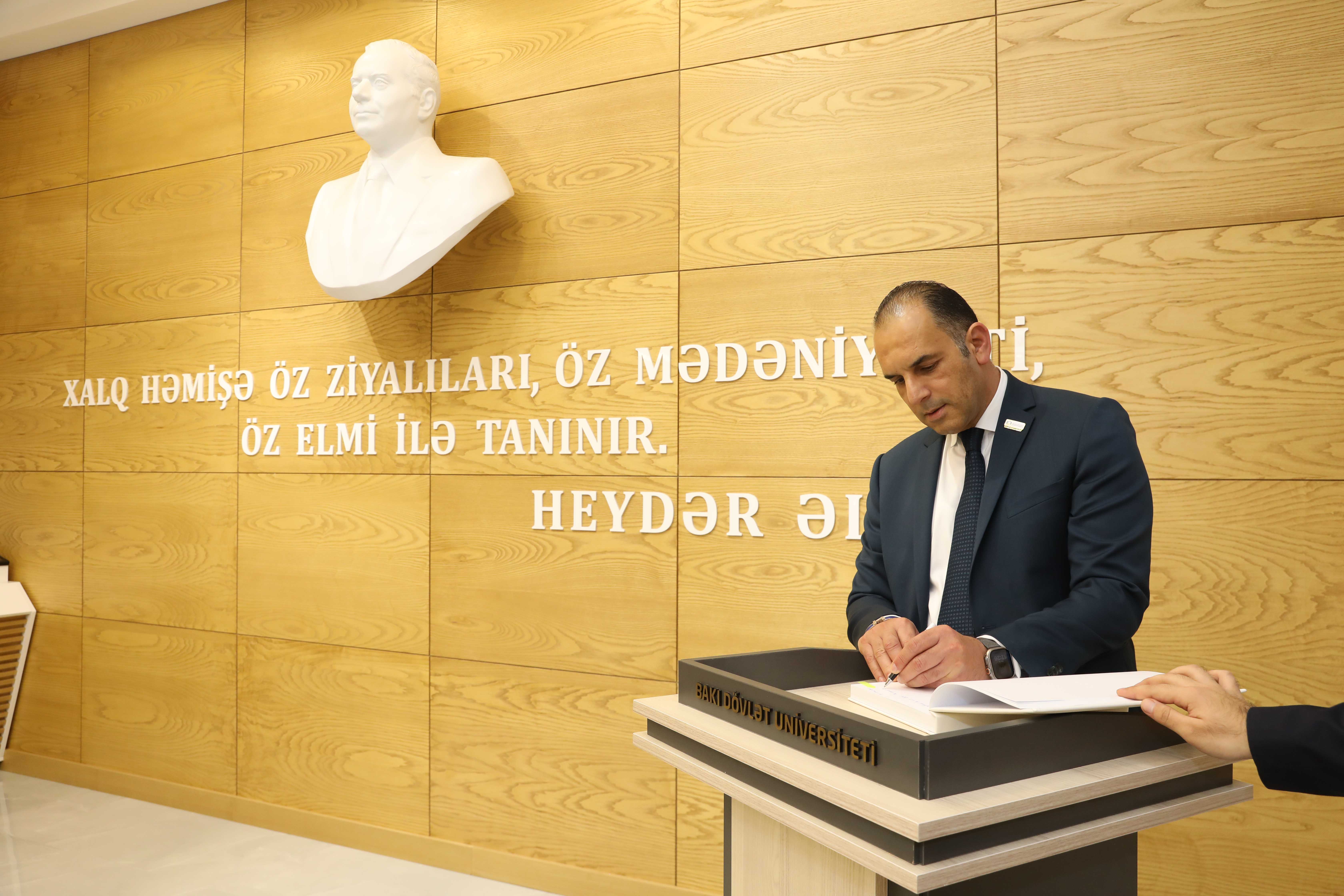 Rektor Elçin Babayev qonağa ölkənin ən böyük və ilk universiteti olan BDU-nun tarixi, tədris və elmi infrastrukturu, beynəlxalq əməkdaşlıqları barədə məlumat verib. Qeyd edib ki, son illərdə Bakı Dövlət Universiteti ərəb dünyasının bir sıra ölkələri ilə əməkdaşlıq əlaqələrini gücləndirib. Bir sıra ərəb ölkələrinin ölkəmizdəki səfirləri ilə görüşlər keçirilib, yeni layihələr müzakirə olunub. BDU ölkədə ərəb dili tədrisinin aparıcı mərkəzidir. Tədqiqat potensialı yüksək olan BDU-da son illər yeni mərkəz və elmi-tədqiqat laboratoriyaları fəaliyyətə başlayıb. Rektor Ajman Universiteti ilə müxtəlif istiqamətlər üzrə birgə tədqiqatlar aparmaq üçün geniş imkanların olduğunu bildirib.