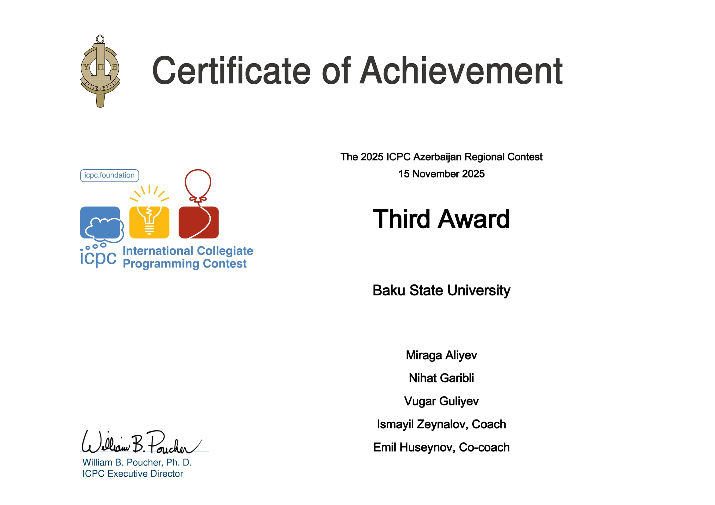 Azərbaycan Texniki Universitetində təşkil olunan müsabiqədə Azərbaycanın 20 ali təhsil müəssisəsindən 52 komanda (hər biri üç tələbə və bir komanda rəhbərindən ibarət olmaqla), həmçinin müsabiqədənkənar 3 məktəbli komandası iştirak edib. Komandalara 5 saat ərzində 12 alqoritmik məsələni C++, Java və ya Python proqramlaşdırma dillərində həll etmək və bu həlləri avtomatik qiymətləndirmə sistemində sınaqdan keçirmək tapşırığı verilib. Müsabiqənin nəticələrinə əsasən, BDU komandası üçüncülüklə qalib olub. Komandamız 15–17 dekabr 2025-ci il tarixlərində Gürcüstanın paytaxtı Tbilisi şəhərində keçiriləcək “50-ci ICPC – Universitetlərarası Beynəlxalq Proqramlaşdırma Müsabiqəsi”nin yarımfinal mərhələsində və Cənubi Qafqaz Açıq Çempionatında (komanda və fərdi nominasiyalar üzrə) ölkəmizi təmsil edəcək 21 komandadan biri olub.