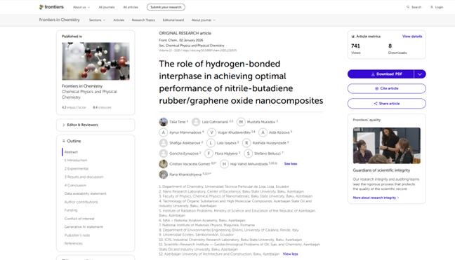 BDU-nun Tədqiqat, İnkişaf və İnnovasiyalar üzrə Mükəmməllik Mərkəzinin Nanoaraşdırmalar elmi-tədqiqat laboratoriyasında qrafen oksidin (QO) butadien-nitril kauçuku (BNK) əsaslı kompozit materialın struktur, termiki, optik və elektrik xüsusiyyətlərinə təsirinin araşdırılması üzrə aparılan tədqiqatlarda aktiv iştirak edən SABAH qruplarının magistratura səviyyəsinin II kurs tələbələri Lalə İsayeva və Rəşidə Hüseynzadənin həmmüəllifi olduqları “Nitril-butadien kauçuku/qrafen oksid nanokompozitlərinin optimal performansının əldə edilməsində hidrogen rabitəli interfazanın rolu” (The role of hydrogen-bonded interphase in achieving optimal performance of nitrile-butadiene rubber/graphene oxide nanocomposites) adlı məqalə “Scopus” bazasında Q1 kvartilli “Frontiers in Chemistry” jurnalında dərc edilib.