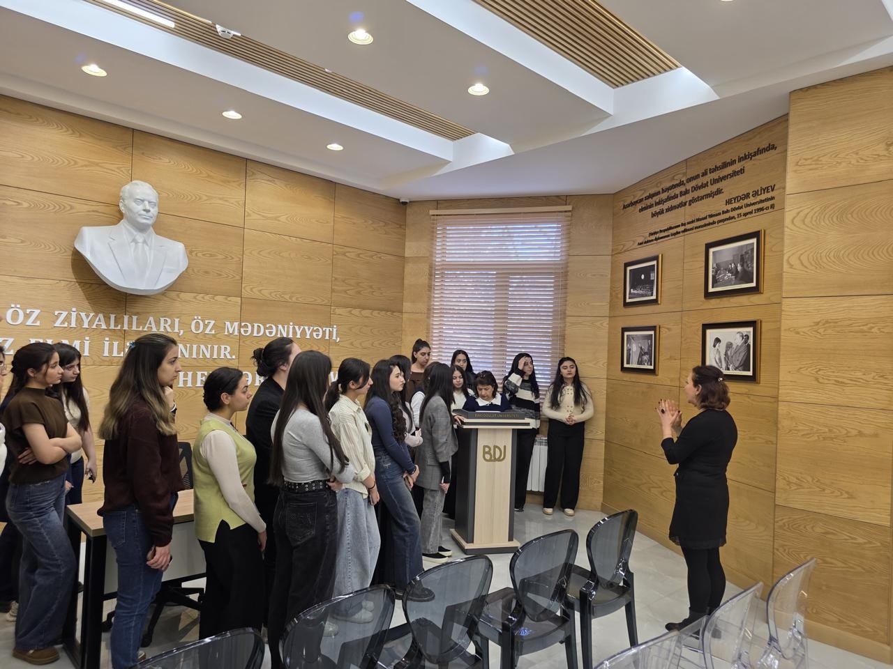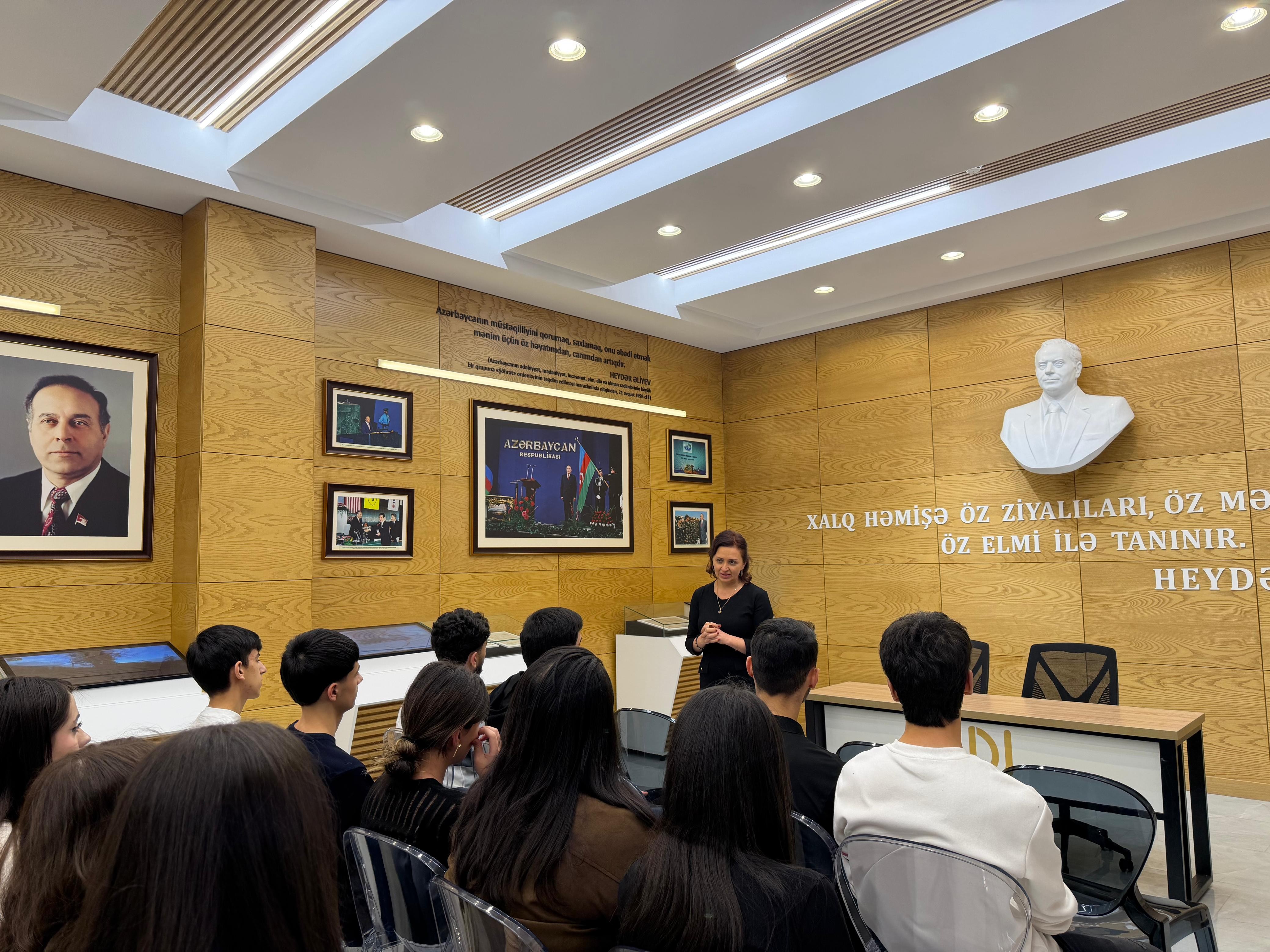 Muzeyin müdiri Afət Seyidzadə 1997-ci ildən Ulu Öndər Heydər Əliyevin şəxsi razılığı ilə Universitetdə fəaliyyətə başlayan Muzey haqqında tələbələrə ətraflı məlumat verib. Bildirib ki, Heydər Əliyev Muzeyi Ümummilli Liderin zəngin irsinin təbliği və öyrənilməsində mühüm əhəmiyyətə malikdir.