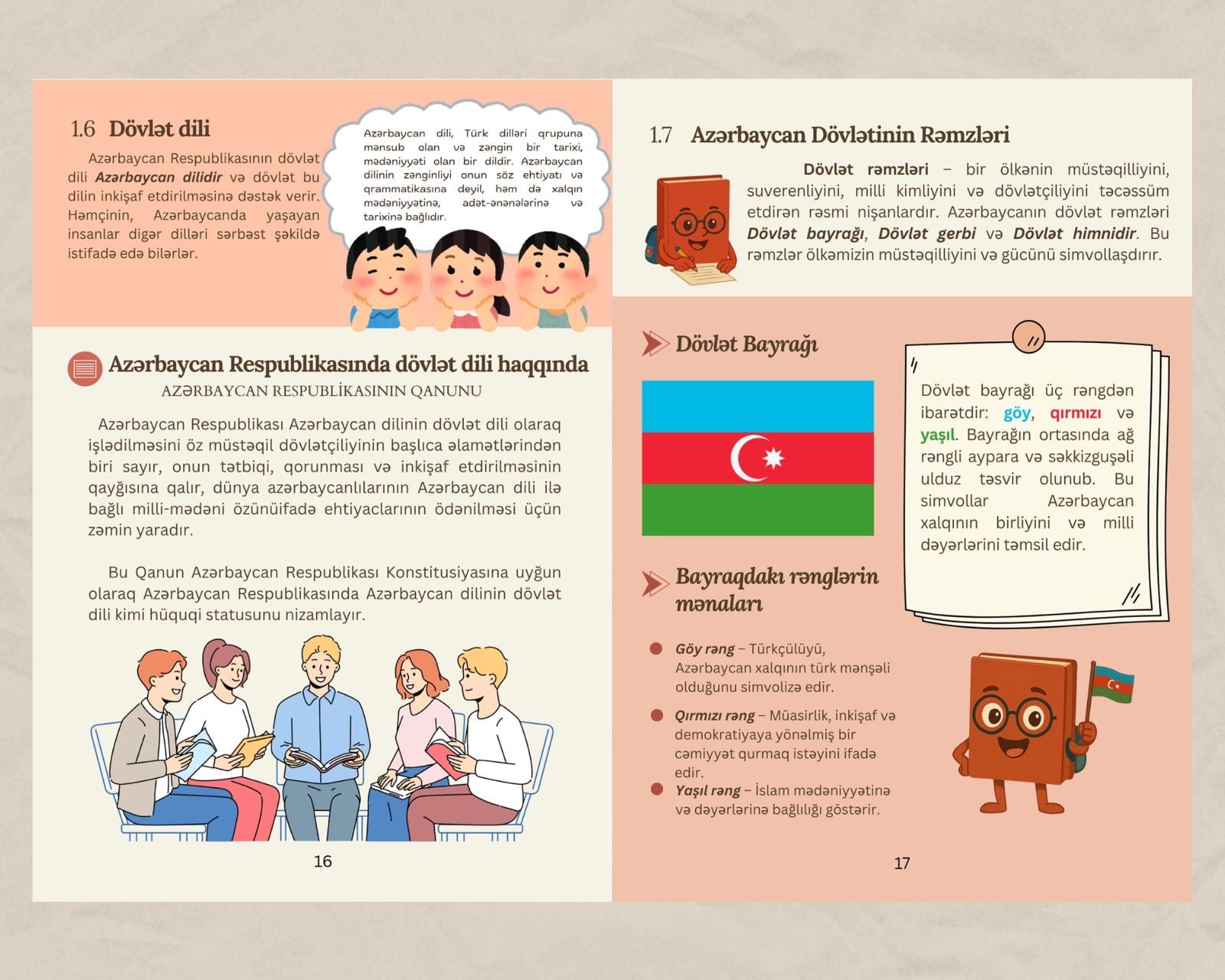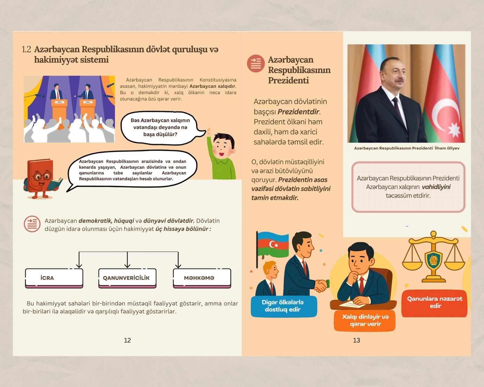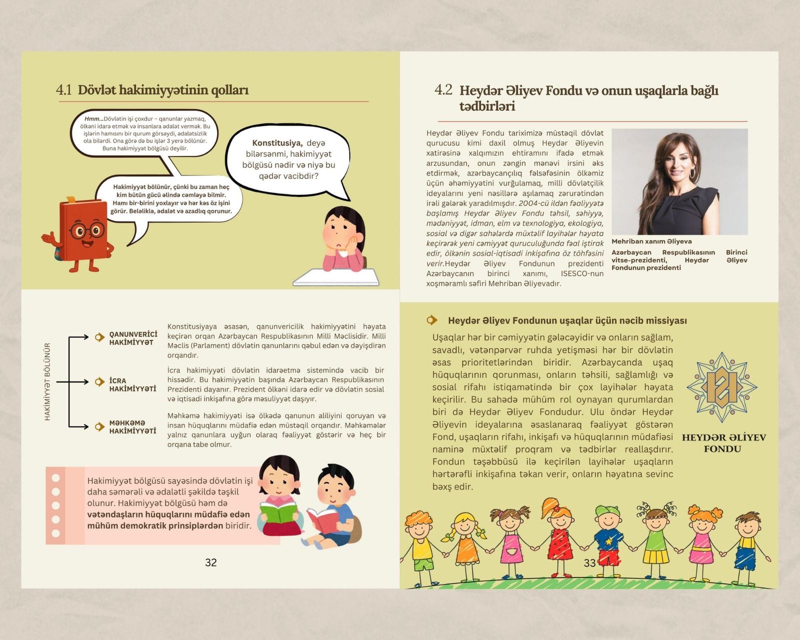 Vəsait bir neçə hissədən ibarətdir. Giriş bölməsində Ümummilli Lider Heydər Əliyevin milli Konstitusiyanın müəllifi və hüquqi dövlət modelinin banisi kimi tarixi rolu, həmçinin Prezident İlham Əliyevin rəhbərliyi ilə dövlətimizin suverenliyi və ərazi bütövlüyünün tam bərpa olunması prosesi anlaşıqlı şəkildə təhlil edilir. Birinci fəsildə dövlət quruluşu, paytaxt, dövlət dili və rəmzləri sadə və sistemli şəkildə izah edilir. İkinci və üçüncü fəsillər uşaqların əsas hüquq və azadlıqlarına, habelə onların vətəndaşlıq borclarına – qanunlara əməl etmək, dövlət rəmzlərinə hörmət və Vətənin müdafiəsi kimi vəzifələrə həsr olunub. Dördüncü fəsildə isə hakimiyyət bölgüsü prinsipi, dövlət idarəetməsində tarazlıq və nəzarət mexanizmləri, eləcə də Heydər Əliyev Fondunun uşaqların rifahı istiqamətində həyata keçirdiyi çoxşaxəli layihələr öz əksini tapıb.