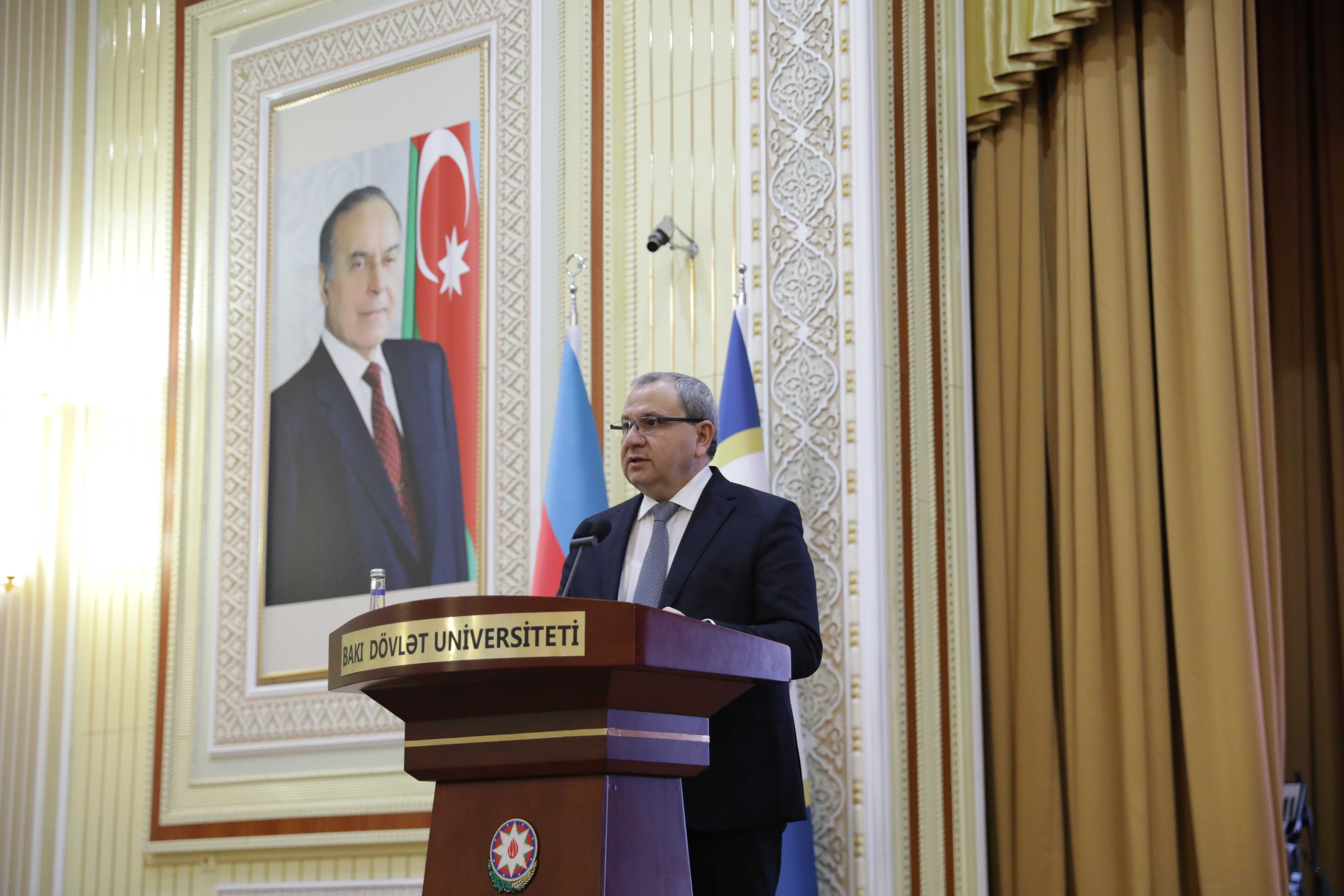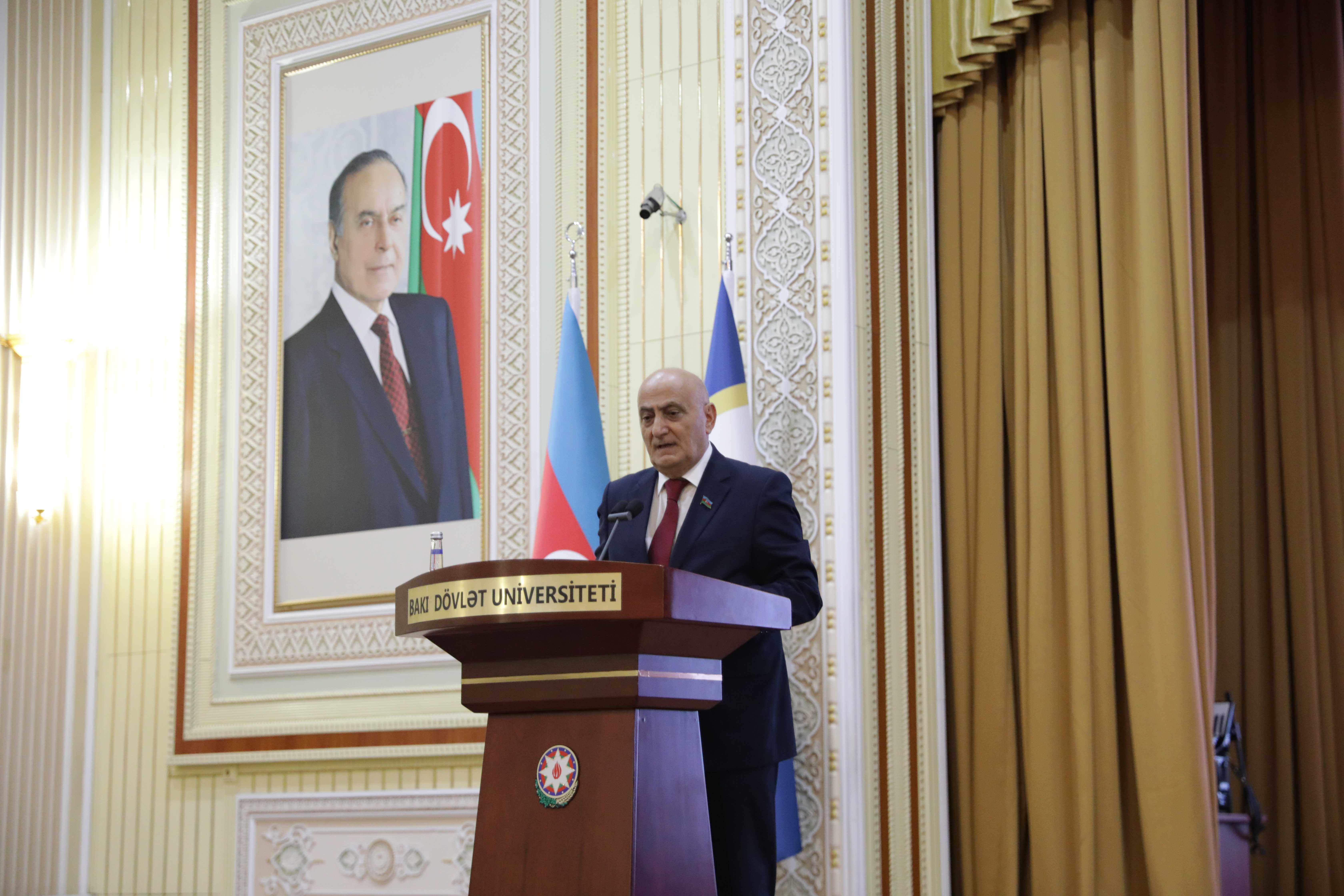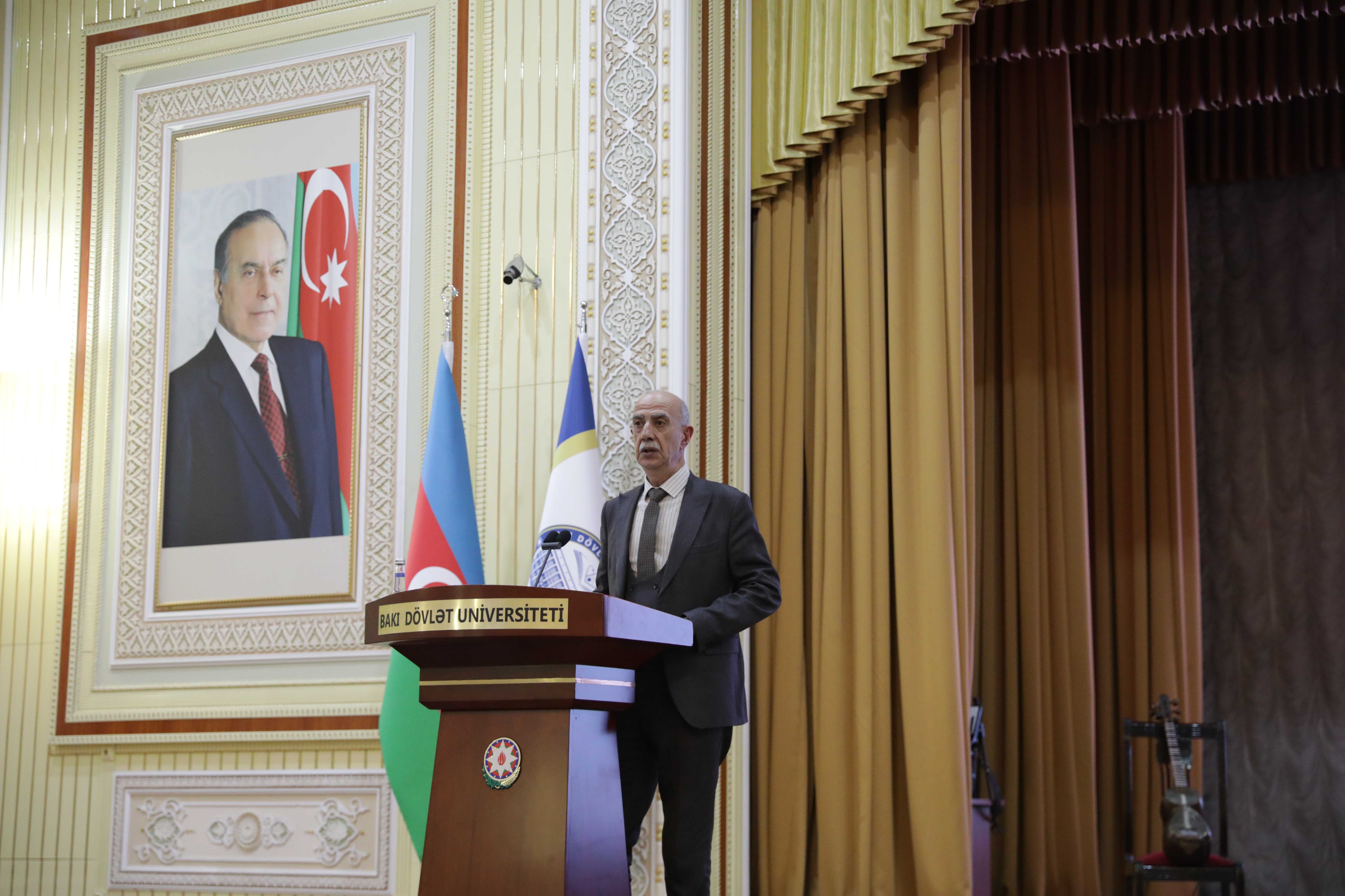 Tədbir BDU-nun akt zalında davam edib. Dövlət himni səsləndirilib, torpaqlarımızın azadlığı uğrunda canlarından keçmiş şəhidlərimizin əziz xatirəsi bir dəqiqəlik sükutla yad edilib.