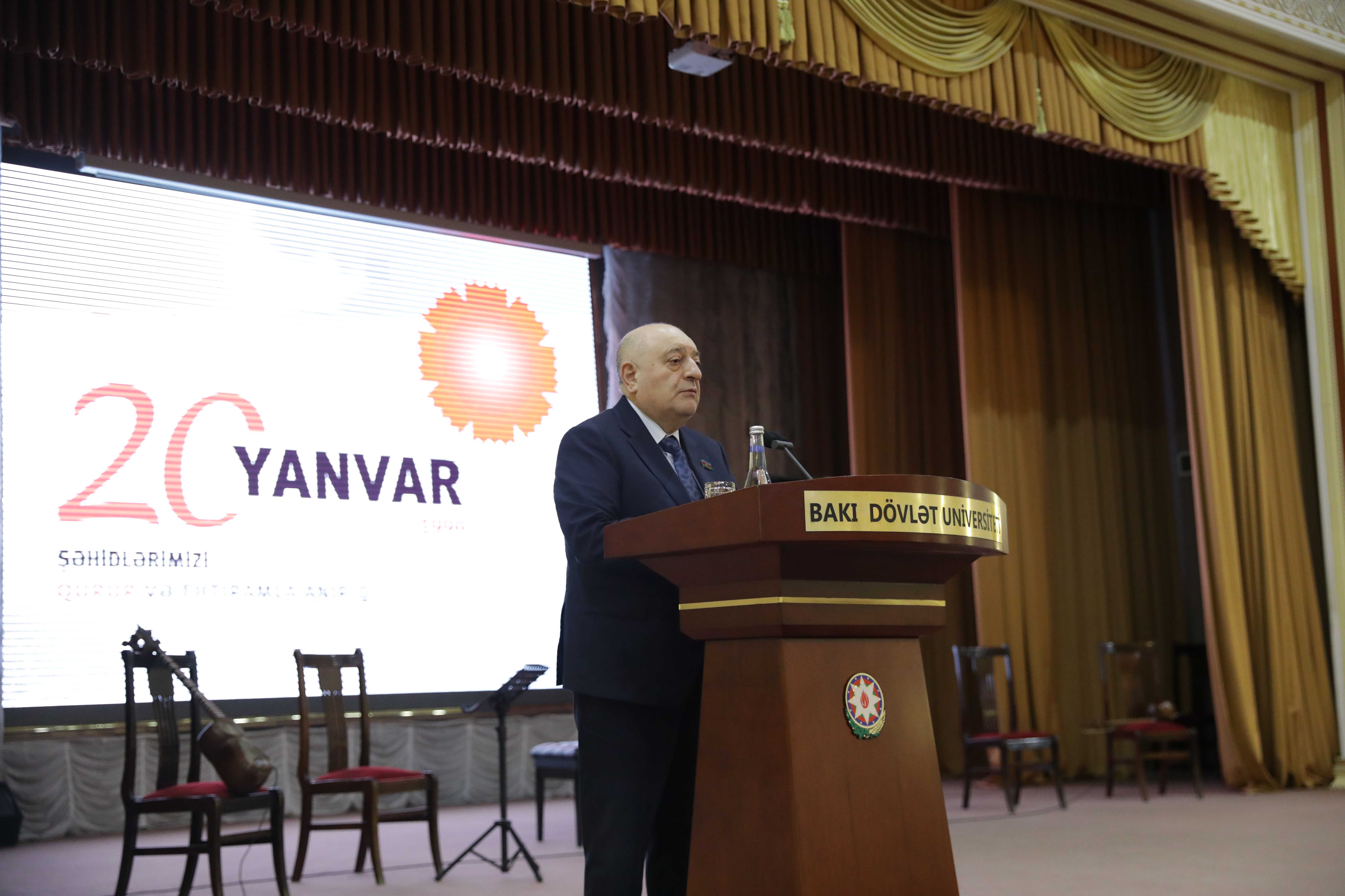 Rektor bildirib ki, 20 Yanvar faciəsi Azərbaycan elminin və təhsilinin beşiyi olan Bakı Dövlət Universitetinin tarixində də dərin iz buraxıb. Həmin qanlı gecədə xalqımızın azadlığı uğrunda mübarizənin ön sıralarında BDU-nun tələbə və məzunları da fəal iştirak ediblər. Onlar Vətənin taleyinin həll olunduğu məqamlarda yüksək vətəndaş mövqeyi, milli ləyaqət və vətənpərvərlik nümunəsi göstərib, bu yolda canlarından keçərək şəhidlik zirvəsinə yüksəliblər: “20 Yanvar şəhidləri sırasında olan BDU tələbə və məzunları Universitetimizin qürur mənbəyidir. Onların əziz xatirəsi bu gün də gənc nəslin vətənpərvərlik ruhunda formalaşmasında mühüm rol oynayır. Bu tarix yalnız kədər günü deyil, milli iradənin, birlik və həmrəyliyin təntənəsidir. 20 Yanvar hadisələrində özünü göstərən bu birlik, mətinlik bizə həm də 44 günlük Vətən müharibəsində şanlı Zəfəri qazandırdı. Müzəffər Ali Baş Komandan, Azərbaycan Respublikasının Prezidenti İlham Əliyevin mahir sərkərdəliyi, qətiyyəti, qüdrətli Ordumuzun rəşadəti, xalqımızın birliyi ilə qazandığımız tarixi Zəfərlə bütün şəhidlərimizin intiqamı alındı”.