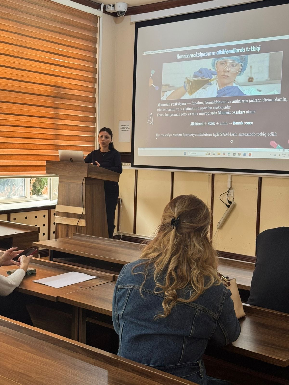 Fiziki və kolloid kimya kafedrasının II kurs magistrantı Ləman Mirzəyeva çıxışında səthi aktiv maddələrin kimya sənayesində tətbiq sahələri, onların yuyucu vasitələrdən tutmuş neft emalı, tekstil, kosmetika, boya və kənd təsərrüfatı kimyası kimi müxtəlif sahələrdə mühüm rol oynadığını və alkilfenolların səthi aktiv birləşmələrin sintezi üçün vacib xammal hesab olunduğunu bildirib. O qeyd edib ki, bu birləşmələrin strukturunda həm hidrofob alkil zənciri, həm də hidrofil fenol qrupu mövcuddur. Bu da modifikasiya olunmuş alkilfenol törəmələrinin yüksək adsorbtiv və emulsiyalaşdırıcı qabiliyyətini təmin edir. Bu səbəbdən alkilfenol əsaslı səthi aktiv maddələrin alınması və xüsusiyyətlərinin öyrənilməsi müasir kimya texnologiyasının aktual istiqamətlərindən biridir.