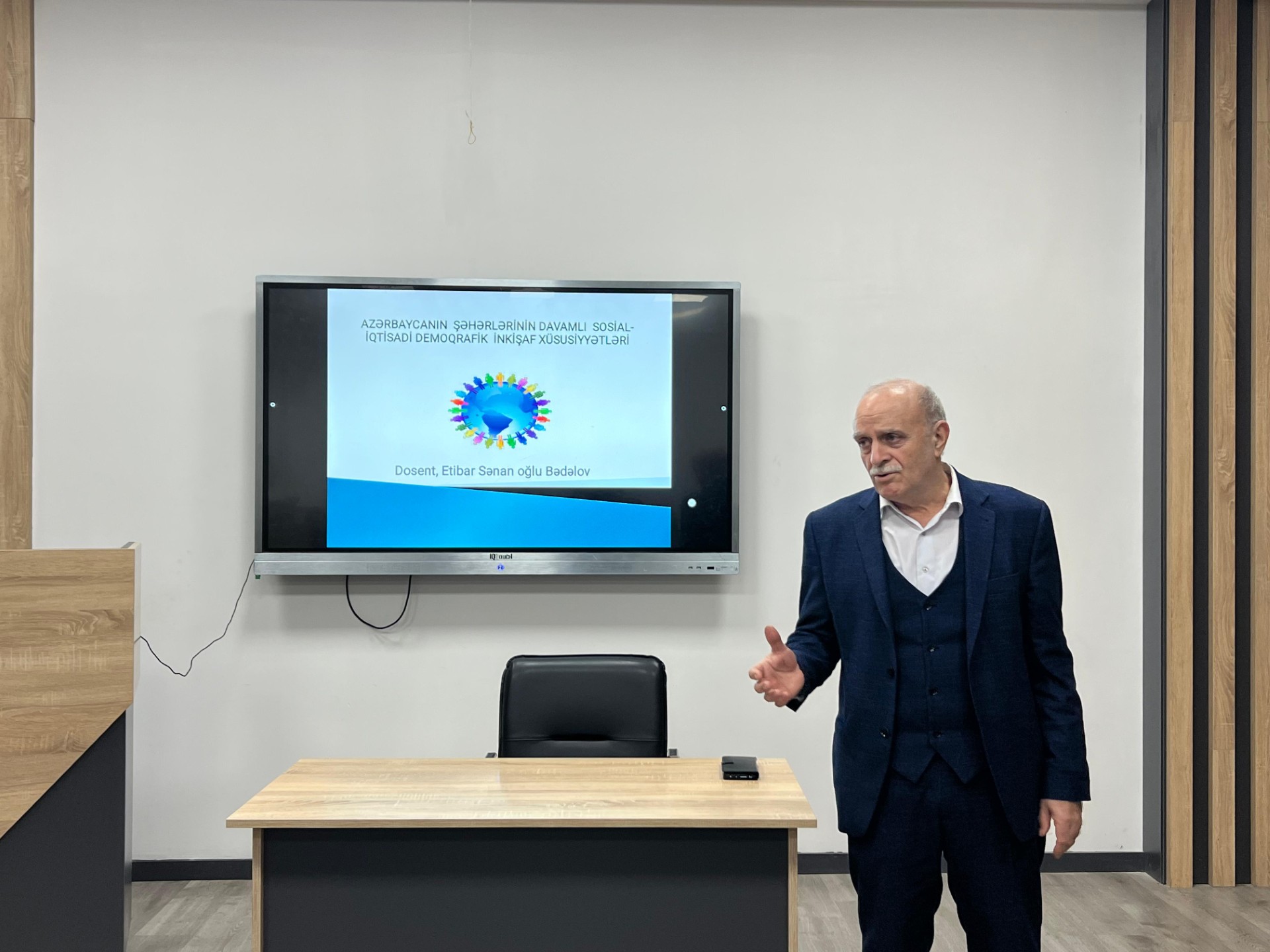 Seminarda Azərbaycan coğrafiyası və coğrafiyanın tədrisi metodikası kafedrasının müəllimi, dosent Etibar Bədəlov məruzə ilə çıxış edib. O, şəhərlərin sosial-iqtisadi inkişafını müəyyən edən amillərin elmi-praktik əsaslarını izah edərək, ölkənin şəhər sistemi üzrə demoqrafik proseslər haqqında məlumat verib. Məruzədə urbanizasiya dinamikası, şəhər mühitinə düşən ekoloji yük, miqrasiya axınlarının şəhər infrastrukturuna təsiri faktlar və statistik göstəricilər əsasında təqdim olunub. Etibar Bədəlov vurğulayıb ki, davamlı inkişaf yalnız iqtisadi göstəricilərlə deyil, həm də sosial rifah, ekoloji tarazlıq və şəhər mühitinin adaptiv idarə edilməsi prinsipləri ilə təmin olunur.