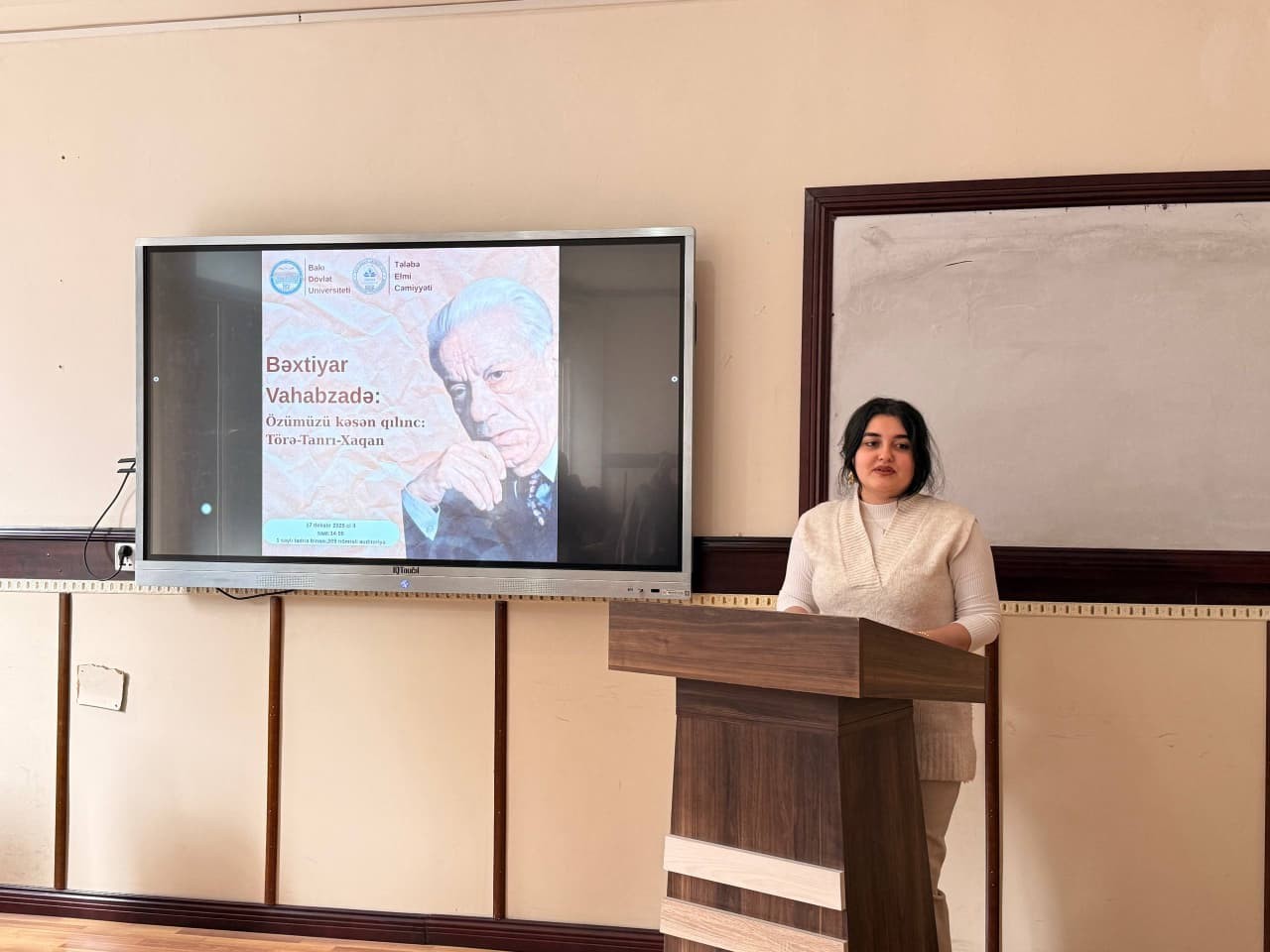 Bakı Dövlət Universitetinin(BDU) Filologiya fakültəsinin Tələbə Elmi Cəmiyyətinin (TEC) təşkilatçılığı ilə Xalq şairi, dramaturq və pedaqoq Bəxtiyar Vahabzadənin anadan olmasının 100 illiyinə həsr olunmuş “Bəxtiyar Vahabzadənin “Özümüzü kəsən qılınc” əsərində Törə–Tanrı–Xaqan” mövzusunda elmi seminar keçirilib.