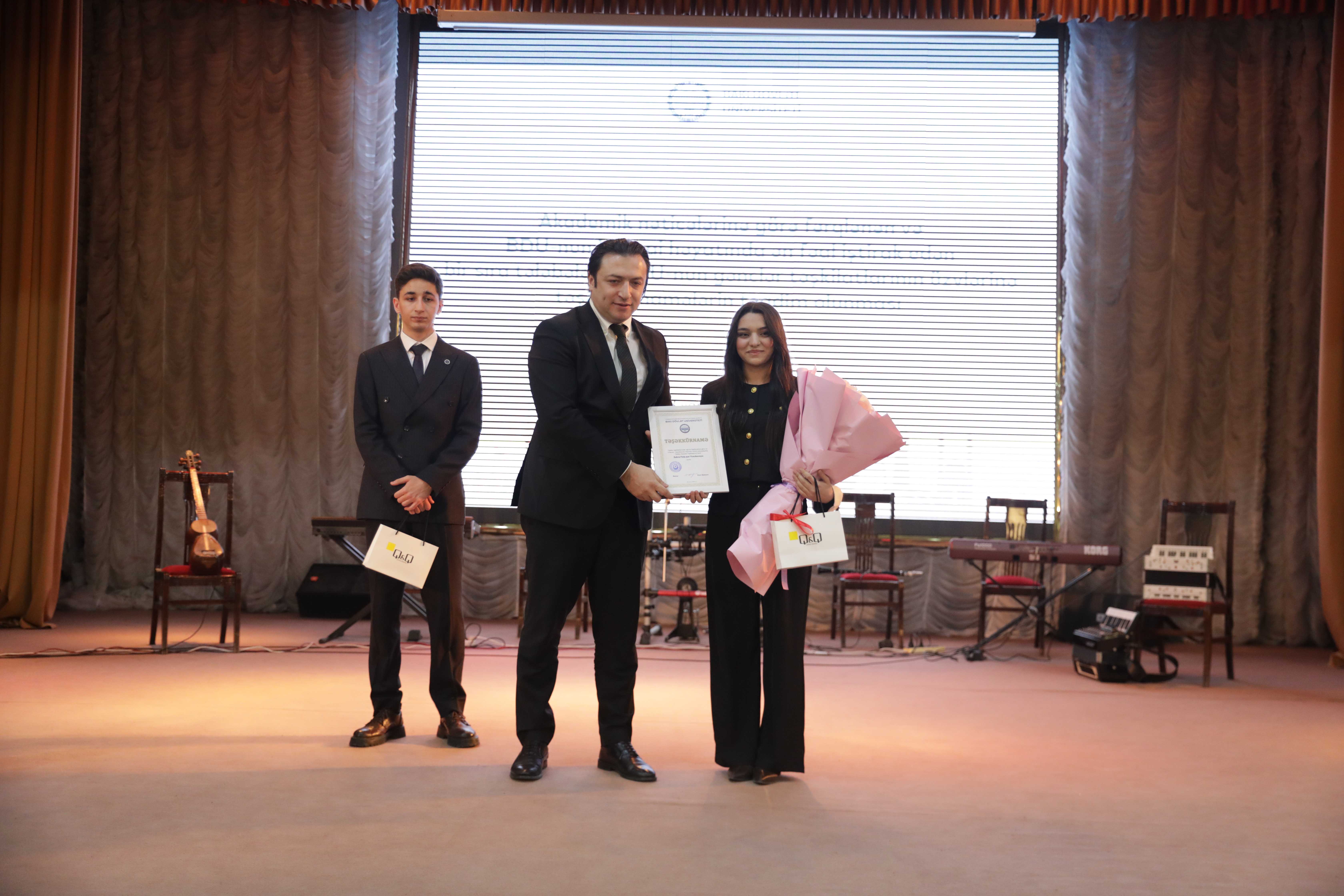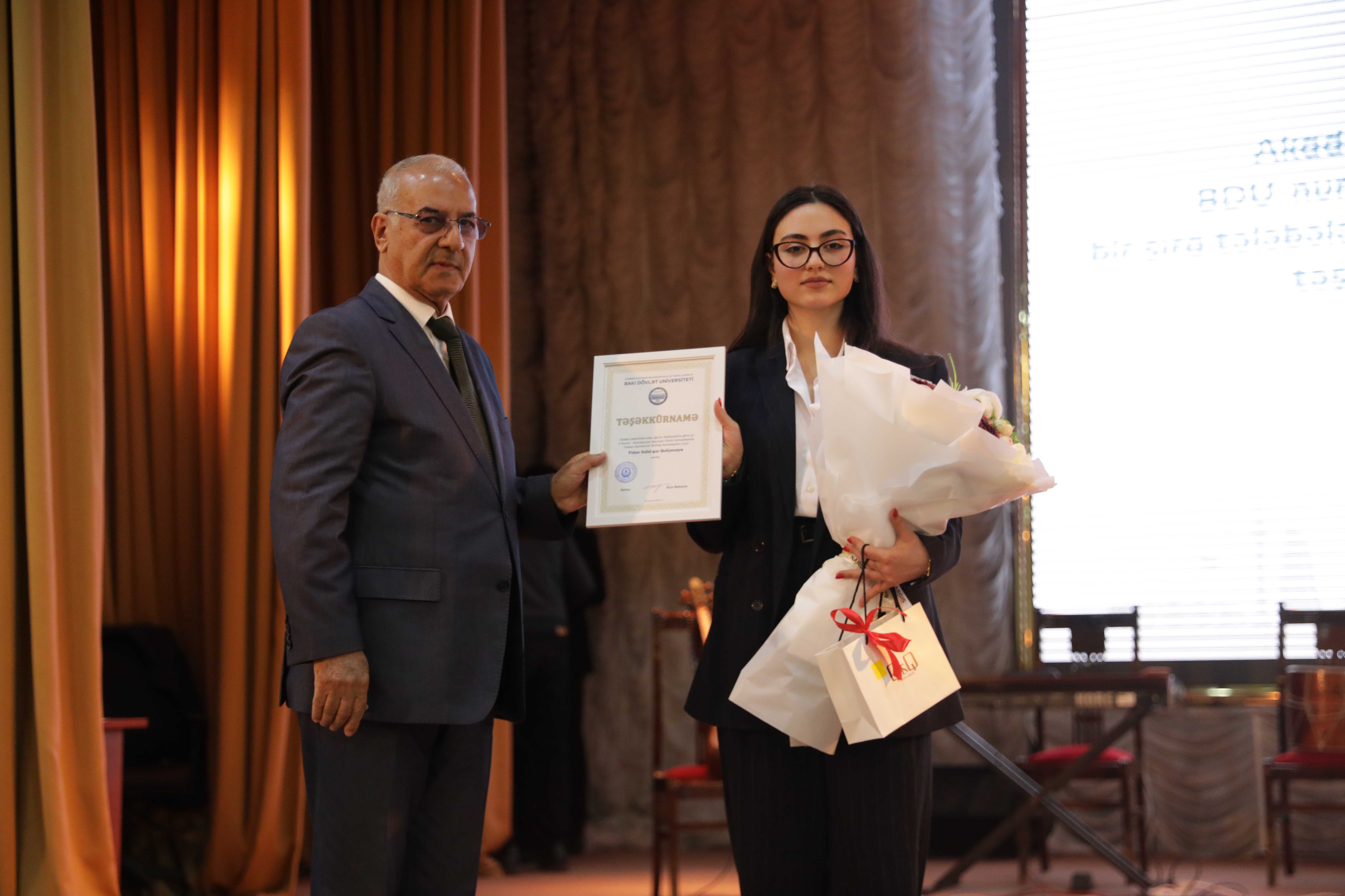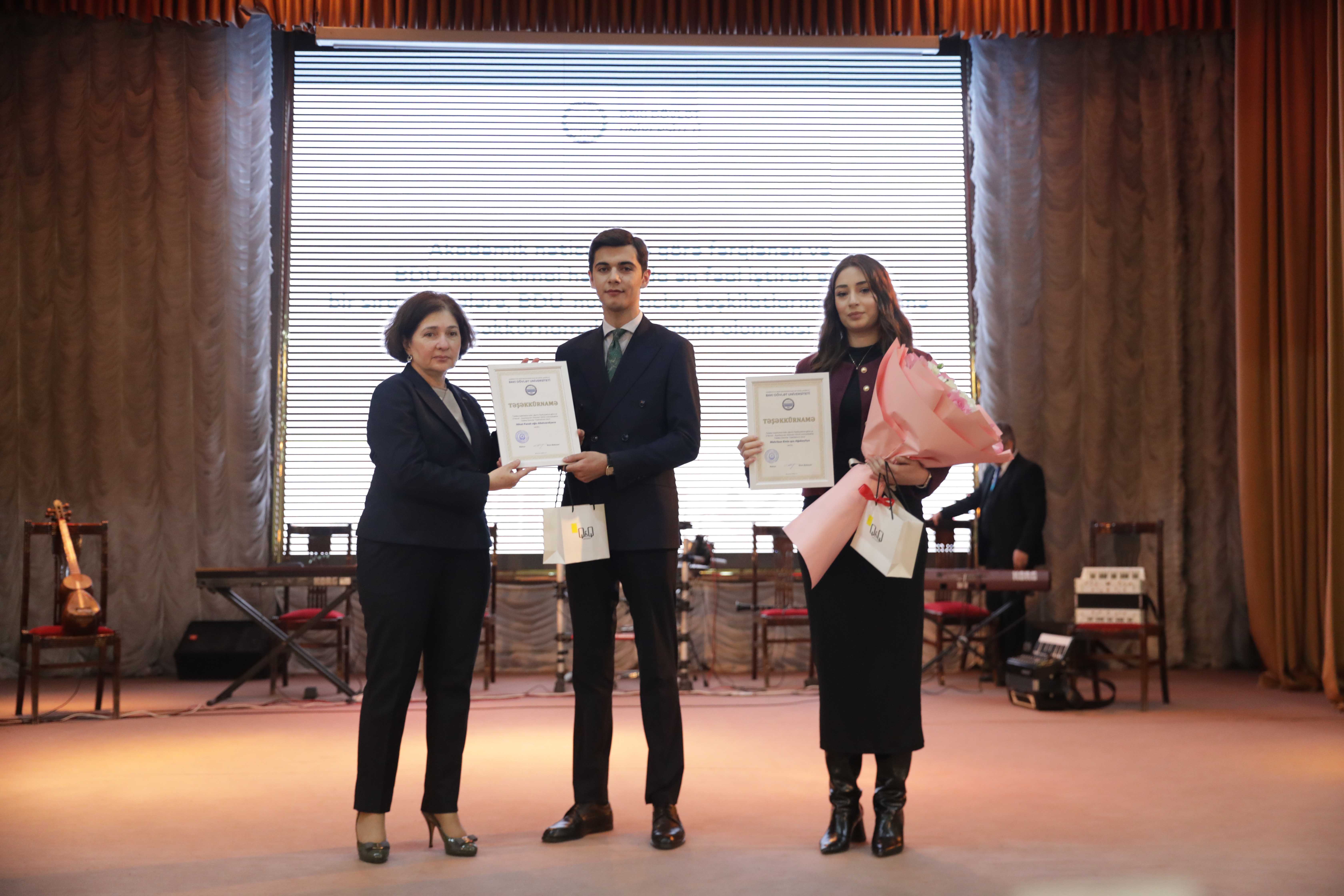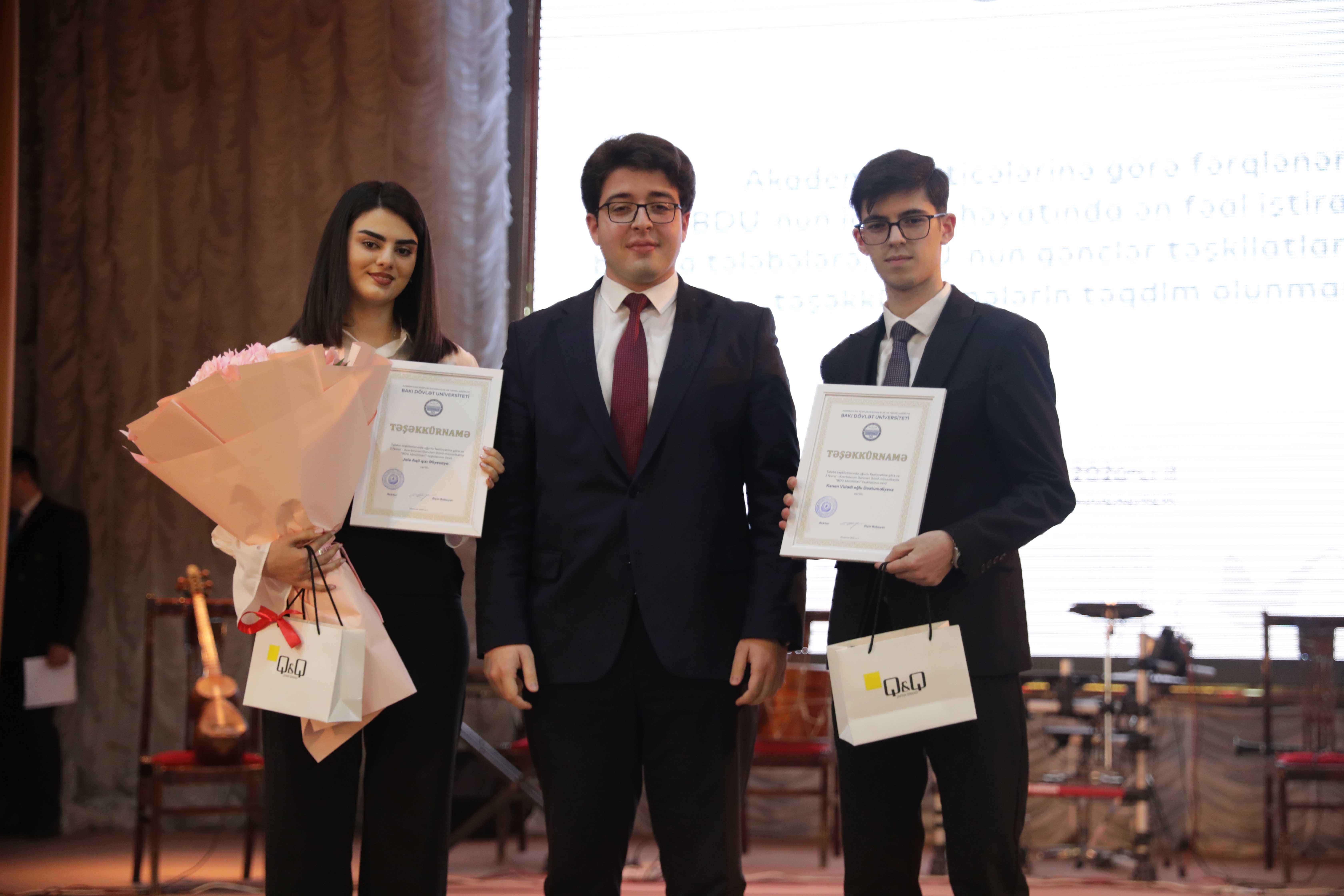 Sonra BDU-nun “İlin gənc alimi” müsabiqəsinin nəticələri elan olunub. Universitetin ictimai həyatında fəal iştirak edən bir sıra tələbələrə, BDU-nun gənclər təşkilatlarının üzvlərinə təşəkkürnamələr təqdim edilib.