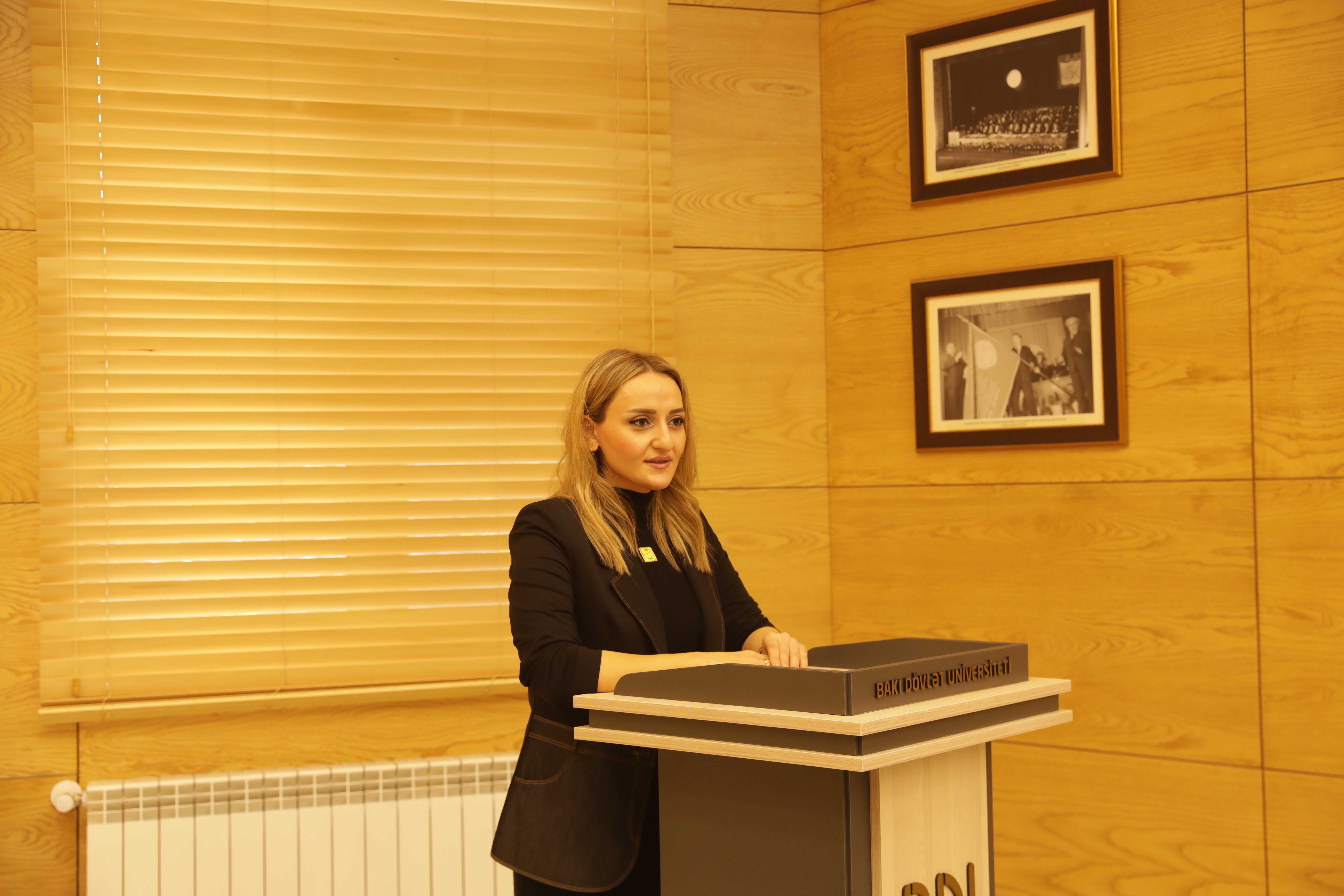 Tədbirin qonağı BDU-nun Beynəlxalq münasibətlər və iqtisadiyyat fakültəsinin müəllimi, politoloq Aytən Qurbanova olub. O bildirib ki, Azərbaycan gənclərinin milli ruhlu vətəndaş kimi formalaşmasında Ümummilli Lider Heydər Əliyevin danılmaz əməyi, misilsiz xidmətləri var. Daim ölkənin gələcəyinin gənclərin əlində olduğunu deyən Ulu Öndərin əsasını qoyduğu dövlət gənclər siyasəti uğurlu inkişaf konsepsiyasının əsas dayağı kimi bu gün Azərbaycanı inamla irəli aparır: “Ümummilli Lider Heydər Əliyev həmişə gənclərimizə böyük ümidlər bəsləyir və dəfələrlə qeyd edirdi ki, Azərbaycanın gələcəyi gənclərin əlindədir. Ulu Öndərin müəyyənləşdirdiyi gənclər siyasəti bu gün Prezident İlham Əliyev tərəfindən uğurla davam etdirilir. Azərbaycanda dövlət gənclər siyasətini daha da inkişaf etdirmək, gənclərin dövlət qulluğunda məsul vəzifələrdə iştirakını təmin etmək, sosial-iqtisadi problemlərinin həllini təmin etmək məqsədi ilə ölkə rəhbərliyi bütün lazımi tədbirləri həyata keçirir, önəmli Dövlət proqramları qəbul olunur. Məhz Ulu Öndərin ideyaları əsasında Prezident İlham Əliyevin prezidentliyi dövründə yetişən gənclərin qəhrəmanlığı nəticəsində torpaqlarımız işğaldan azad edildi. Bu gün ölkə gəncləri siyasi, iqtisadi, elm, innovasiya və ən müxtəlif sahələrdə Azərbaycanı dünyanın hər yerində uğurla təmsil edir, bayrağımızı daha da ucalara qaldırır”.