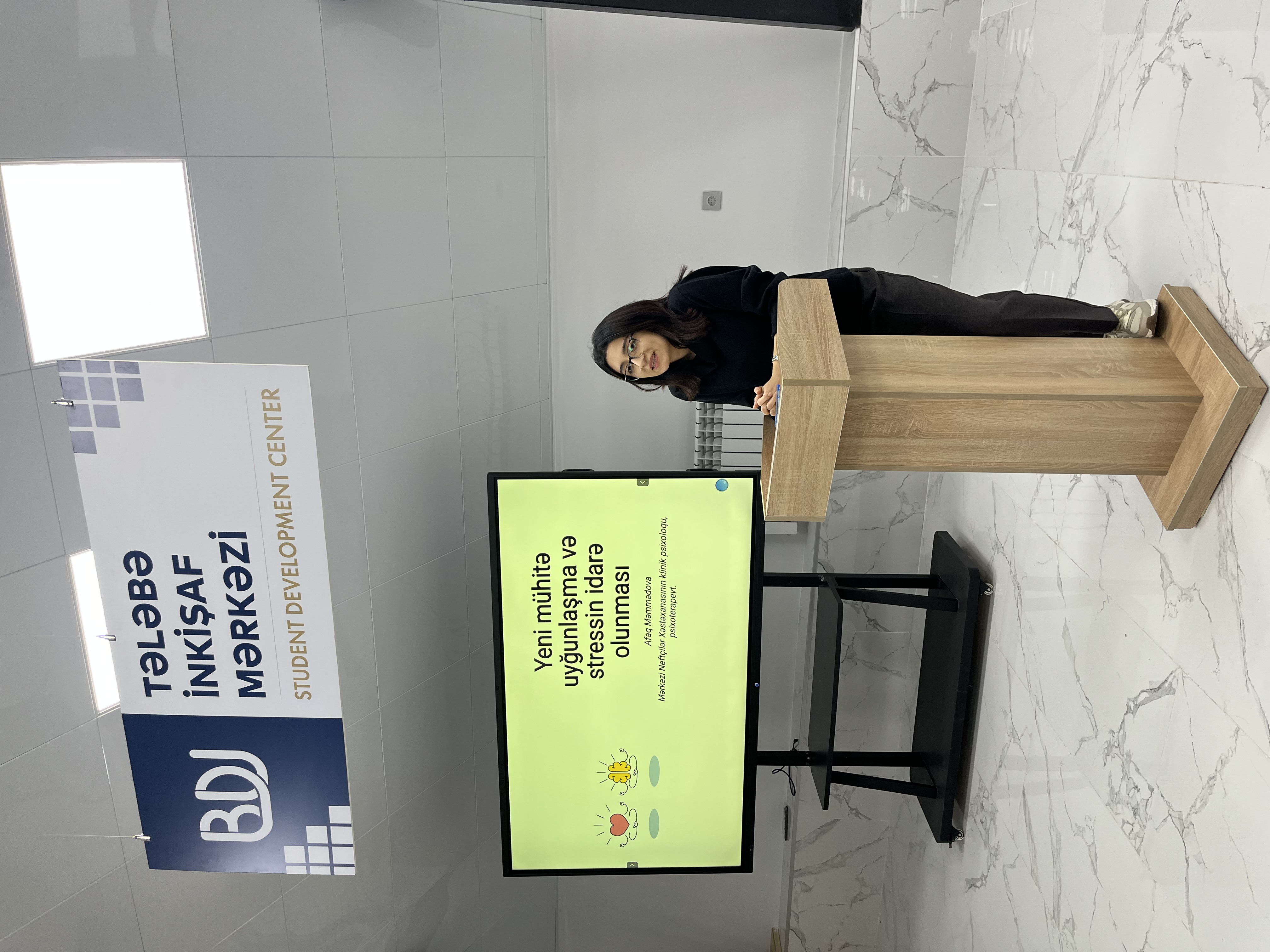 Bakı Dövlət Universitetinin (BDU) Karyera və məzunlarla iş Mərkəzinin təşkilatçılığı ilə “Adaptasiya proqramı” çərçivəsində klinik psixoloq, psixoterapevt Afaq Məmmədovanın “Yeni mühitə uyğunlaşma və stresin idarə edilməsi” mövzusunda təlimi keçirilib.
