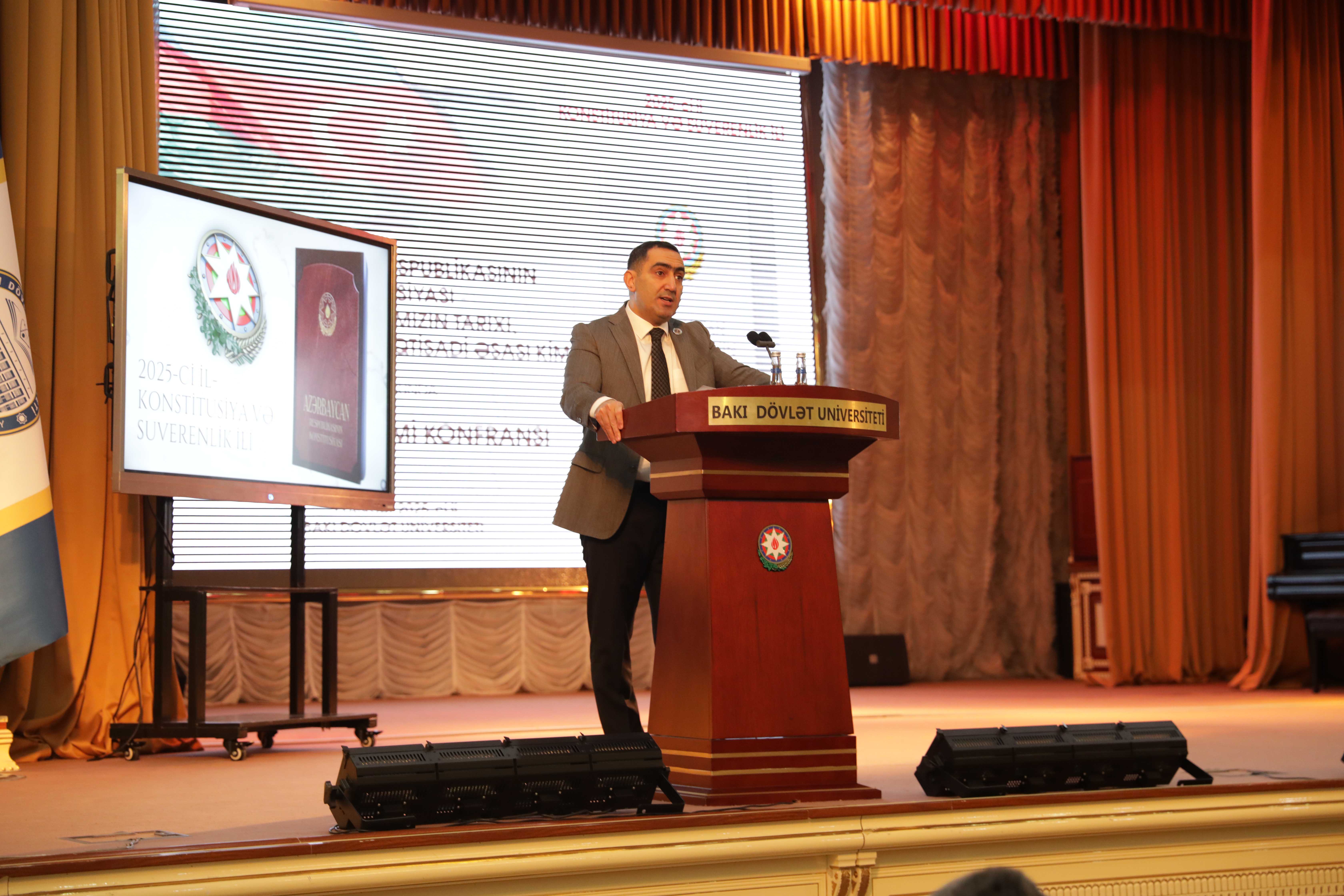 Açılış mərasimində çıxış edən BDU rektoru Elçin Babayev bildirib ki, Azərbaycan Respublikasının Prezidenti cənab İlham Əliyevin 2024-cü il 28 dekabr tarixli Sərəncamı ilə 2025-ci il ölkəmizdə “Konstitusiya və Suverenlik İli” elan edilib. Bu qərar müasir çağırışlar fonunda dövlətçiliyimizin hüquqi əsaslarının yenidən qiymətləndirilməsi, suverenlik konsepsiyasının daha dərindən öyrənilməsi üçün geniş imkanlar açır. Müstəqil Azərbaycanın Konstitusiyası Ulu Öndər Heydər Əliyevin rəhbərliyi ilə hazırlanıb və 1995-ci il 12 noyabr tarixində ümumxalq səsverməsi ilə qəbul edilib. Bu sənəd təkcə hüquqi mətn deyil, həm də müstəqil Azərbaycan dövlətinin qurulması və möhkəmləndirilməsi yolunda dönüş nöqtəsi olub. Konstitusiyamız insan hüquq və azadlıqlarını ali dəyər kimi təsbit, hakimiyyət bölgüsünü, dövlət quruluşunu və cəmiyyətin əsas prinsiplərini müəyyən edir. XXI əsrin reallıqları suverenlik məfhumuna yeni məzmun gətirib. Bu gün suverenlik siyasi sərhədlərlə yanaşı, iqtisadi, texnoloji və elmi suverenlik, infomasiya və kiberməkanda suverenlik, mədəni suverenlik və identiklik kimi sahələri də özündə birləşdiriir. Azərbaycan son illərdə məhz bu istiqamətlər üzrə öz suverenliyini daha da gücləndirib. Qarabağın və Şərqi Zəngəzurun işğaldan azad edilməsi isə bu prosesin ən mühüm tarixi nəticəsi oldu. 44 günlük Vətən müharibəsində əldə olunan Zəfər və 2023-cü ildə heç bir gün belə çəkməyən lokal antiterror tədbirləri ilə Azərbaycan dövlətinin ərazi bütövlüyü və konstitusion hakimiyyəti tam şəkildə bərpa olundu. Ölkəmizin hər bir qarışında Azərbaycan Respublikasının Konstitusiyasının tətbiqi təmin olundu.