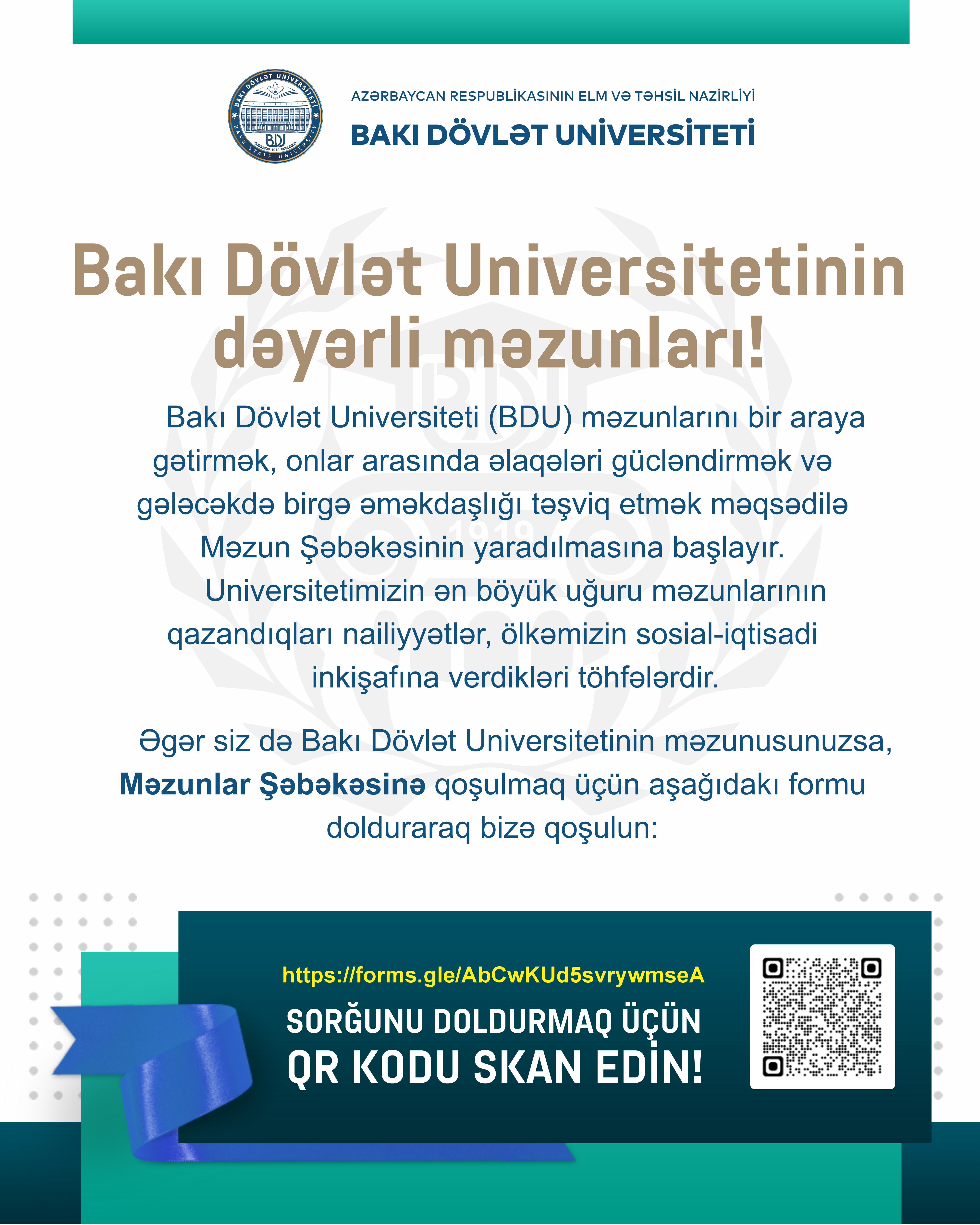 BDU məzunlarını qeydiyyatdan keçməklə Məzunlar Şəbəkəsinə qoşulmağa dəvət edirik.