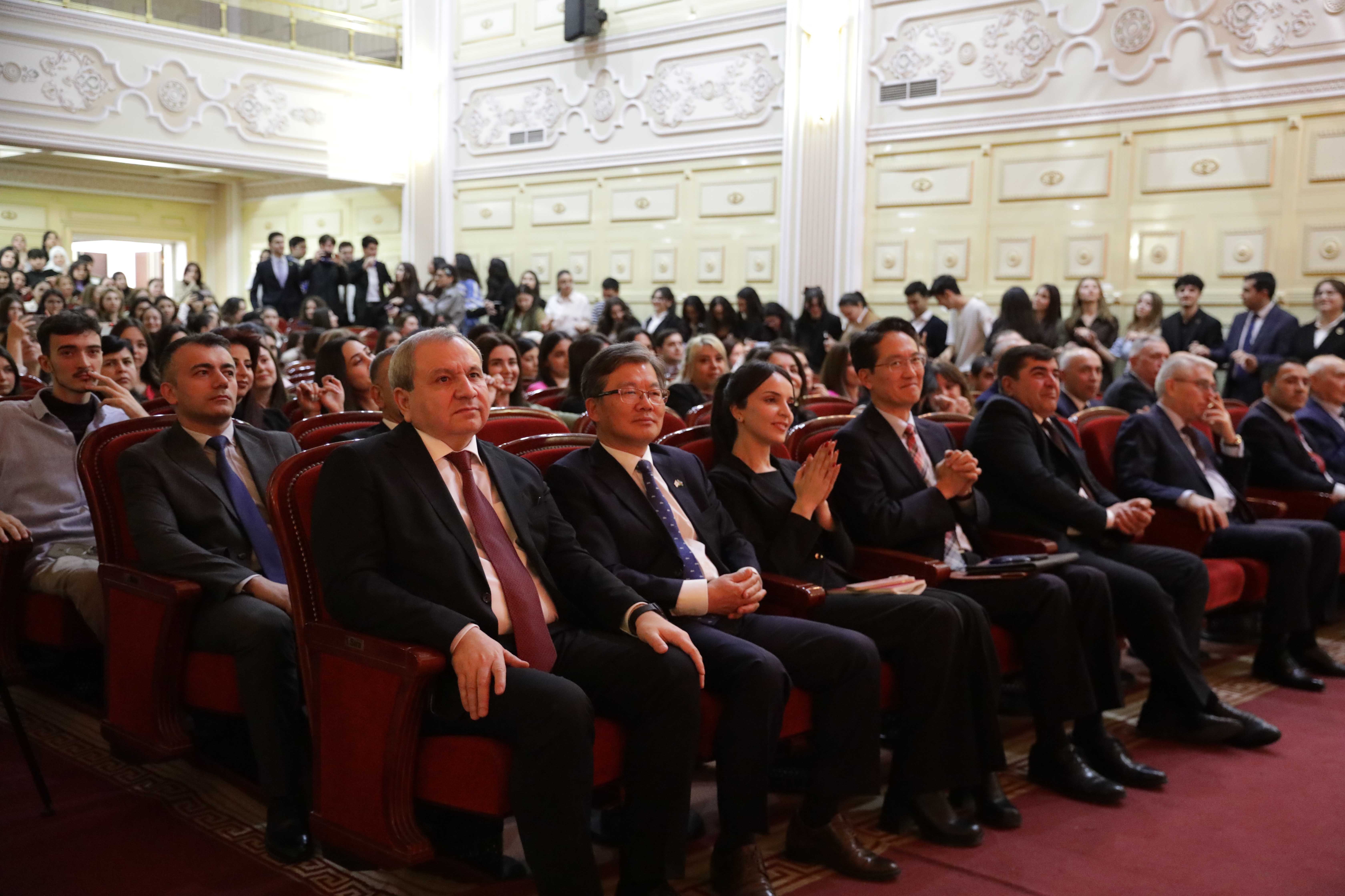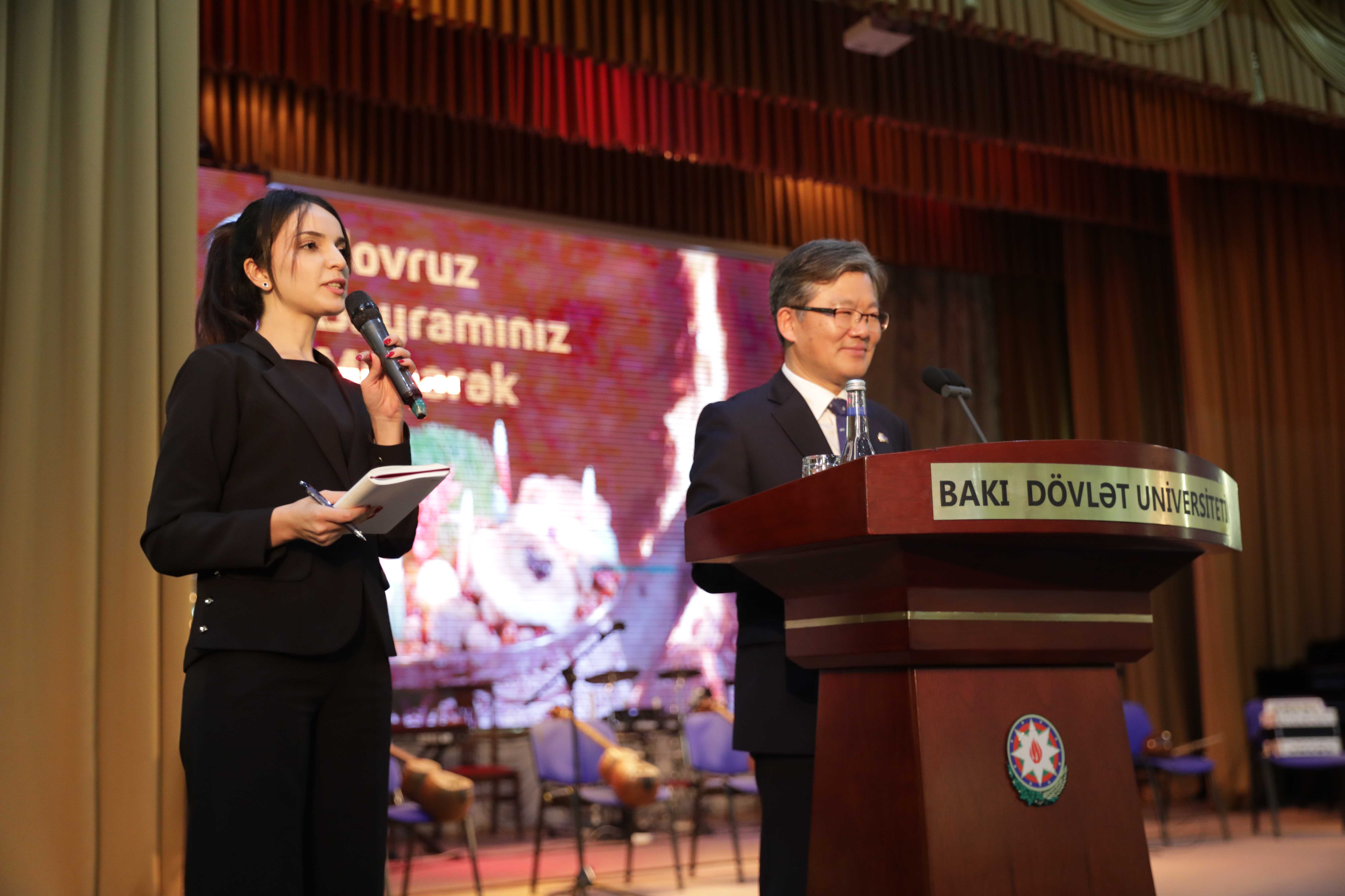 Koreya Respublikasının ölkəmizdəki fövqəladə və səlahiyyətli səfiri Kang Kymgu Azərbaycanın ən gözəl bayramlarından birini BDU tələbələri ilə qeyd etməkdən sevinc duyduğunu bildirib. Səfir qeyd edib ki, Novruz Azərbaycan mədəniyyətini, ənənələrini təmsil edən bir bayramdır: “Bu dövrdə dünya çox sürətlə dəyişir. Dəyişən dünyada belə ənənələri yaşadan gəncləri görmək çox xoşdur. Bu, sizin qəlbinizdə azərbaycançılıq hisslərini daha da gücləndirəcək. Azərbaycanda həm müxtəliflik hökm sürür, həm də ənənələrə güclü bağlılıq var. Bu baxımdan Azərbaycanla Koreya oxşardırlar. Sizə Azərbaycan-Koreya əlaqələrini daha da inkişaf etdirməyi, sağlam, xoşbəxt olmağı, ölkənizin inkişafına töhfə verməyinizi arzulayıram”.