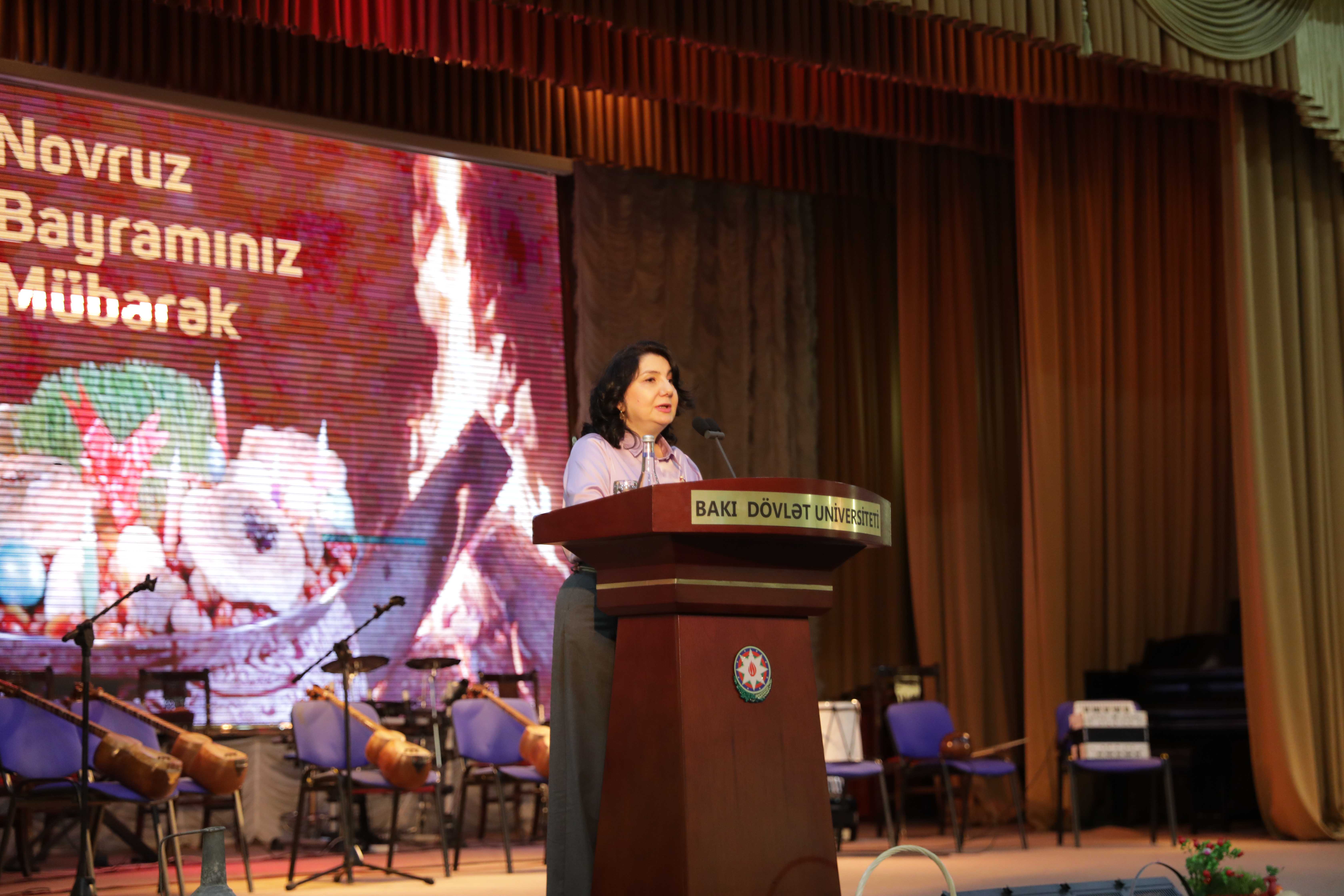 BDU-nun Filologiya fakültəsinin dosenti Kəmalə İslamzadə çıxışında Novruzun tarixi, adət-ənənələri, türk xalqlarının etnoqrafiyasında, mifik dünyagörüşündə yeri haqqında geniş məlumat verib, bu bayramın milli-mənəvi dəyərlər sistemimizdə özünəməxsus rola malik olduğunu qeyd edib.