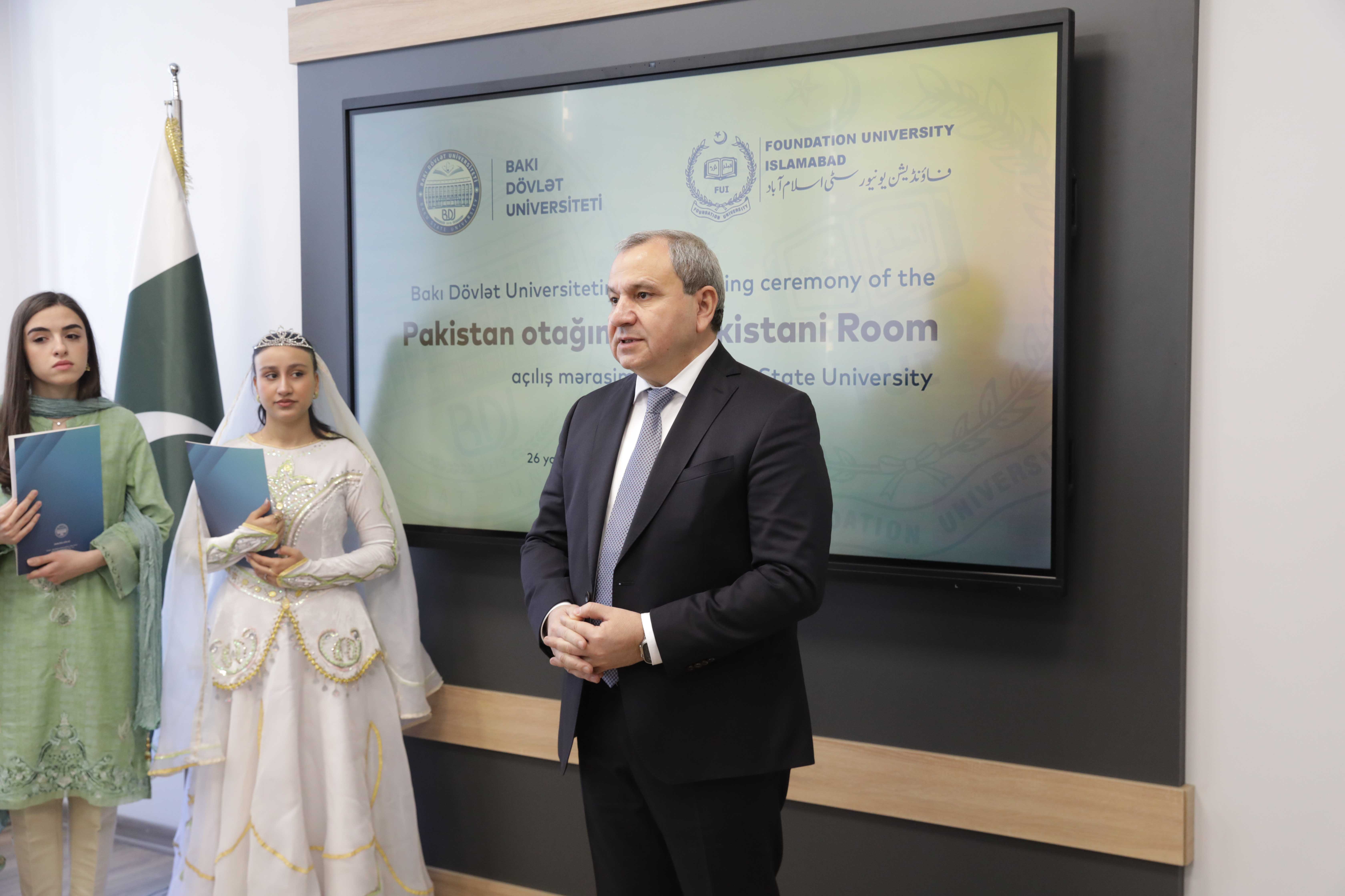 Mərasimdə çıxış edən BDU-nun rektoru Elçin Babayev Azərbaycan və Pakistan arasında dostluq və qardaşlıq münasibətlərinin yüksək səviyyədə inkişaf etdiyini bildirib. Qeyd edib ki, bu əlaqələrin daha da dərinləşməsində elm, təhsil, mədəniyyət sahələrində əməkdaşlıq da böyük rol oynayır. BDU-nun beynəlxalq əlaqələrində Pakistanın ali təhsil və tədqiqat müəssisələri ilə əməkdaşlıq önəmli yer tutur. BDU-nun Şərqşünaslıq fakültəsində 2001-i ildən Urdu dili şöbəsi fəaliyyətə başlayıb. Hazırda Orta Şərq dilləri və ədəbiyyatı kafedrasında urdu dili, urdu ədəbiyyatı istiqaməti üzrə tədris aparılır. BDU və İslamabad Fond Universiteti arasında əməkdaşlıq memorandumu uğurla davam edir və elmi və mədəni əlaqələr daha da möhkəmləndirilir. Rektor “Pakistan otağı”nın açılışının da iki dost ölkə arasında əlaqələrin inkişafına, urdu dilinin tədrisinə mühüm töhfə verəcəyinə əminliyini bildirib.