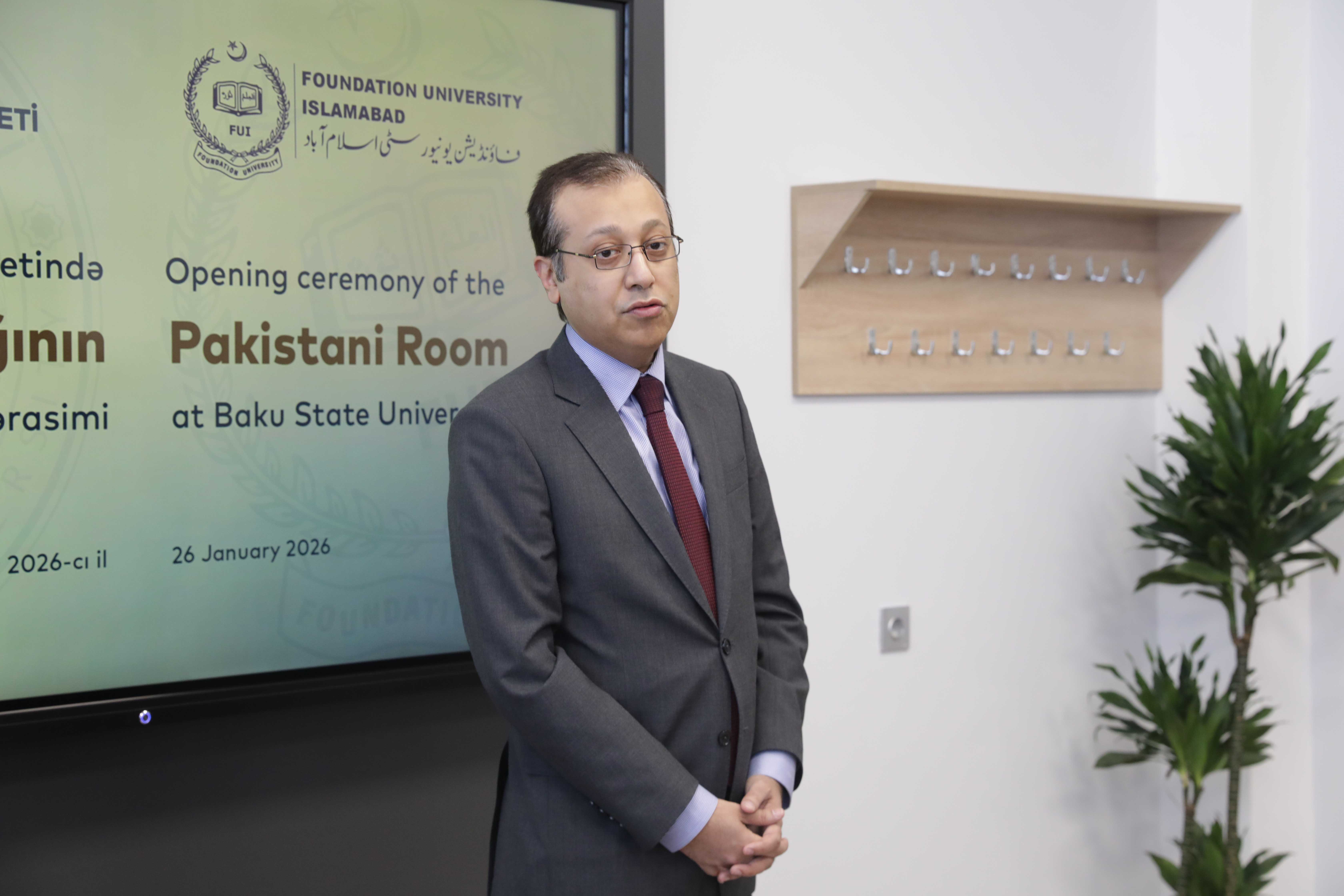 Pakistan İslam Respublikasının ölkəmizdəki fövqəladə və səlahiyyətli səfiri Qasım Mohiuddin çıxışında Azərbaycan və Pakistan arasında münasibətlərin tarixi köklərə, qarşılıqlı etimada və ortaq dəyərlərə əsaslandığını vurğulayıb. O, xüsusilə ali təhsil müəssisələri arasında qurulan əməkdaşlığın xalqlarımızın bir-birini daha yaxından tanımasında mühüm rol oynadığını qeyd edib. Səfir BDU-da urdu dilinin tədrisini və “Pakistan otağı”nın yaradılmasını mədəni və akademik mübadilənin institusional təzahürü kimi dəyərləndirərək, Pakistan tərəfinin bu cür təşəbbüsləri daim dəstəklədiyini bildirib.