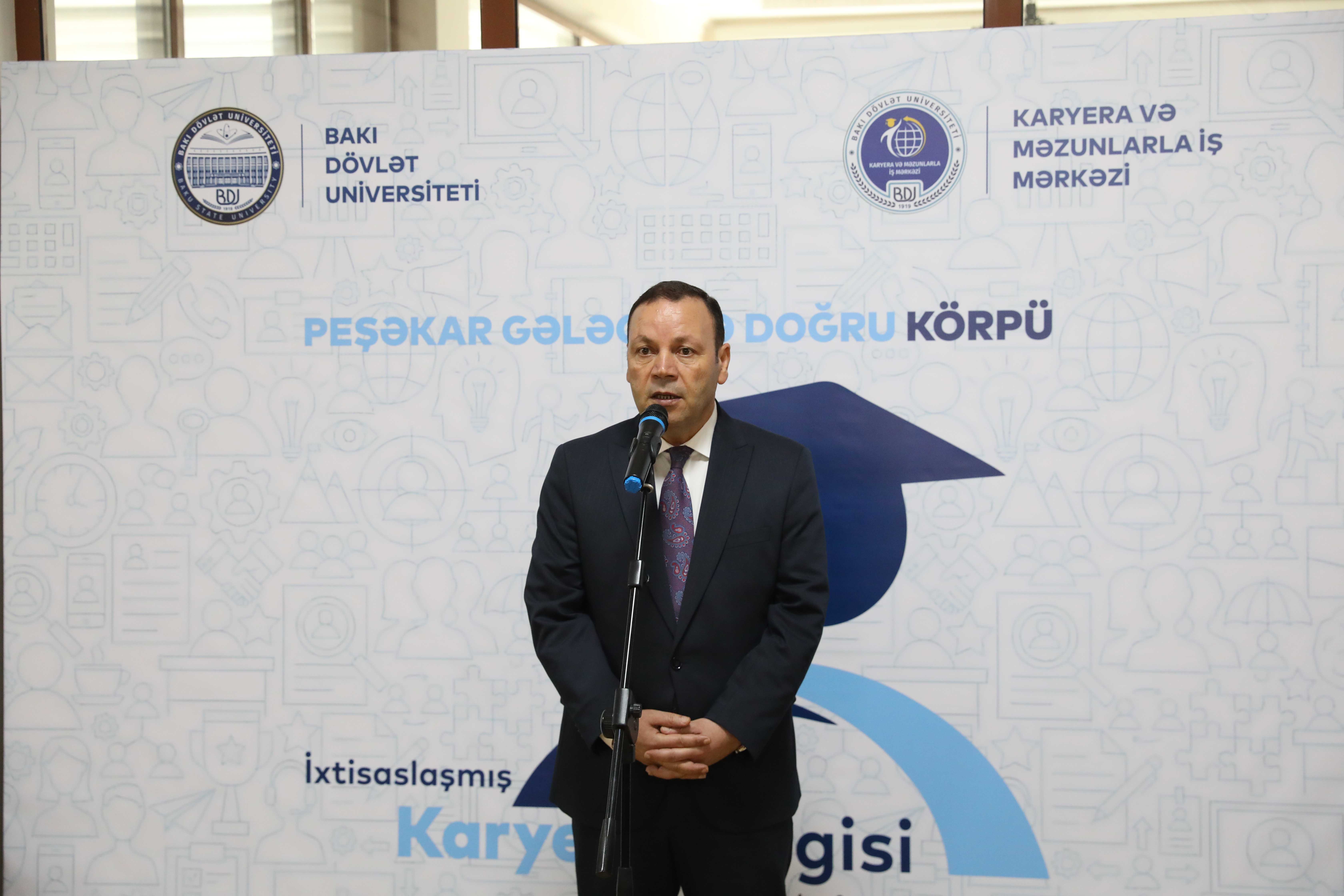Sərginin açılış mərasimində çıxış edən BDU-nun sosial məsələlər, tələbələrlə iş və ictimaiyyətlə əlaqələr üzrə prorektoru Əliş Ağamirzəyev bildirib ki, hər bir universitetin ən önəmli reytinq göstəricilərindən biri də onun məzunlarının əmək bazarında özlərinə layiqli yer tapmasıdır. BDU ölkənin aparıcı sənaye-istehsalat müəssisələri ilə sıx əməkdaşlıq edir. Bu, həm məzunların işlə təmin olunmasında, həm də əmək bazarının tələblərinin tədris prosesinə inteqrasiyasında önəmli rol oynayır: “BDU hər il 100-dən artıq şirkətin iştirakı ilə Karyera festivalları keçirir. Bu festivallarda müxtəlif vakant yerlər və təcrübə proqramları tələbələrə təqdim olunur. Bu tədris ilindən isə ayrı-ayrı ixtisaslar üzrə ixtisaslaşmış Karyera sərgilərinin keçirilməsi qərara alınıb. Bugünkü sərgidə ölkənin ən nüfuzlu 12 bankı iqtisadiyyat istiqamətli ixtisaslar üzrə təcrübə proqramları və vakant yerləri tələbə və məzunlara təqdim edirlər. Bundan sonra BDU-da hər ay ölkənin ən tanınmış işəgötürənlərinin iştirakı ilə ixtisaslaşmış Karyera sərgiləri keçiriləcək”.