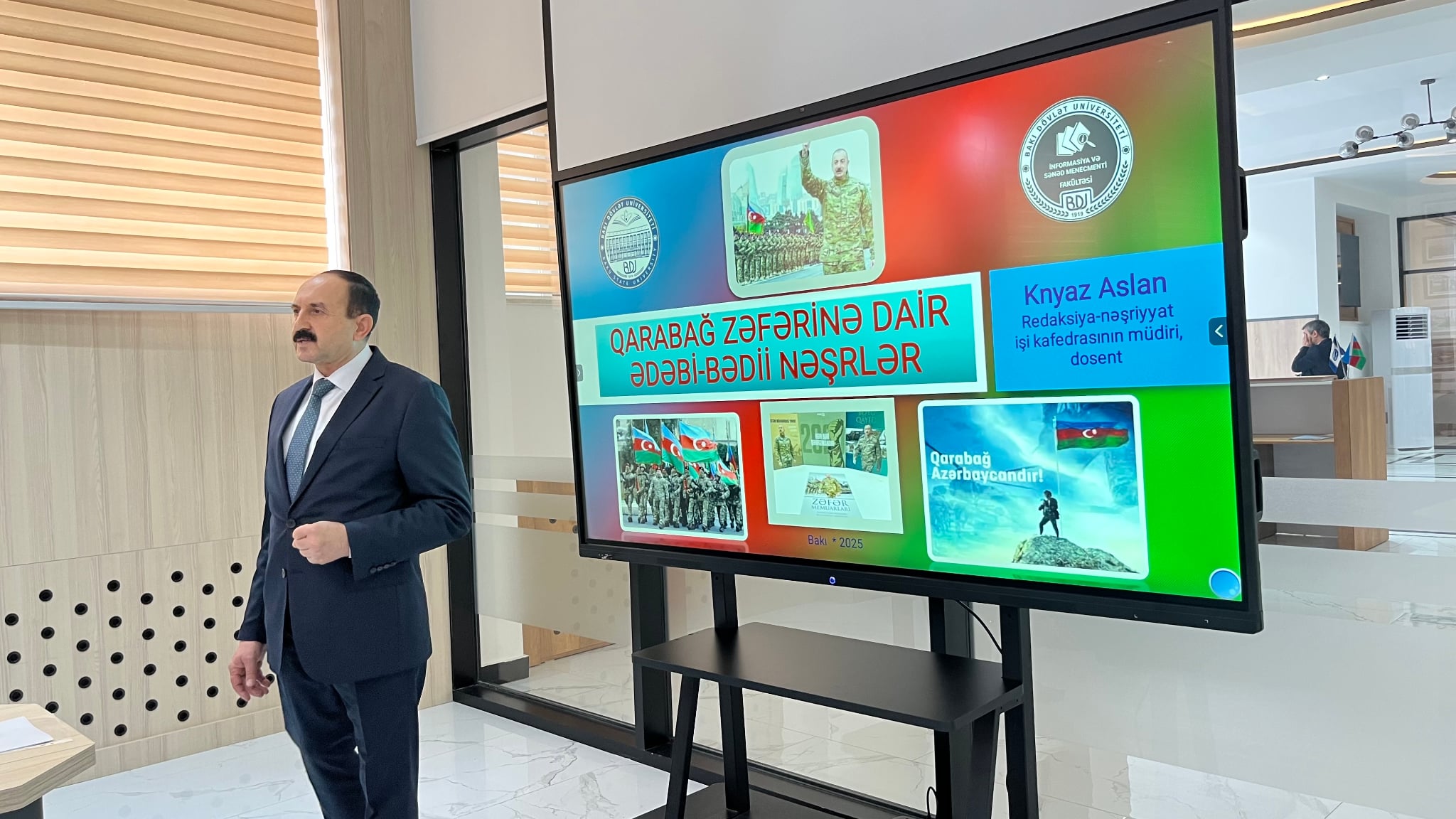 Bakı Dövlət Universitetinin (BDU) İnformasiya və sənəd menecmenti fakültəsində 8 Noyabr – Zəfər Günü münasibətilə “Qarabağ Zəfərinə dair ədəbi-bədii nəşrlər” mövzusunda elmi seminar keçirilib. Elmi seminarda BDU-nun Redaksiya-nəşriyyat işi kafedrasının müdiri, dosent, I Qarabağ müharibəsinin veteranı Knyaz Aslan mövzu üzrə məruzə edib.