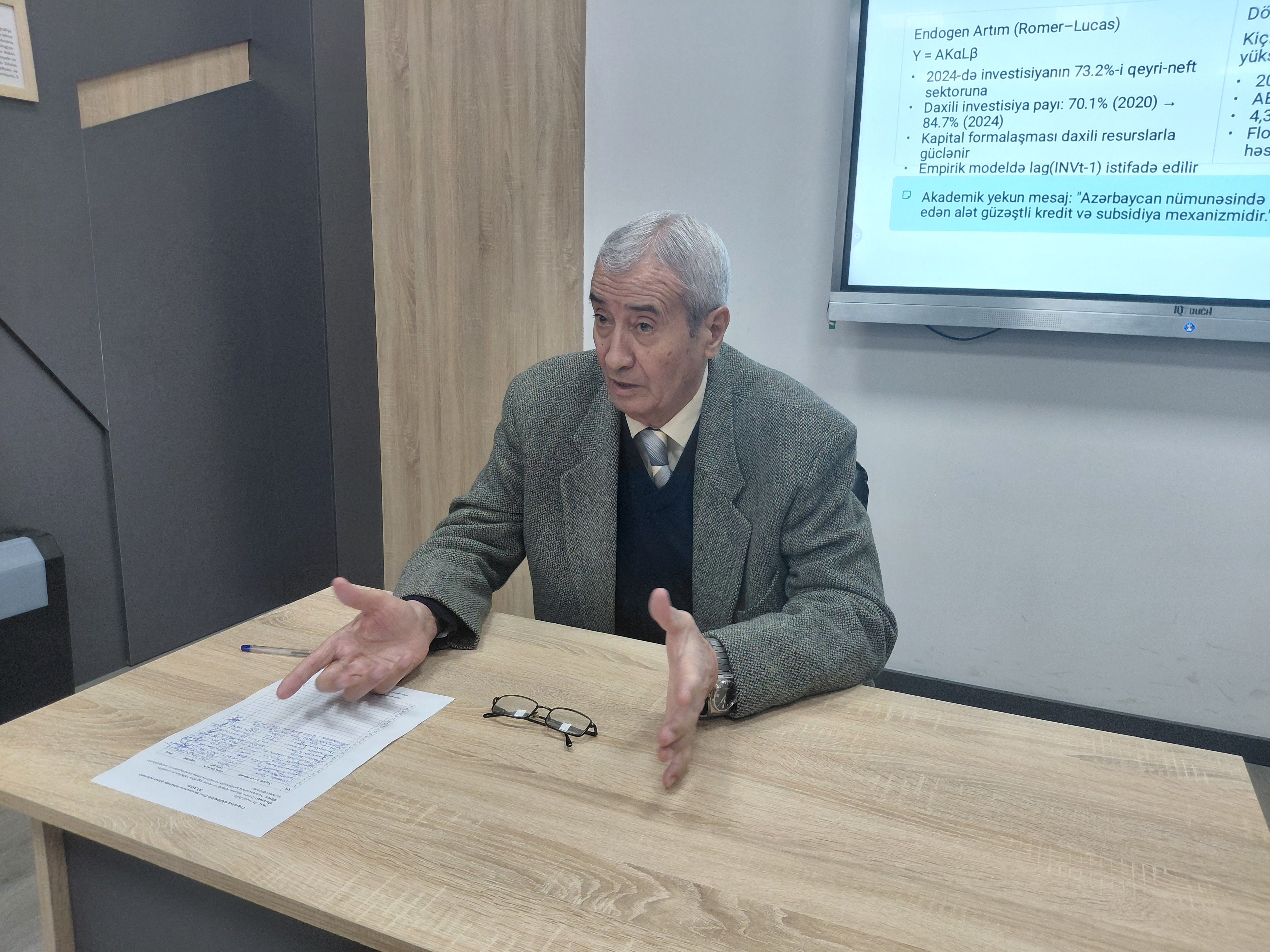 Daha sonra İqtisadi və sosial coğrafiya kafedrasının müəllimi Nuranə Əliyevanın mövzu ilə bağlı məruzəsi dinlənilib. O, müasir dövrdə dövlət investisiyalarının sahibkarlığın inkişafına təsiri barədə geniş məlumat verib. Tədqiqat çərçivəsində müxtəlif sahibkarlıq subyektlərinə dövlət investisiyalarının qoyuluşunun onların inkişafına müsbət təsir göstərməsi və bunun elmi üsullarla müəyyən edilməsi məqsədi ilə reqressiya, korrelyasiya və digər kəmiyyət metodlarından istifadə olunduğu qeyd olunub. Kiçik və orta sahibkarlığın inkişafının regional xüsusiyyətlərinin təhlil olunduğu, eləcə də investisiyaların səmərəliliyinə təsir edən daxili və xarici amillərin qiymətləndirildiyi diqqətə çatdırılıb, sahibkarlıq mühitində dövlətin investisiya yönümlü fəaliyyətinin əhəmiyyəti, bu investisiyaların iqtisadi artıma təsiri və onların səmərəliliyinin qiymətləndirilməsi metodları izah edilib.