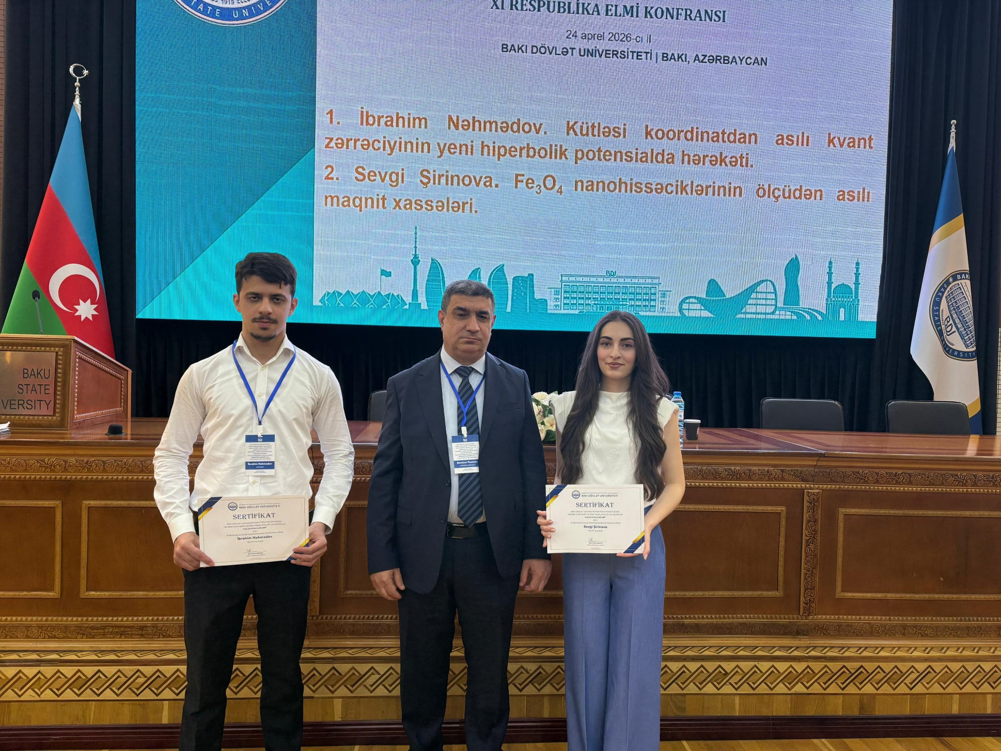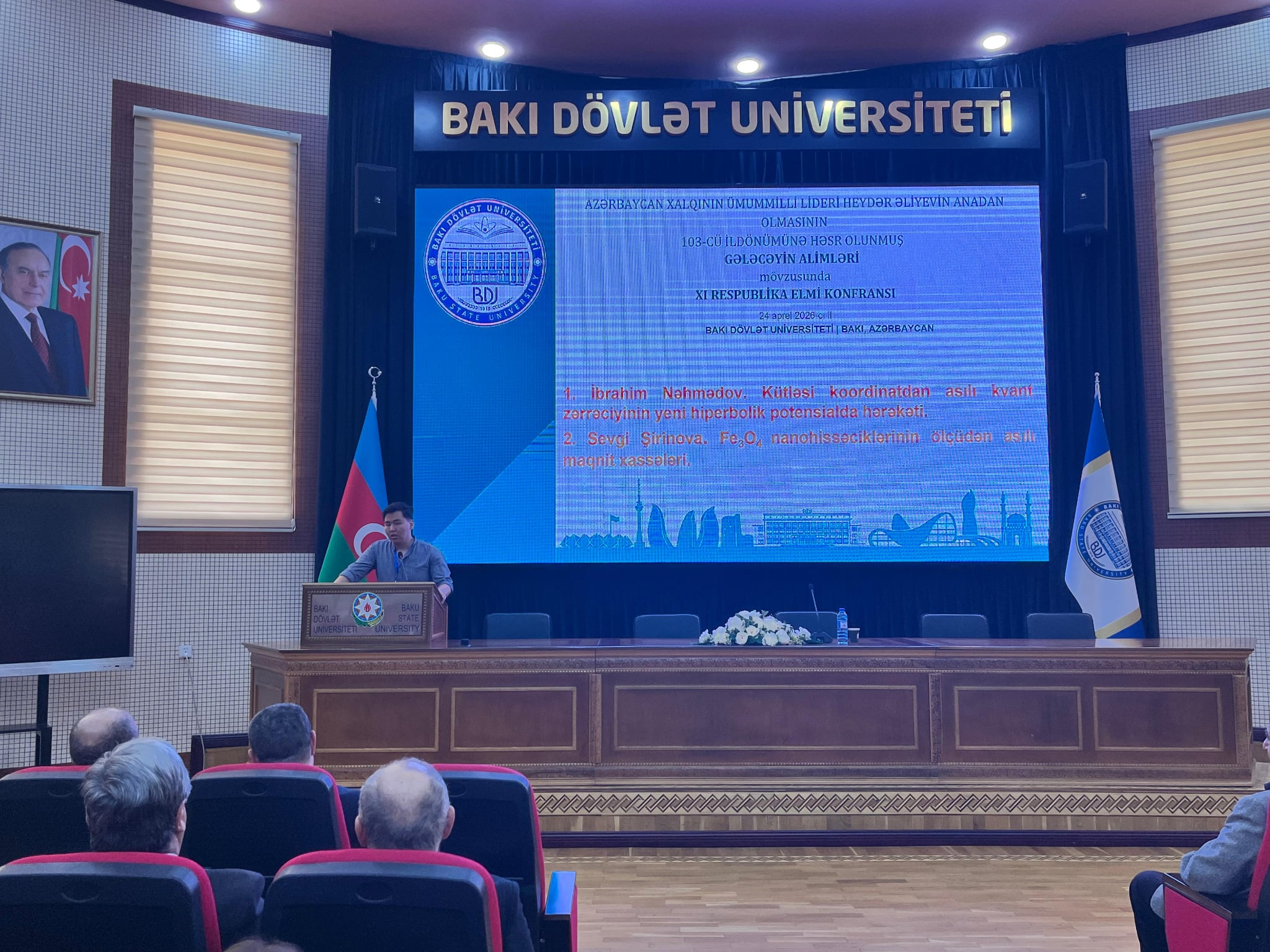 Konfrans plenar iclasla işini davam etdirib. İclasa Nəzəri fizika kafedrasının müdiri Məmməd Rəcəbov sədrlik edib. II kurs magistrantı İbrahim Nəhmədov “Kütləsi koordinatdan asılı kvant zərrəciyinin yeni hiperbolik potensialda hərəkəti”, I kurs tələbəsi Sevgi Şirinova “Fe₃O₄ nanohissəciklərinin ölçüdən asılı maqnit xassələri” mövzusunda təqdimatlar ediblər.