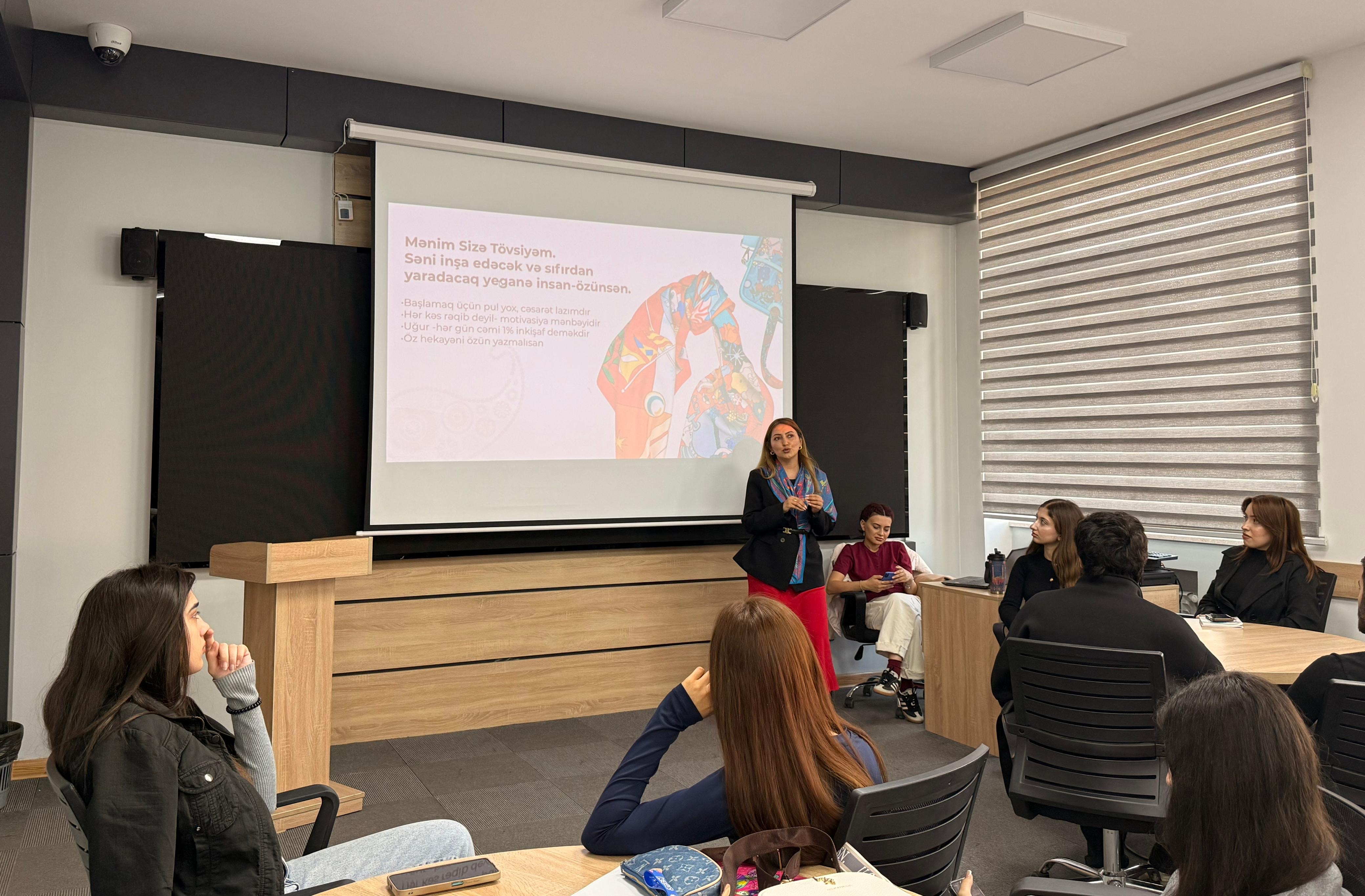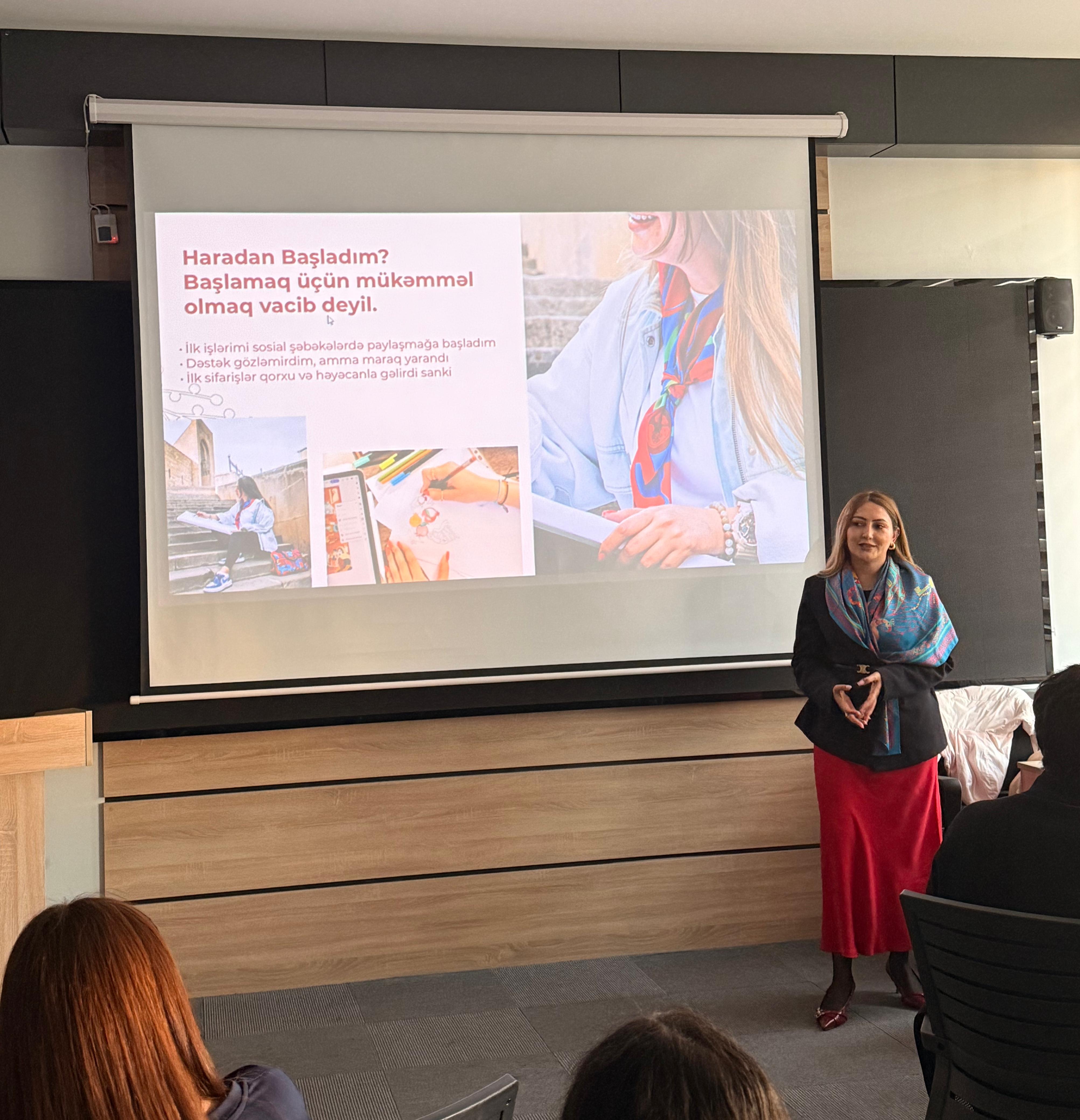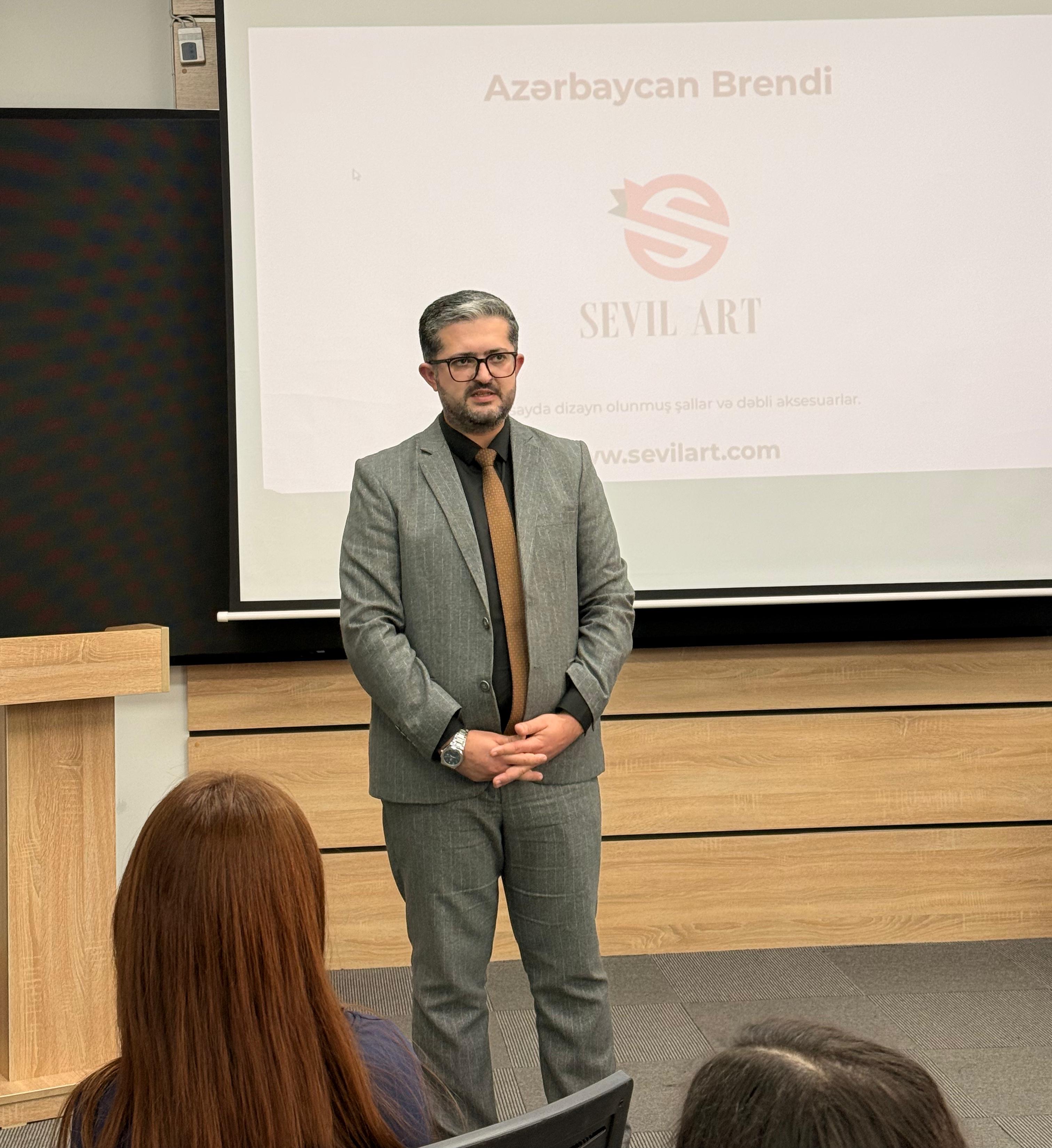 Təlimçi Sevil Əhmədova isə şəxsi yaradıcılıq yolundan, “Sevil Art” brendinin formalaşma mərhələlərindən söz açıb. O, qarşılaşdığı çətinlikləri, qlobal bazarda tanınmaq üçün atdığı addımları, beynəlxalq sərgilərdə iştirakın əhəmiyyətini və məhsulların xaricdə təqdimat strategiyalarını tələbələrlə bölüşüb. Azərbaycan brendinin dünyaya çıxarılması istiqamətində praktiki nümunələr təqdim edib.