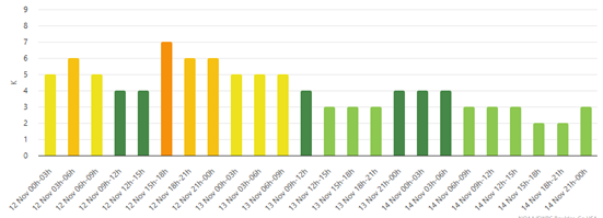 9-10 noyabr tarixlərində baş verən tac kütlə atılması nəticəsində noyabrın 12-də yüksək coğrafi enliklərdə G2-G4 səviyyəsində maqnit qasırğası proqnozlaşdırılır. Günün yarısında bu, artaraq G3-G4 (güclü) qasırğa səviyəsinə yüksələcək. Tac kütlə atılması səbəbindən noyabrın 13-də qasırğanın G1-G3 səviyyədə qalacağı proqnozlaşdırılır. 14 noyabr tarixində aktivlik azalacaq.