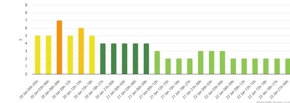 Geomaqnit sahə yanvarın 20-də aktiv (G1-G2 mülayim orta) səviyyədə olacaq. Yanvarın 21-də geomaqnit sahə normallaşacaq, yanvarın 22-dən stasionar hala gələcək. Yanvarın 20-də geomaqnit qasırğasının gücünü göstərən Kp əmsalı 5-7 (G1-G2), sonrakı tarixlərdə 4 və daha aşağı olacaq.