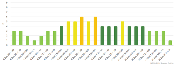 Bakı Dövlət Universitetinin (BDU) Fizika fakültəsinin Astrofizika kafedrasından verilən xəbərə görə, dekabrın 8-də dekabrın 4-də Günəşi tərk edən tac kütlə atılmasının sürüşkən təsiri müşahidə oluna bilər. Dekabrın 9-da baş verəcək təsir isə dekabrın 6-da Günəşi tərk etmiş tac kültə alışmalı ilə bağlı olacaq. Nəticədə geomaqnit aktivliyi göstərən Kp əmsalı orta coğrafi enliklərdə dekabrın 8-də 1-4, dekabrın 9-da nisbətən yüksək olmaqla 5-6 və sonrakı tarixlərdə normal 2-4 intervalında olacaq. Yüksək coğrafi enliklərdə dekabrın 8-də Kp əmsalı 2-4, dekabrın 9-da 5-7, dekabrın 10-da isə 5-6 intervalında olacaq.