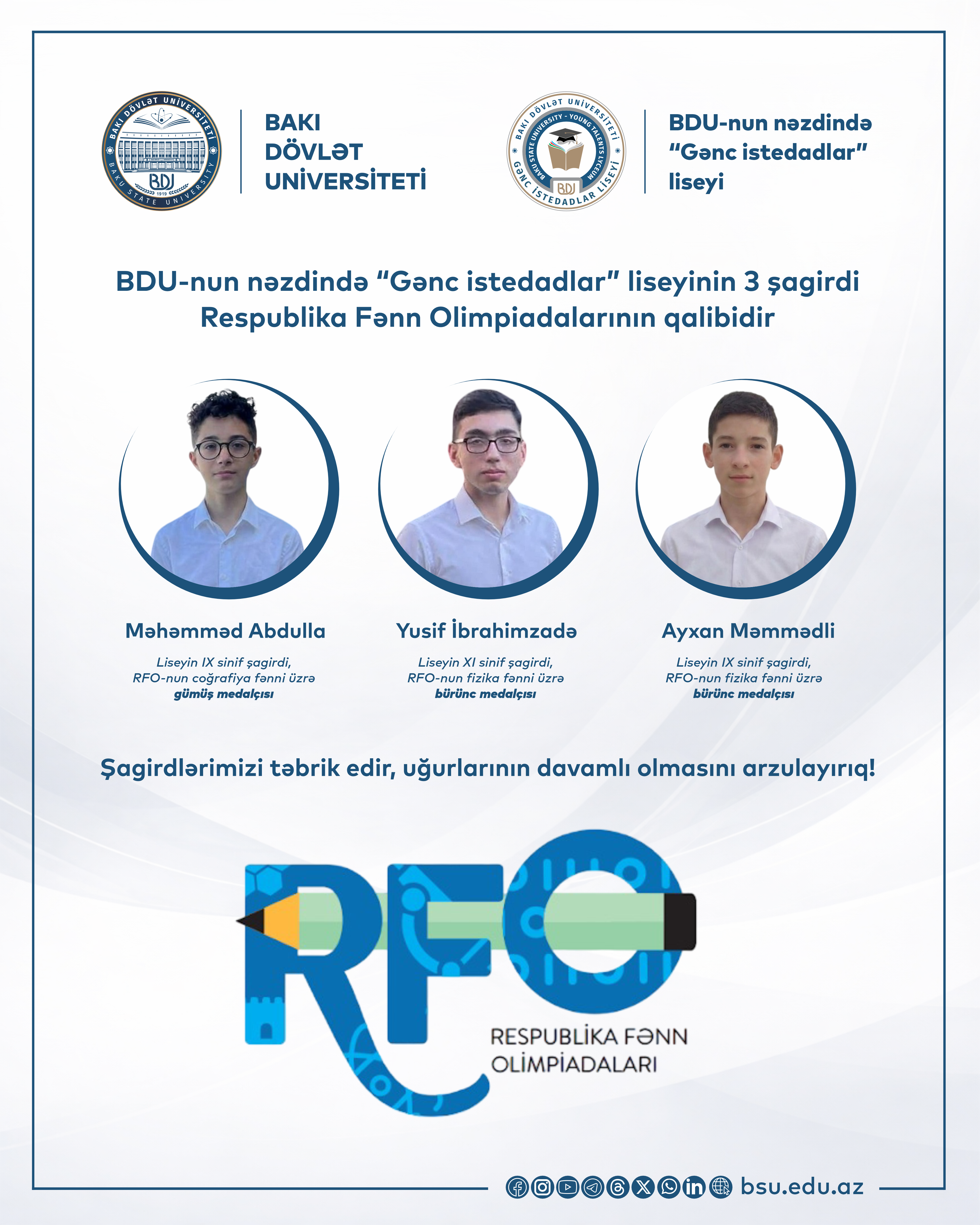 Bakı Dövlət Universitetinin (BDU) nəzdində "Gənc istedadlar” liseyinin 3 şagirdi fizika və coğrafiya fənləri üzrə Respublika Fənn Olimpiadalarında (RFO) böyük uğura imza atıb.