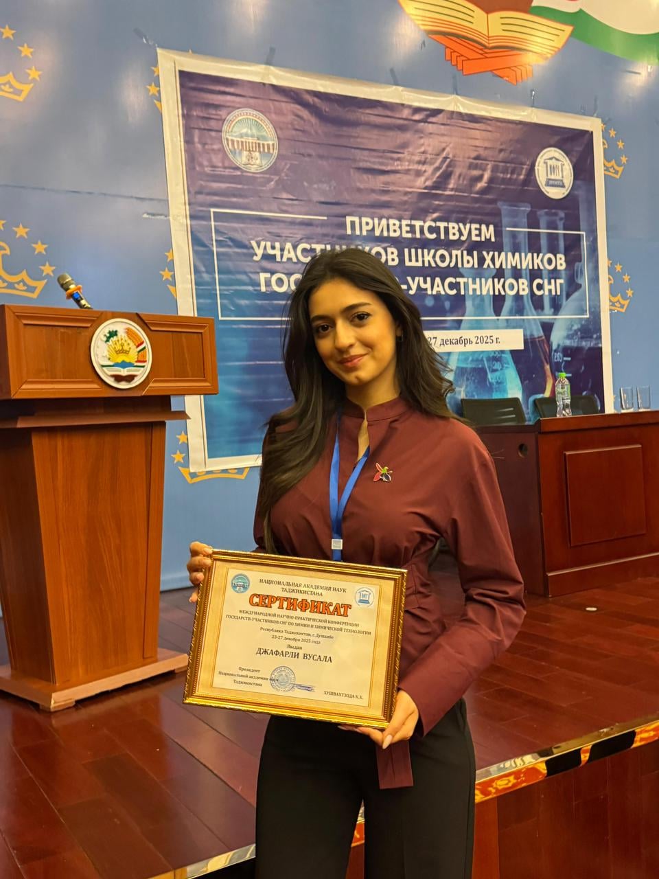 Bakı Dövlət Universitetinin (BDU) SABAH qruplarının “Biologiya müəllimliyi” ixtisasının IV kurs tələbəsi Vüsalə Cəfərli Tacikistanın Düşənbə şəhərində “MDB-yə üzv dövlətlərin Kimyaçılar Məktəbi” layihəsi çərçivəsində təşkil olunmuş beynəlxalq elmi tədbirdə “Nanohissəciklər və canlı sistemlər: faydalar və risklər” mövzusunda təqdimat edib.