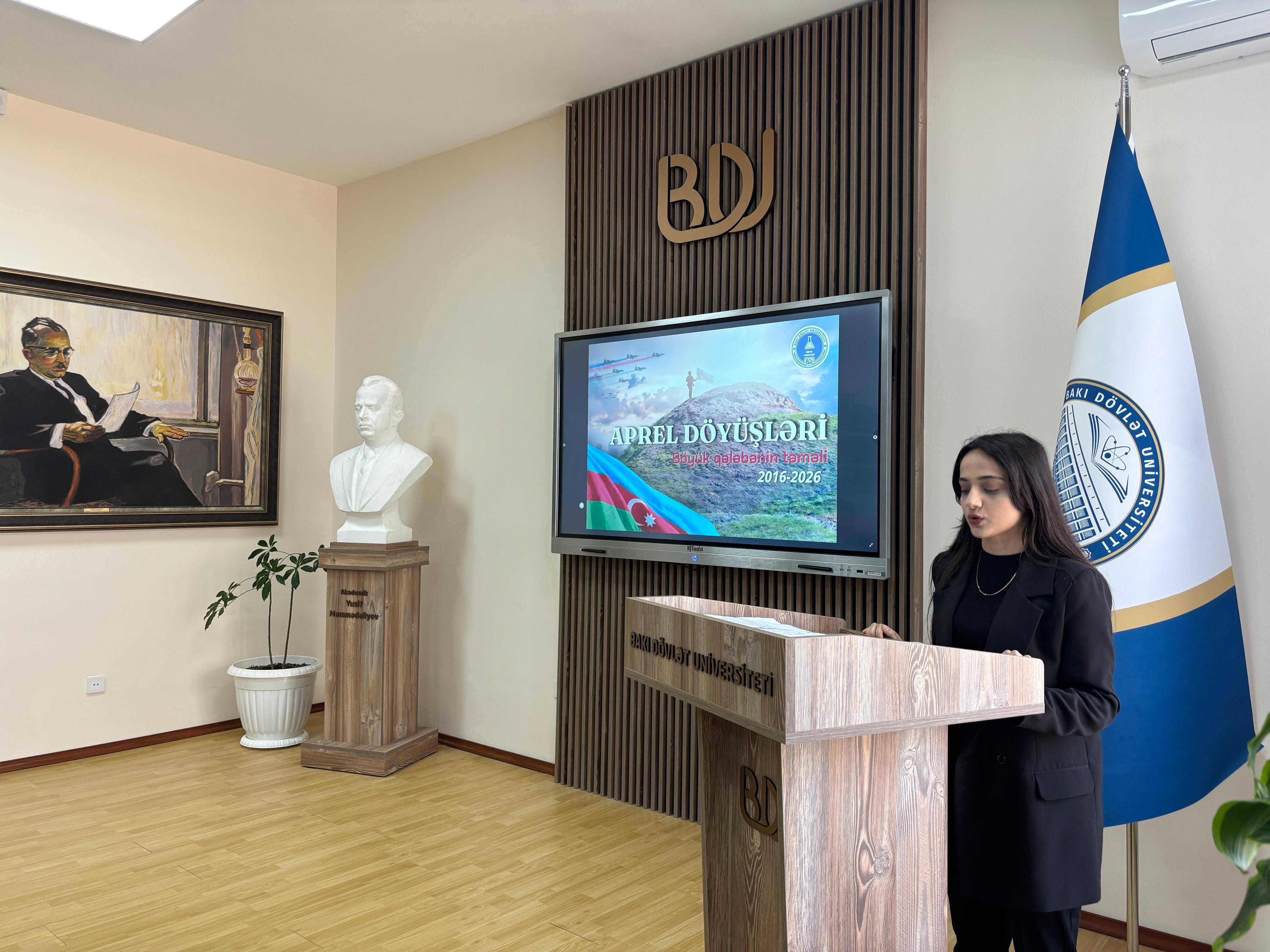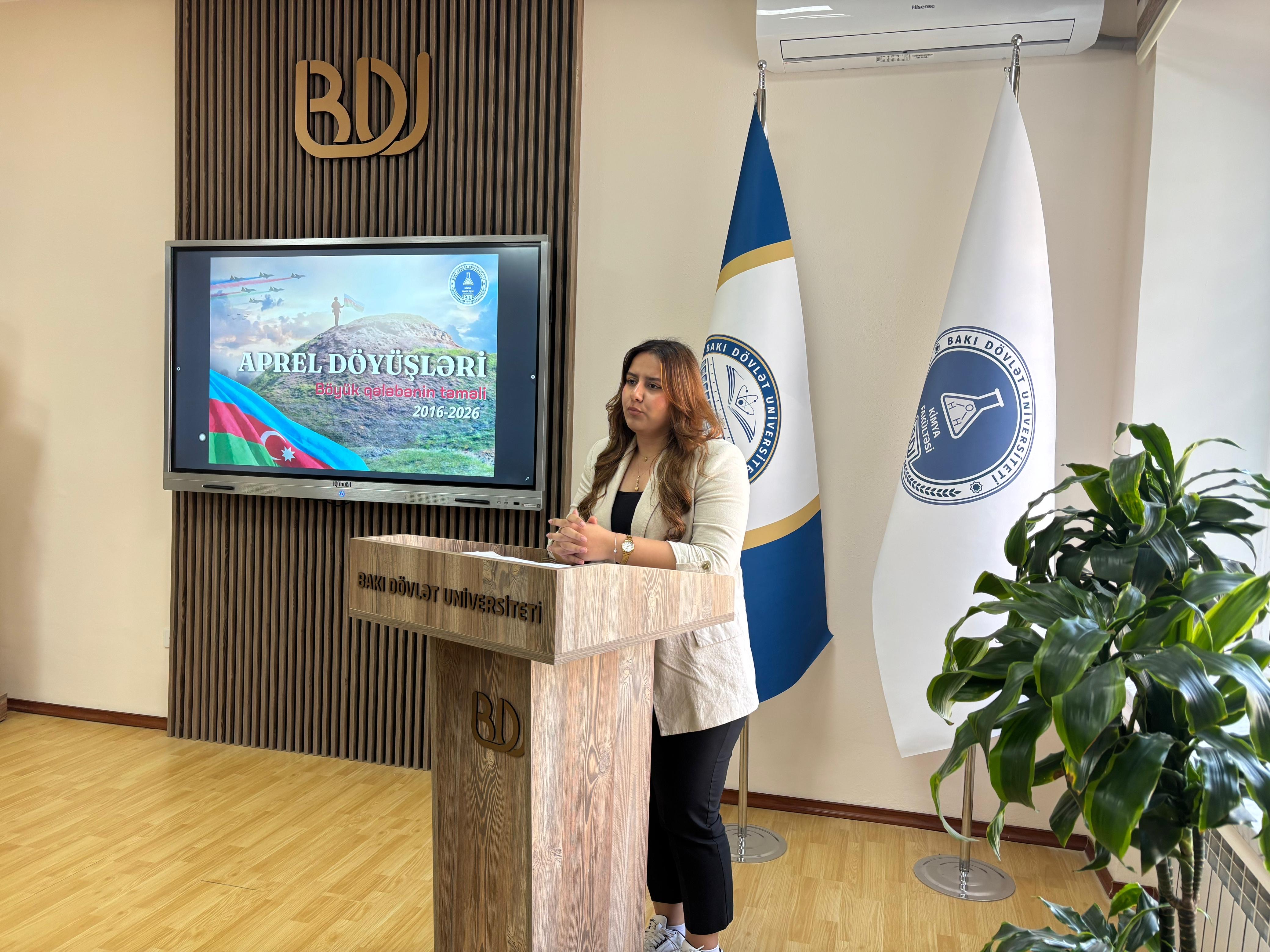 Bakı Dövlət Universitetinin (BDU) Kimya fakültəsinin Tələbə Gənclər Təşkilatının (TGT) təşəbbüsü ilə Aprel döyüşlərinin 10-cu ildönümünə həsr olunmuş “Böyük qələbənin təməli” adlı tədbir keçirilib.