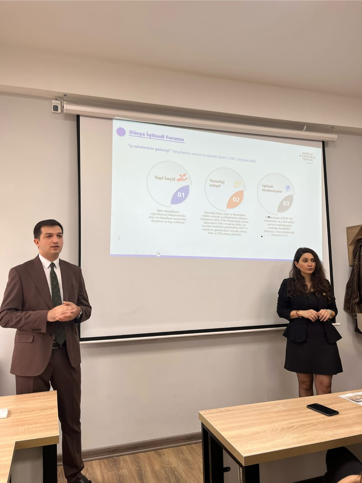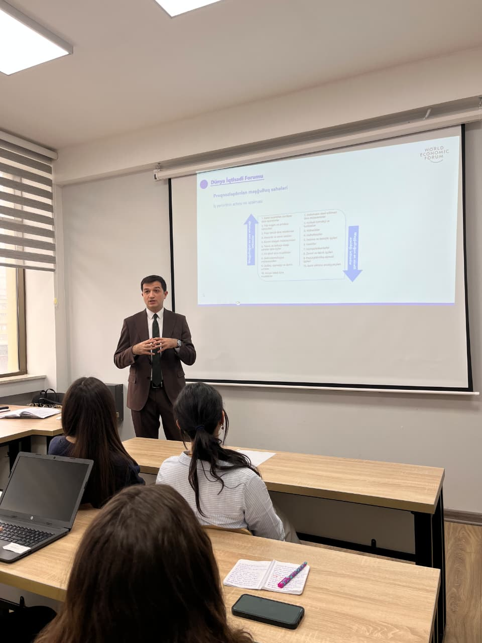 Ustad dərsi zamanı rəqəmsallaşma, süni intellektin tətbiqi, yaşıl iqtisadiyyat və qlobal miqyasda peşə strukturunun yenilənməsi məsələləri müzakirə edilib.