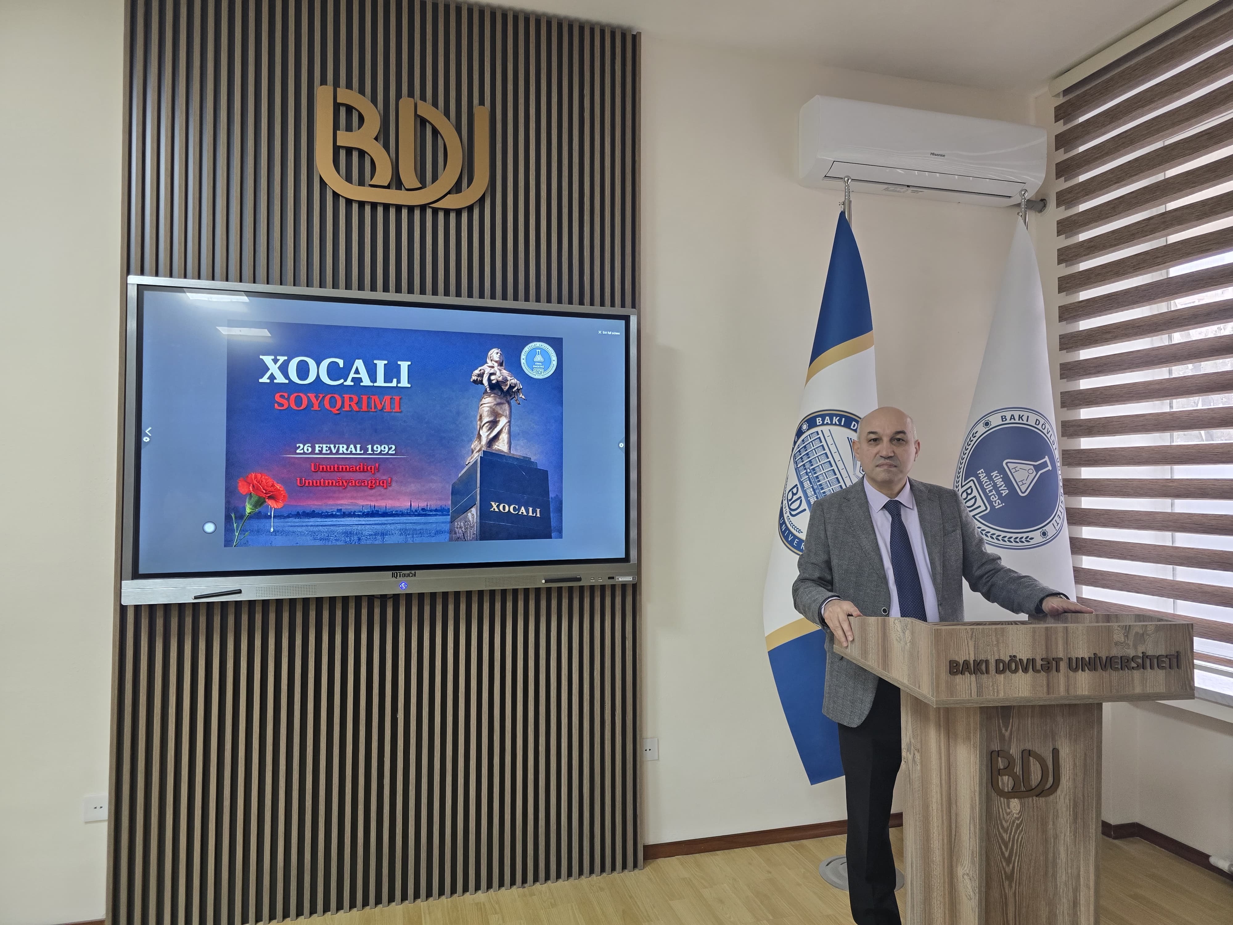 Kimya fakültəsinin sosial məsələlər və tələbələrlə iş üzrə dekan müavini Taleh Qəhrəmanov Xocalı soyqırımının Azərbaycan tarixinin ən faciəli və qanlı səhifələrindən biri olduğunu vurğulayıb. O qeyd edib ki, 1992-ci il fevralın 26-da dinc əhaliyə qarşı törədilən bu qətliam insanlığa qarşı cinayət kimi tarixə düşüb və Xocalı həqiqətlərinin dünya ictimaiyyətinə çatdırılması hər bir azərbaycanlının mənəvi borcudur.