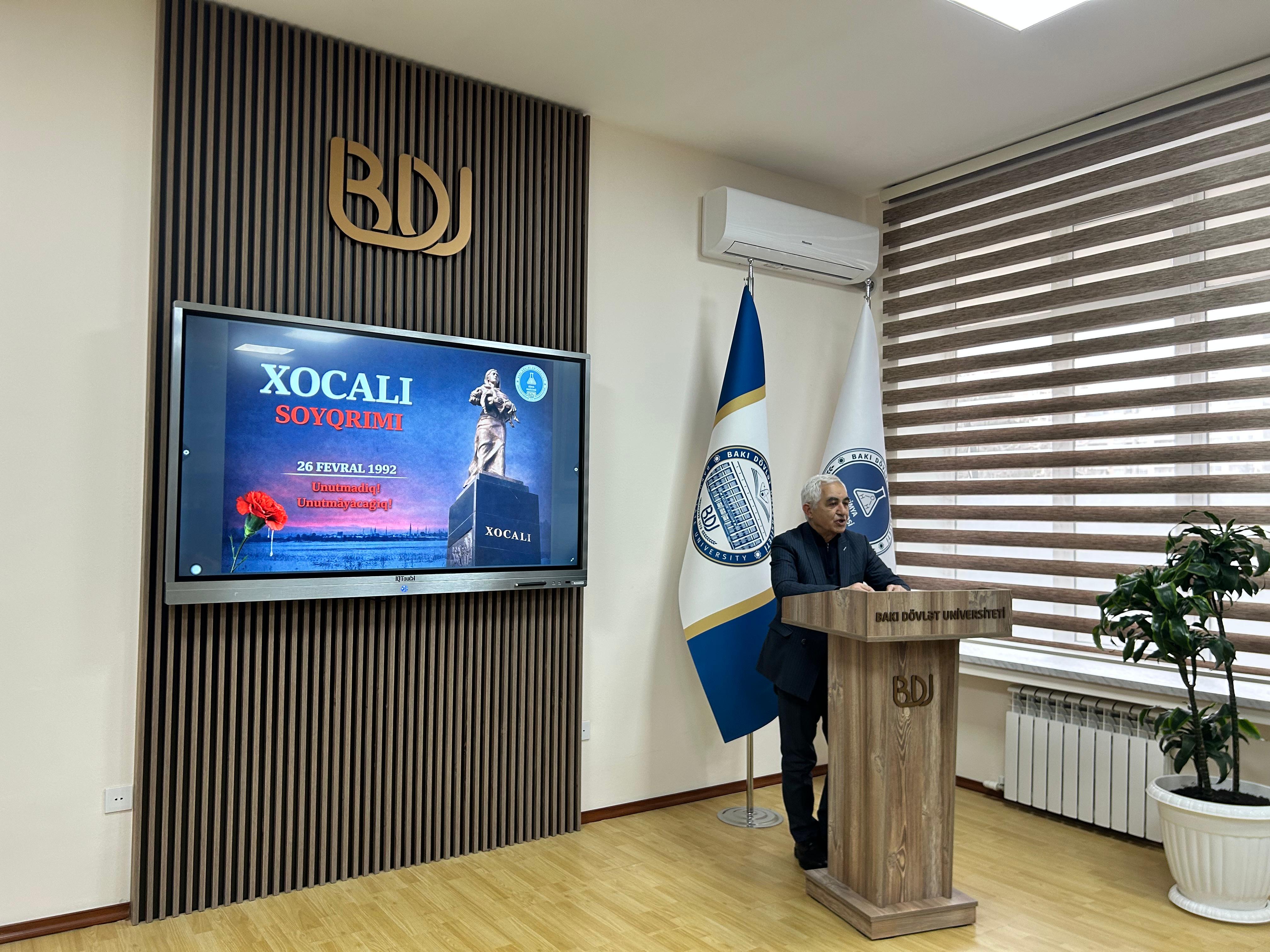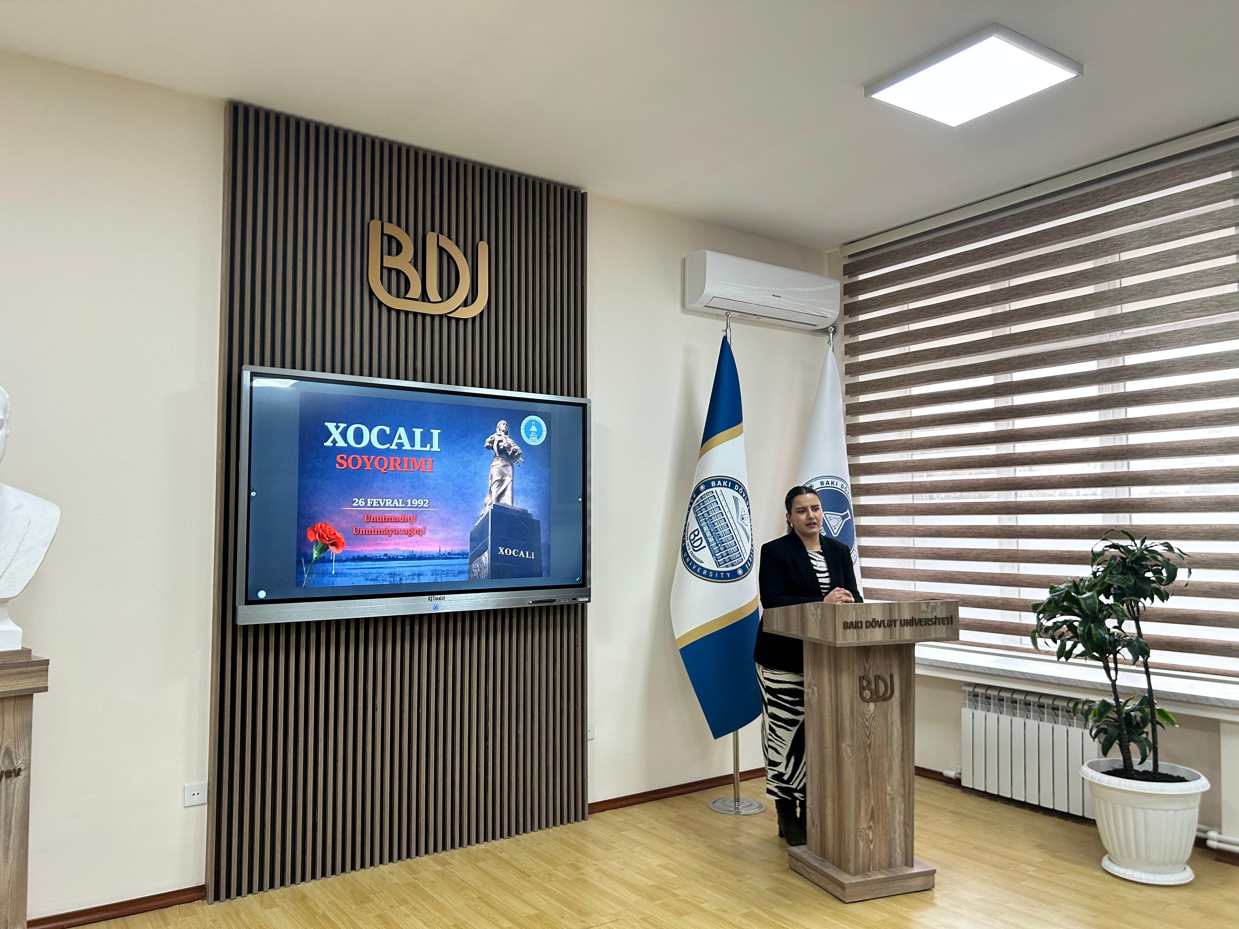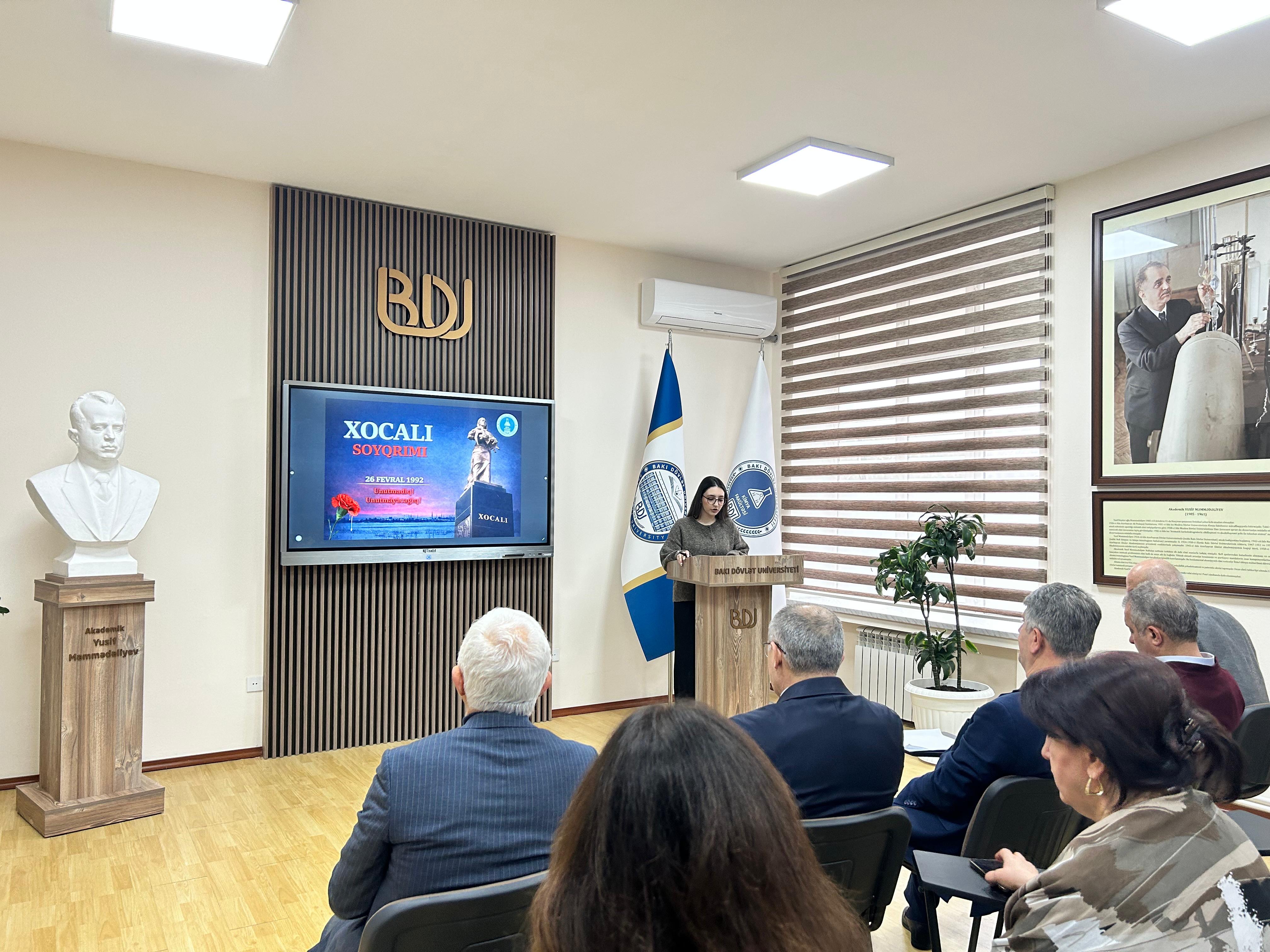 Bakı Dövlət Universitetinin (BDU) Kimya fakültəsində Tələbə Gənclər Təşkilatının (TGT) təşkilatçılığı ilə Xocalı soyqırımının 34-cü ildönümünə həsr olunmuş “Tariximizin qanlı yaddaşı – Xocalıdır” adlı anım tədbiri keçirilib.
