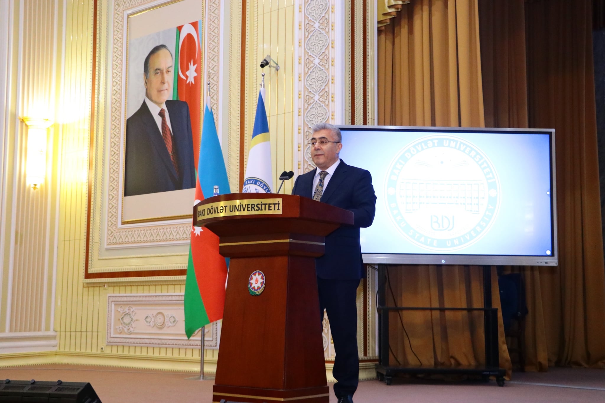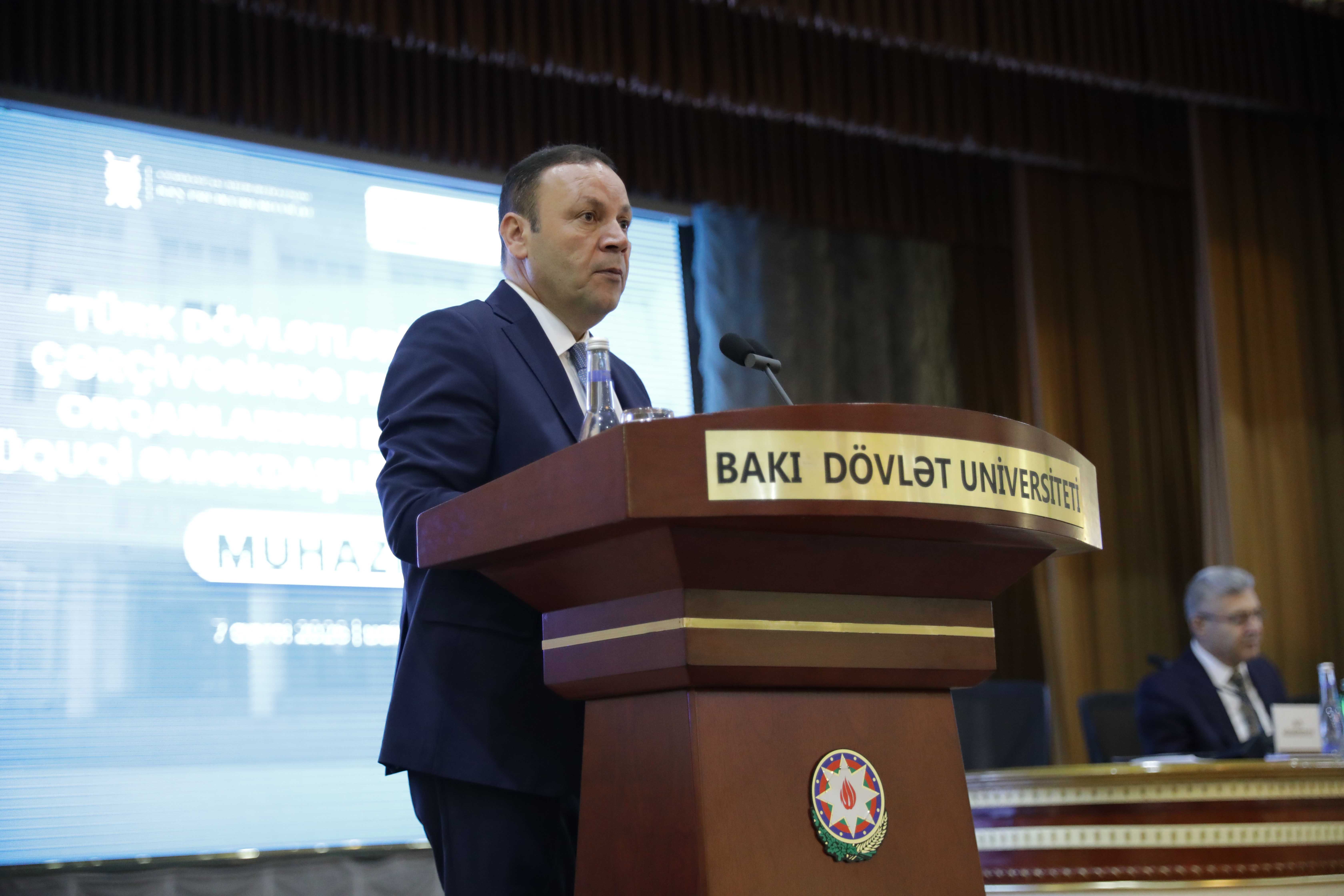 BDU-nun sosial məsələlər, tələbələrlə iş və ictimaiyyətlə əlaqələr üzrə prorektoru Əliş Ağamirzəyev qonaqları salamlayıb, tədbirin mühüm əhəmiyyət daşıdığını qeyd edib. O bildirib ki, Türk Dövlətləri Təşkilatı müasir beynəlxalq münasibətlər sistemində Türk dünyasını birləşdirən mühüm regional platformalardan biridir. Onun əhəmiyyəti ilk növbədə üzv dövlətlər arasında siyasi, iqtisadi və humanitar-mədəni əməkdaşlığın gücləndirilməsində özünü göstərir. Təşkilat türk dövlətlərinə beynəlxalq arenada ortaq mövqe sərgiləmək və bir-birini dəstəkləmək imkanı verir. TDT həm də hüquqi və təhlükəsizlik sahəsində əməkdaşlıq üçün mühüm platformadır. Müasir dövrdə transmilli cinayətkarlıq, kibercinayətlər kimi təhlükələr artıq sərhəd tanımır. Bu isə hüquq-mühafizə və xüsusilə prokurorluq orqanları arasında daha sıx və koordinasiyalı əməkdaşlığı zəruri edir. Əliş Ağamirzəyev gələcəyin hüquqşünasları və dövlət qulluqçuları üçün beynəlxalq hüquqi əməkdaşlıq anlayışını dərindən mənimsəməyin və qlobal hüquqi düşüncəyə sahib olmağın mühüm əhəmiyyət daşıdığını qeyd edib.