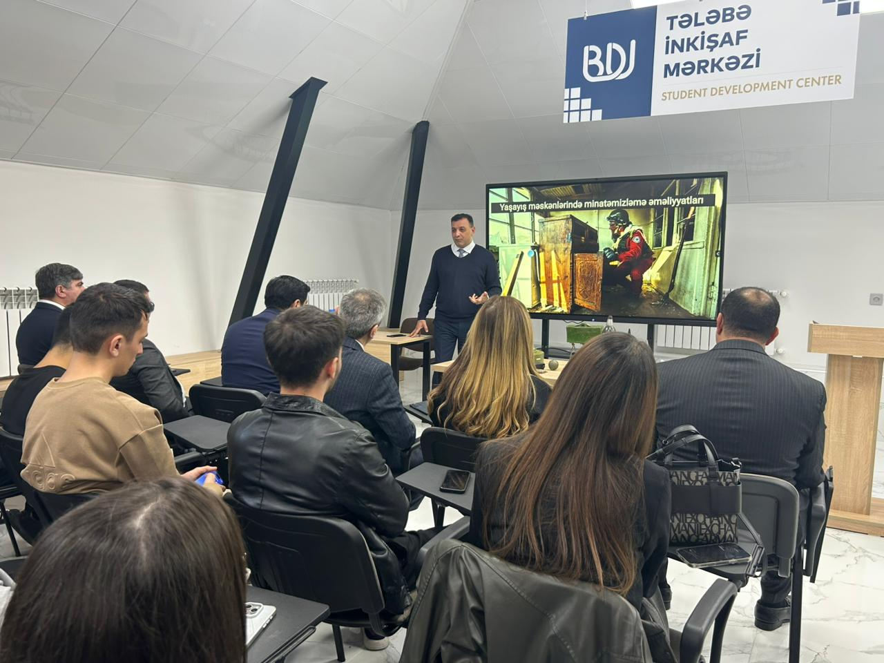 Baku State University (BSU) hosted a training session on “Mine Clearance in the Liberated Territories” conducted by Ramil Azizov, Head of the Education and Criminal Work Department at the Mine Clearance Agency of the Republic of Azerbaijan (ANAMA).