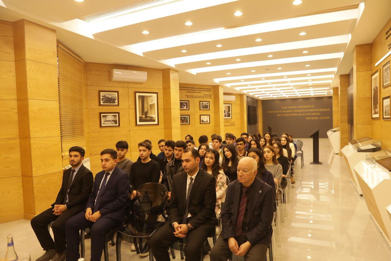 Советник ректора БГУ по науке и образованию Айдын Кязымзаде отметил, что имя великого Гейдара Алиева стало символом нашей государственности. Он сказал, что наш вождь, обладавший редкими управленческими и лидерскими качествами, врожденным талантом и высоким чувством патриотизма, являлся сильной личностью, создавшей политические, экономические, правовые, социально-культурные основы независимого Азербайджана и обеспечившей его развитие. В стратегии великого Гейдара Алиева, направленной на будущее азербайджанского народа, одним из приоритетных направлений было развитие сектора образования.