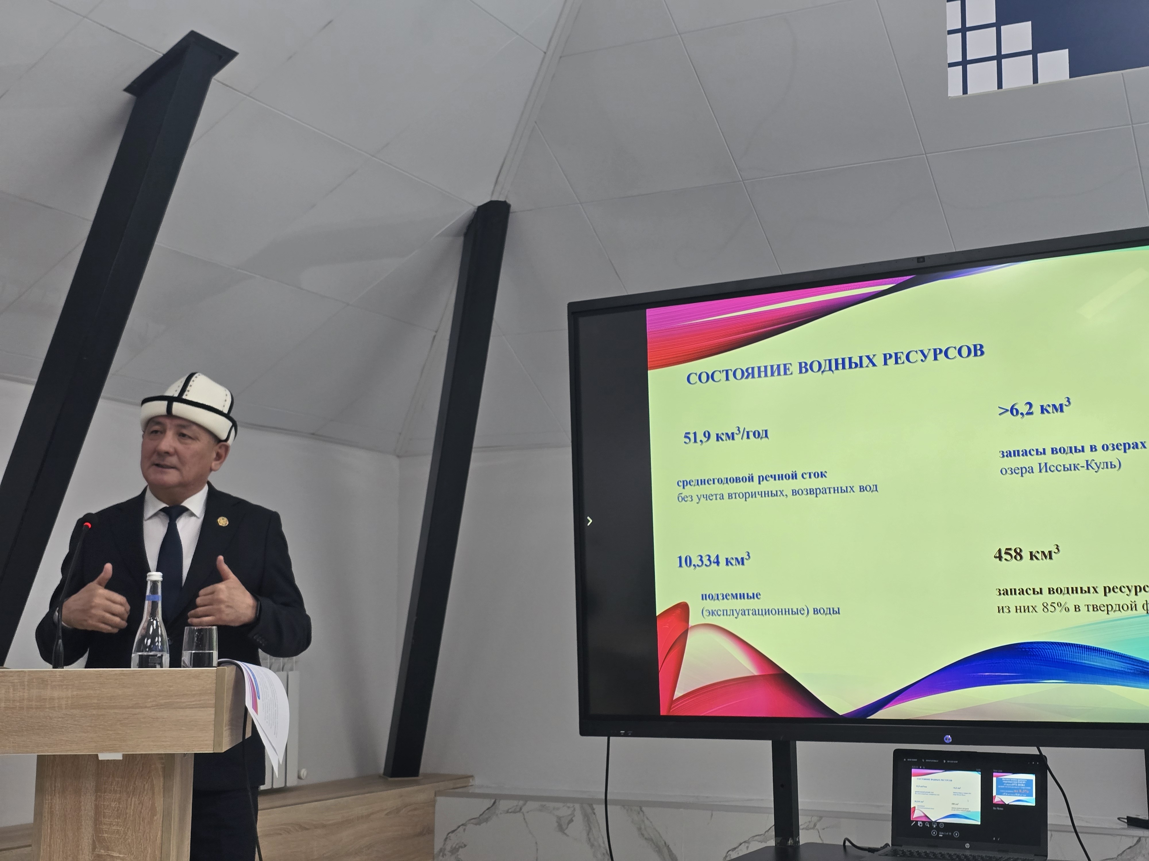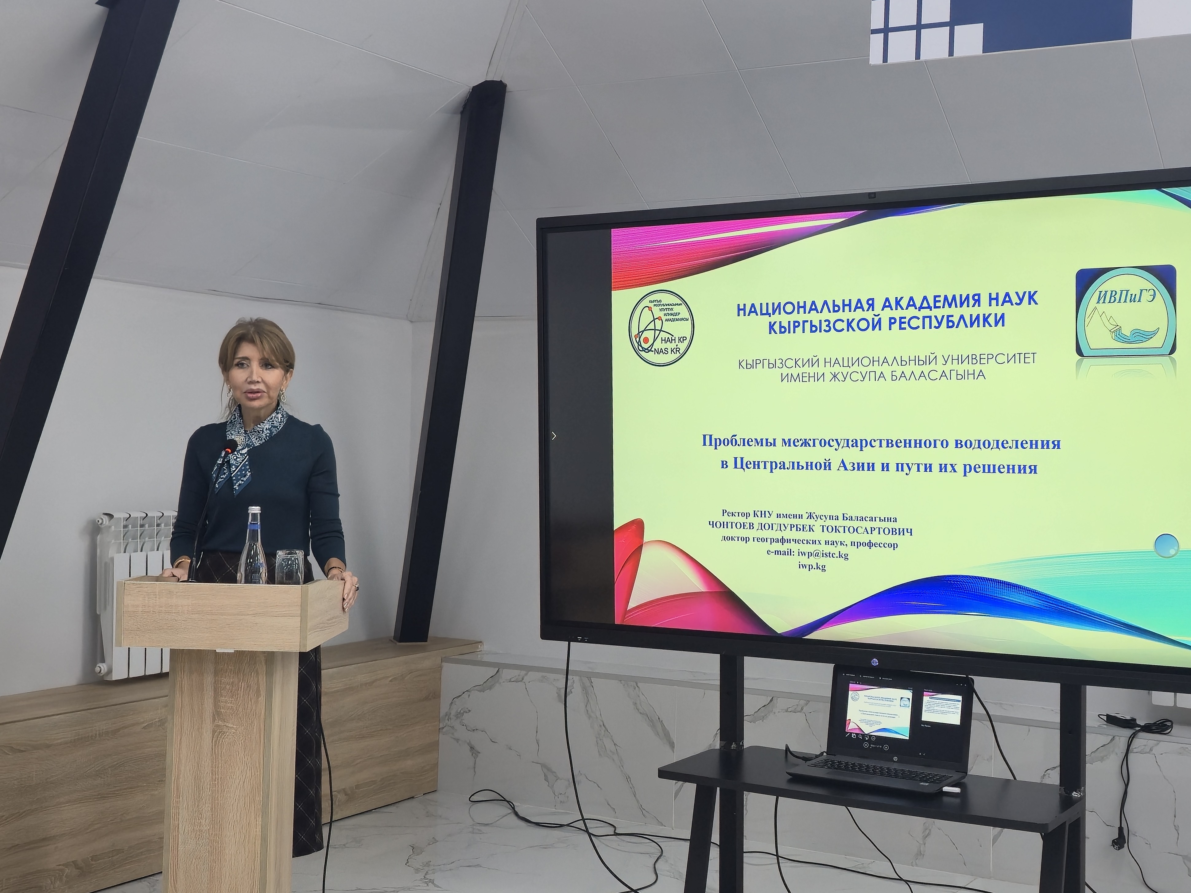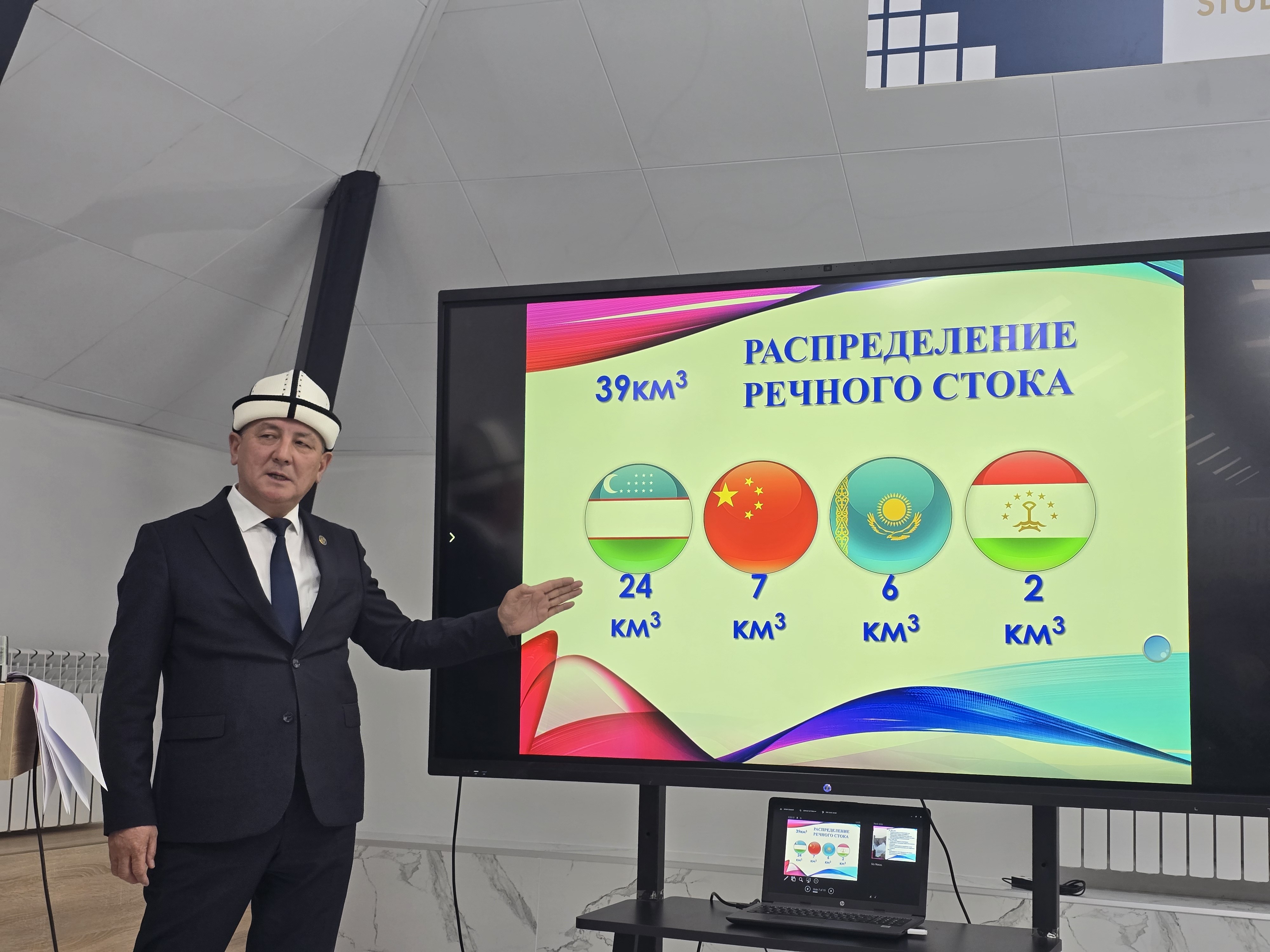 Далее ректор Кыргызского национального университета, доктор географических наук, профессор Догдурбек Чонтоев прочитал лекцию на тему «Проблемы распределение воды между государствами Центральной Азии и пути их решения».