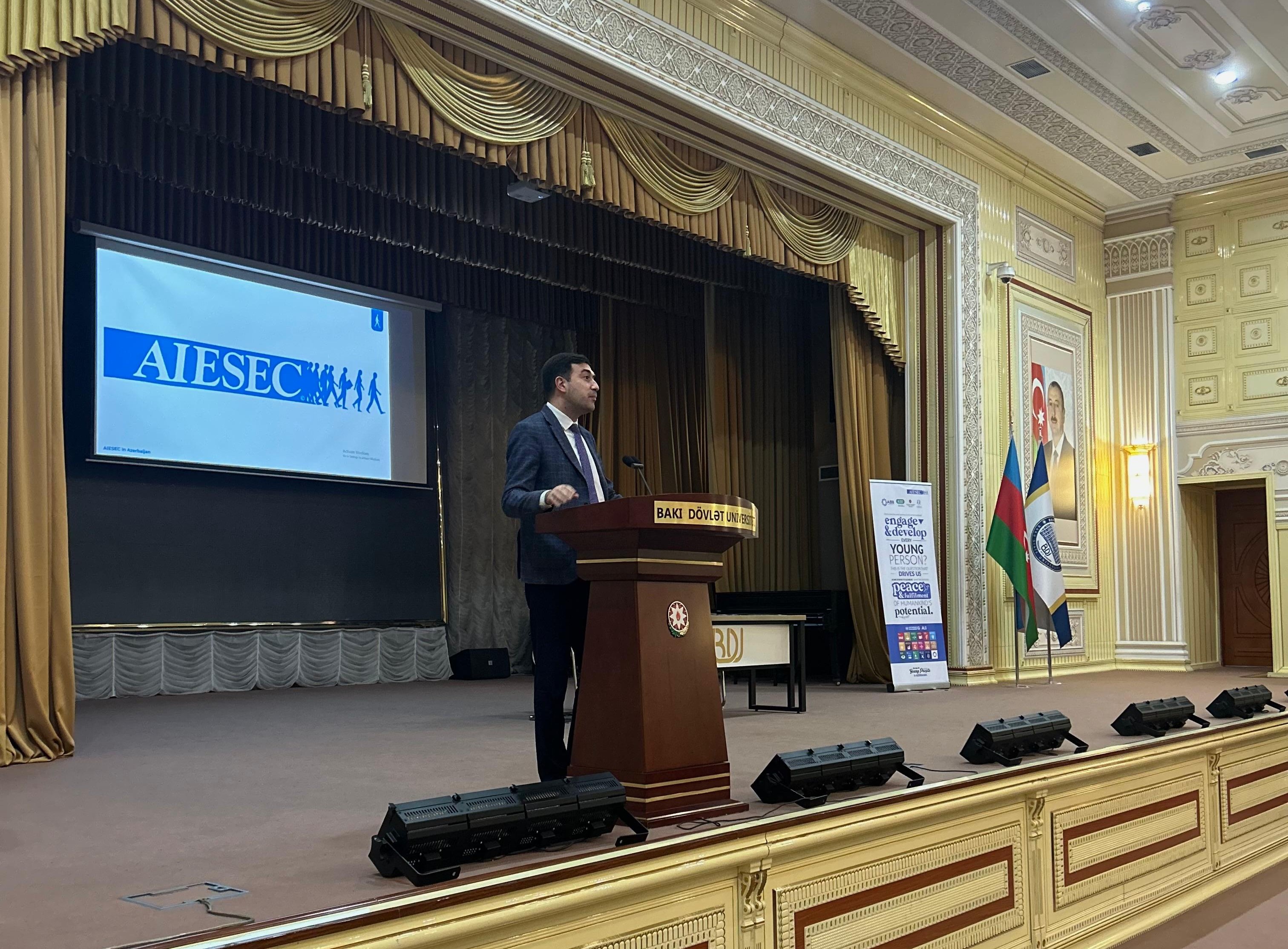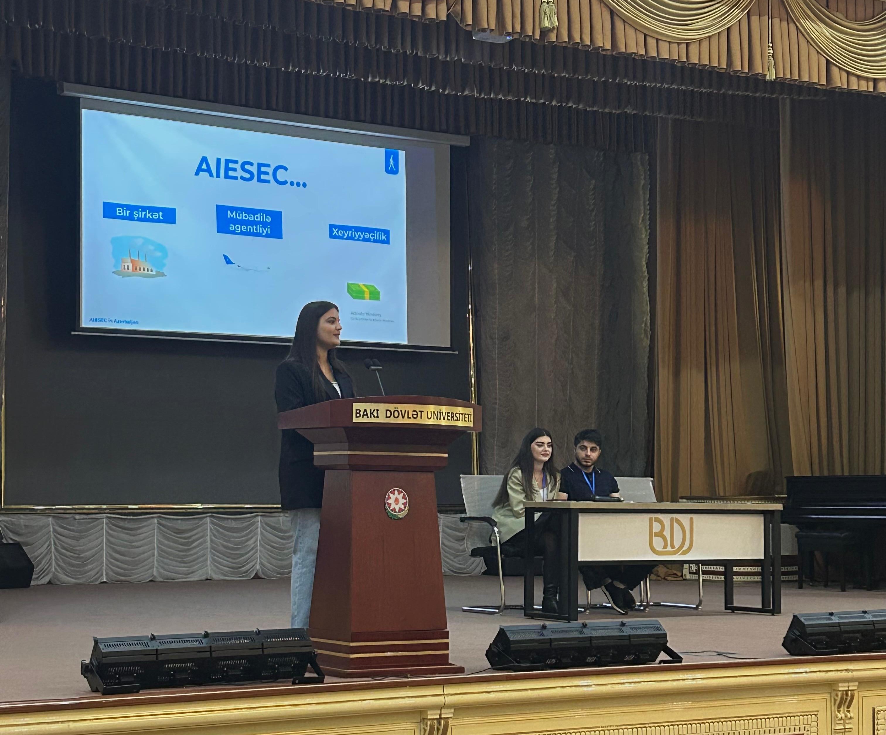 Назенин Мамедли, председатель комитета по маркетингу и связям с общественностью «AIESEC Азербайджан», рассказала студентам о деятельности организации, международных программах и процессе вступления в неё. Она отметила, что волонтерство за рубежом, оплачиваемые стажировки и лидерские программы, предлагаемые «AIESEC» для студентов, создают широкие возможности для участников в плане личностного развития, знакомства с новыми культурами и построения глобальной сети контактов.
