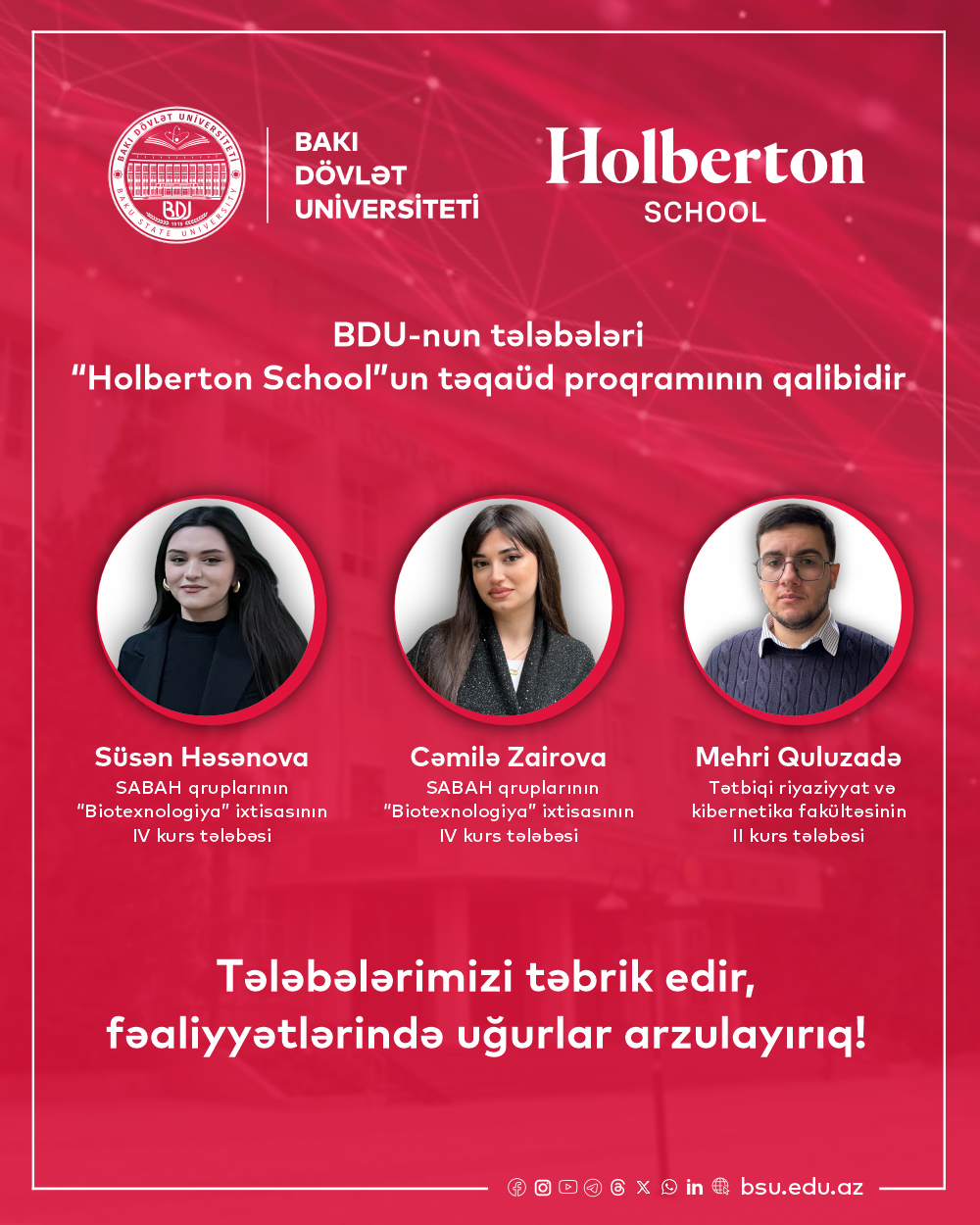Студентки специальности «Биотехнология» групп SABAH Бакинского государственного университета Сюсен Гасанова и Джамила Заирова стали победителями стопроцентной стипендиальной программы «Генеративный искусственный интеллект» (Generative Artificial Intelligence – GenAI) Holberton School.