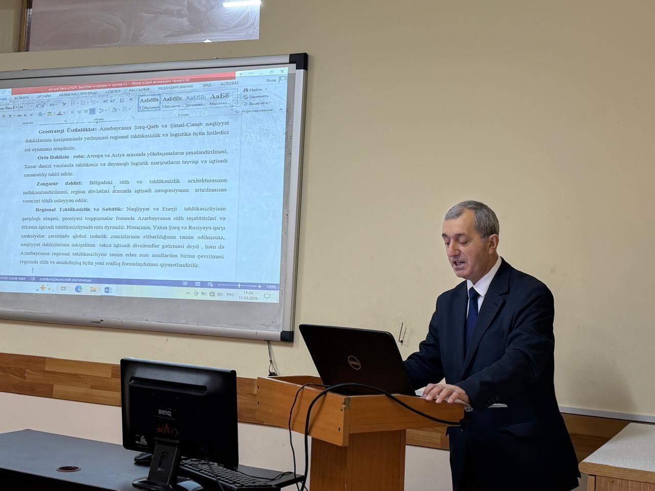 Доклад на семинаре представил доцент кафедры мировой экономики Габиль Асланов. Он подробно проанализировал растущую роль международных транспортных коридоров в глобальной и региональной экономической системе. Докладчик обратил внимание на выгодное географическое положение Азербайджана и отметил, что страна расположена на пересечении важных маршрутов, таких как транспортный коридор Восток-Запад и транспортный коридор Север-Юг. Этот фактор, помимо увеличения транзитного потенциала Азербайджана, также играет важную роль в обеспечении региональной экономической безопасности.