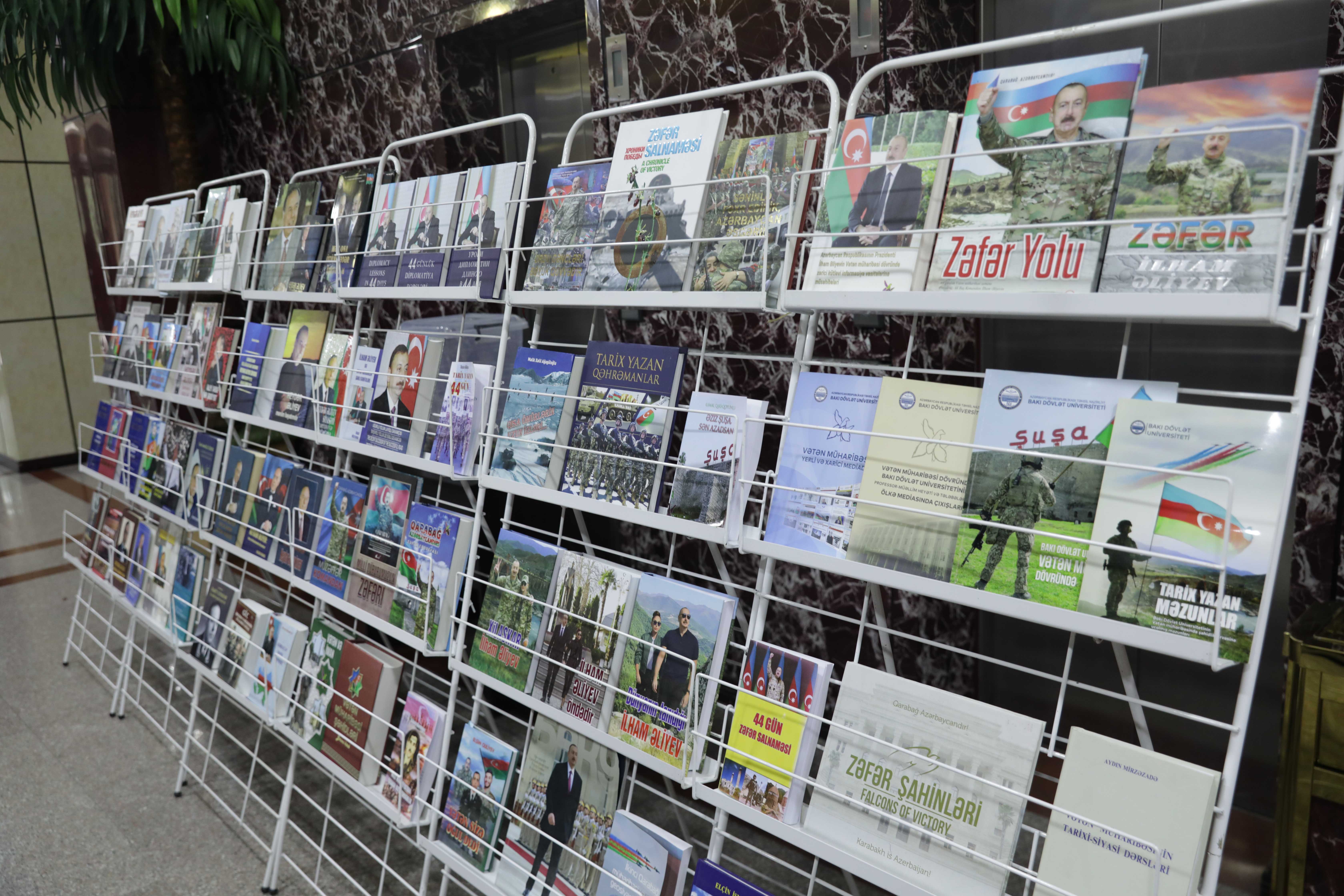 Среди представленных книг – «44-дневные уроки дипломатии», «Летопись Победы», «Победа нашей национальной гордости», издания, посвящённые павшим выпускникам БГУ и другим героям.