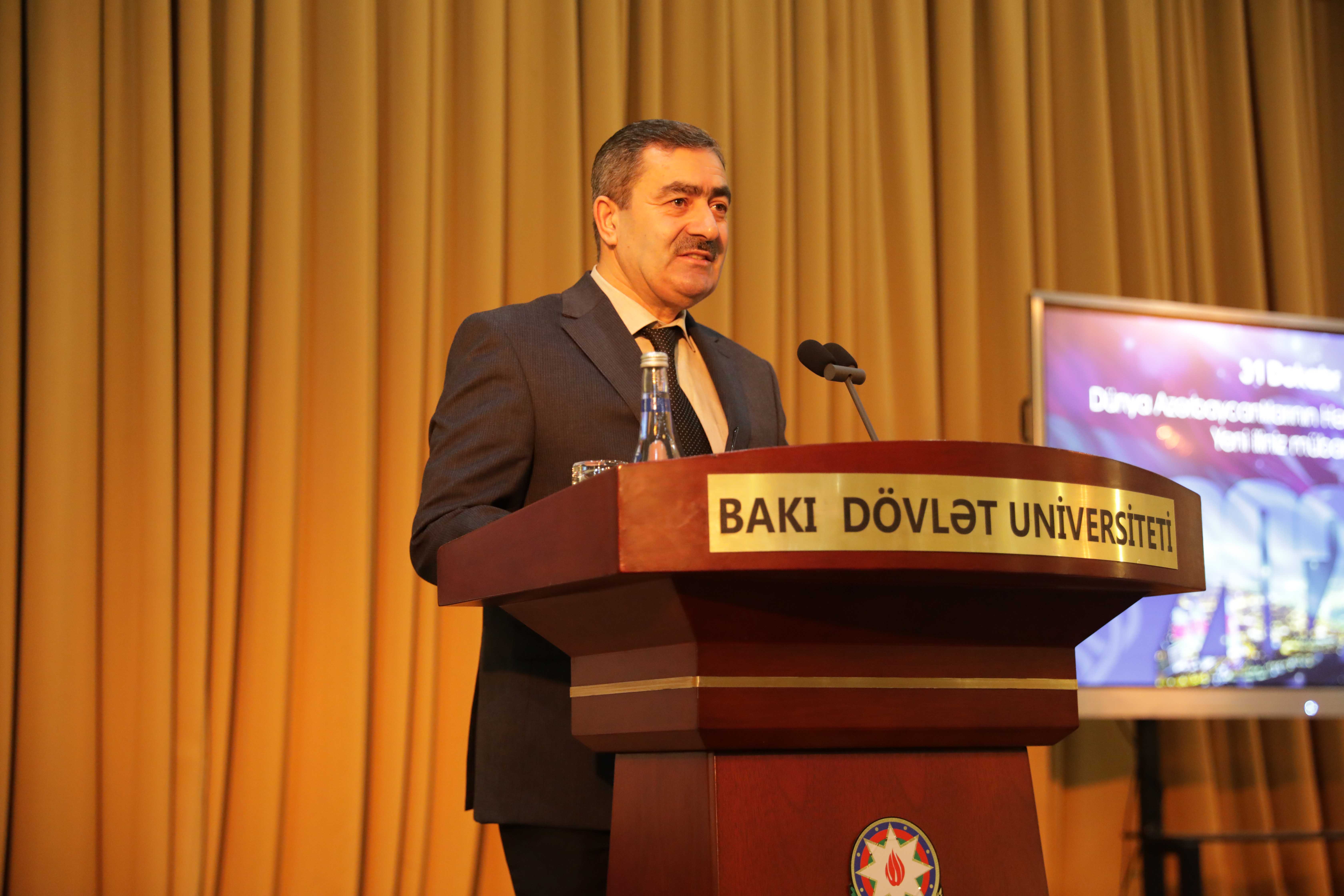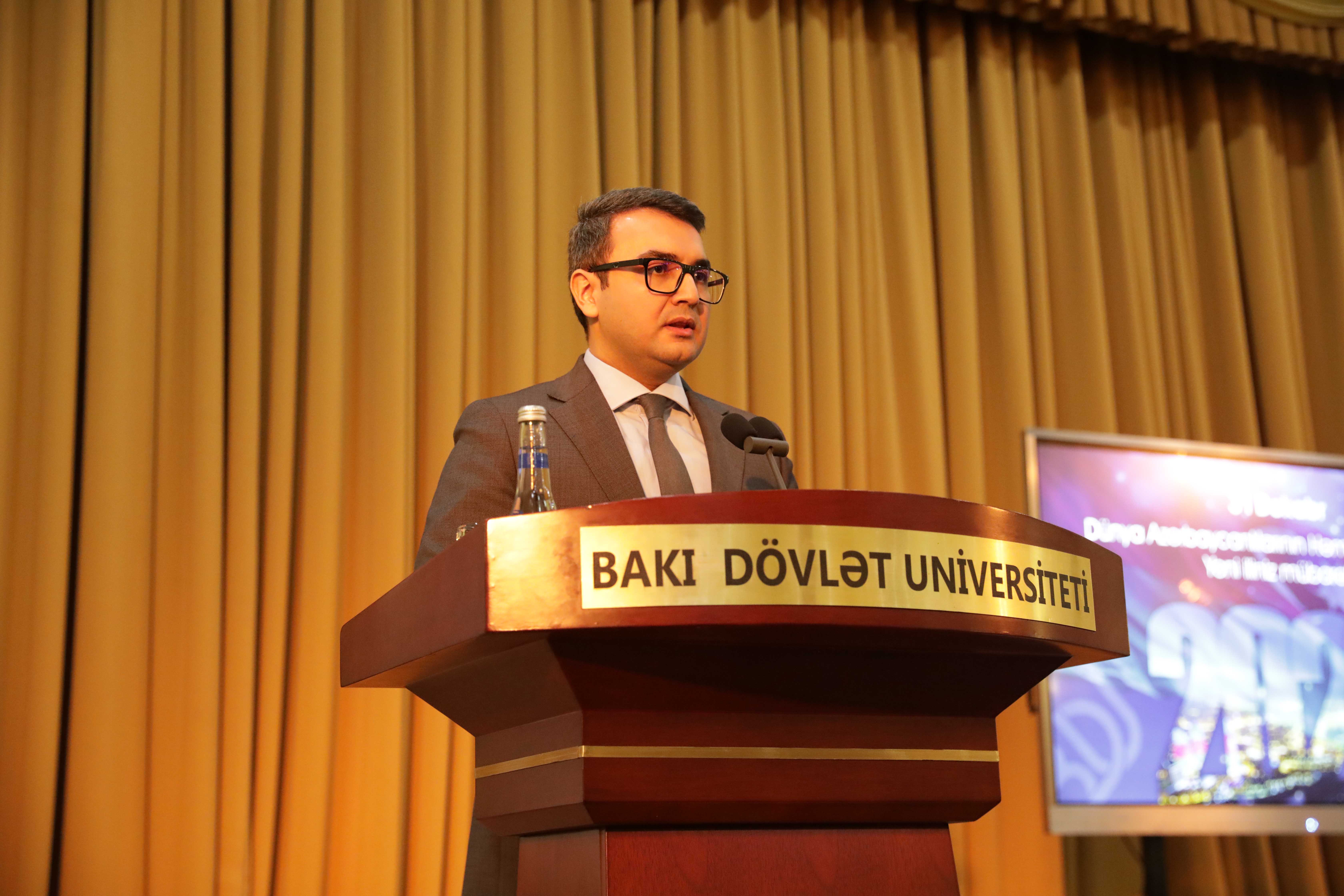 Выступая на мероприятии, ректор БГУ Эльчин Бабаев отметил, что наши соотечественники во всем мире ежегодно с большим энтузиазмом и воодушевлением отмечают 31 Декабря – День солидарности азербайджанцев мира, и что этот праздник отмечается еще шире и величественнее после нашей великой Победы. Ректор подчеркнул, что «Будучи ещё председателем Верховного Меджлиса Нахчыванской Автономной Республики, великий Гейдар Алиев 16 декабря 1991 года счёл необходимым укрепление единства азербайджанцев всего мира и провозгласил 31 декабря Днём солидарности азербайджанцев мира. После этого в Верховном Совете Азербайджанской Республики было принято решение отмечать этот праздник по всей стране. В целях дальнейшего укрепления связей соотечественников, проживающих в разных странах, с Азербайджаном, для содействия единству и солидарности, в 2001 году в Баку состоялся Первый съезд азербайджанцев всего мира. Позже, проведение Второго съезда азербайджанцев всего мира в 2006 году, Третьего съезда в 2011 году и Четвёртого съезда в 2016 году способствовало работе по формированию диаспоры. Эти съезды подтверждают, что азербайджанцы всего мира тесно сплотились вокруг Президента Ильхама Алиева и Азербайджанского государства».
