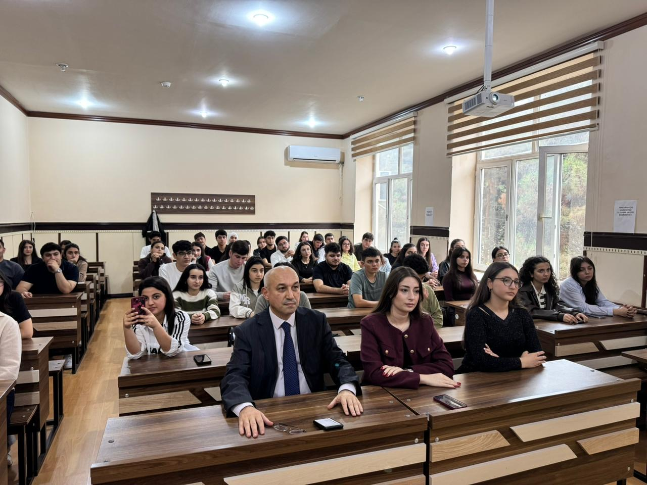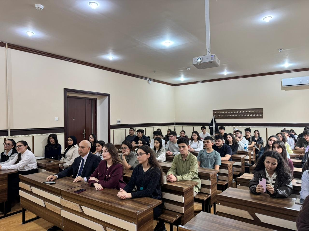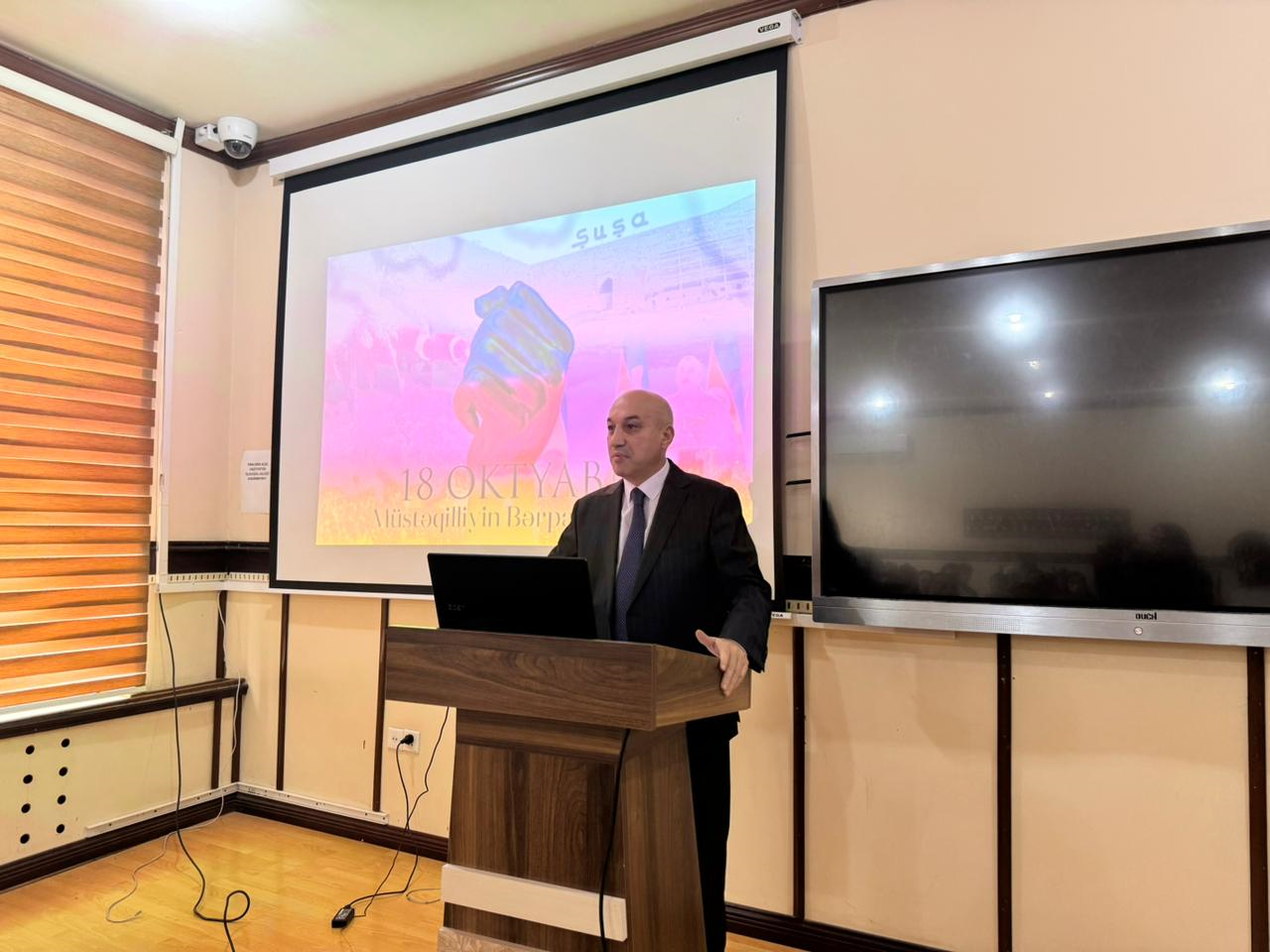 Заместитель декана факультета Талех Гахраманов рассказал о трудных, но славных этапах пути к независимости. Он отметил, что «Конституционный акт о государственной независимости Азербайджанской Республики», принятый 18 октября 1991 года, стал воплощением свободолюбивых стремлений народа и началом нового этапа в истории национальной государственности. Хотя в первые годы независимости страна столкнулась с политическим и экономическим кризисом, а также агрессией со стороны Армении, с возвращением к власти общенационального лидера Гейдара Алиева в Азербайджане были восстановлены стабильность, развитие и процесс государственного строительства. В результате 44-дневной Отечественной войны под руководством Верховного главнокомандующего Ильхама Алиева Азербайджан восстановил свою территориальную целостность, что стало торжеством укрепления независимости и могущества нашего государства.
