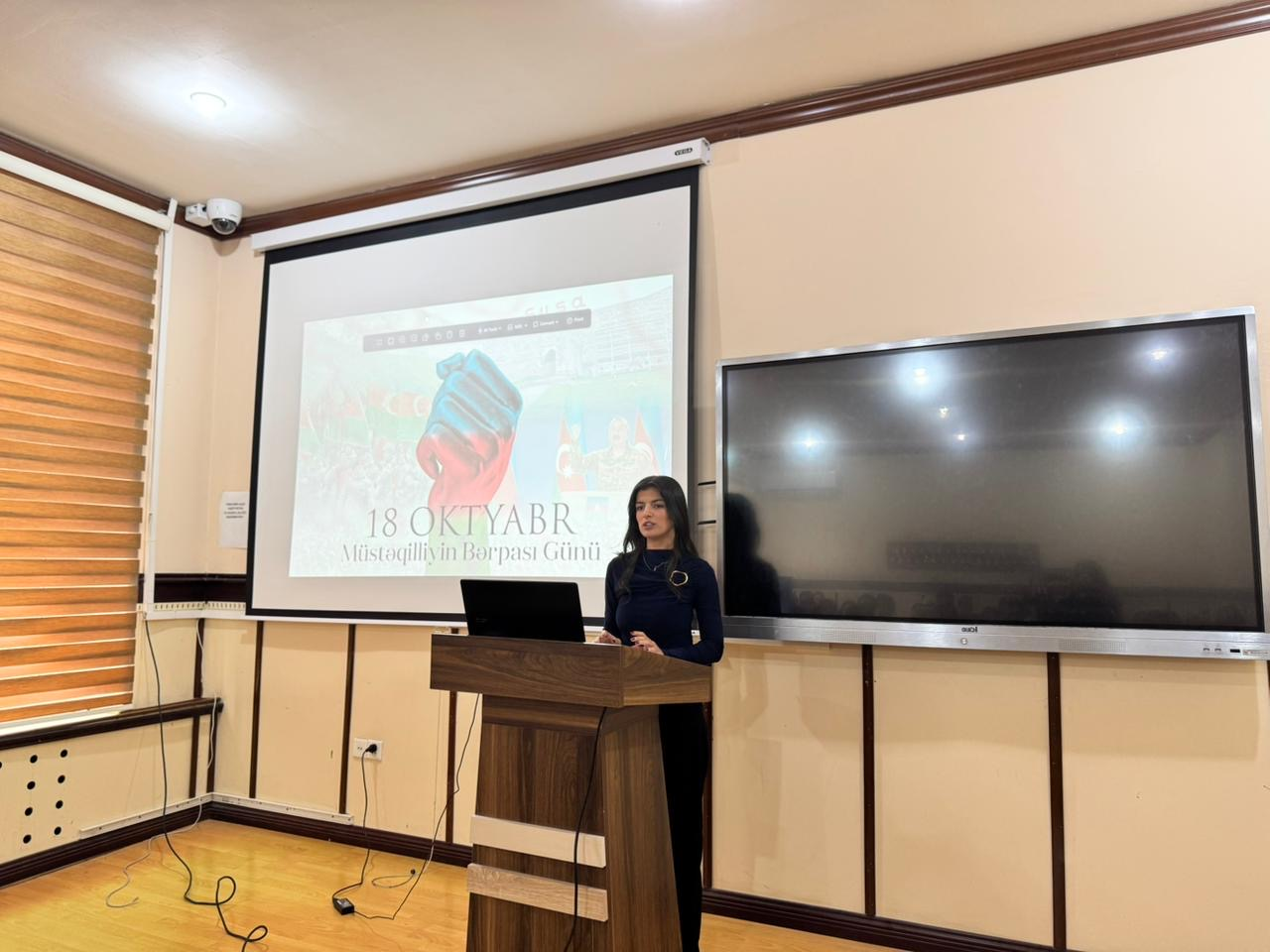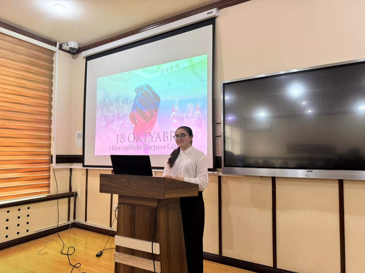 Затем студентка Назрин Агазаде прочитала стихотворение, посвящённое независимости, а студентка Айна Кязымова выступила с презентацией на тему «18 октября – День восстановления независимости».