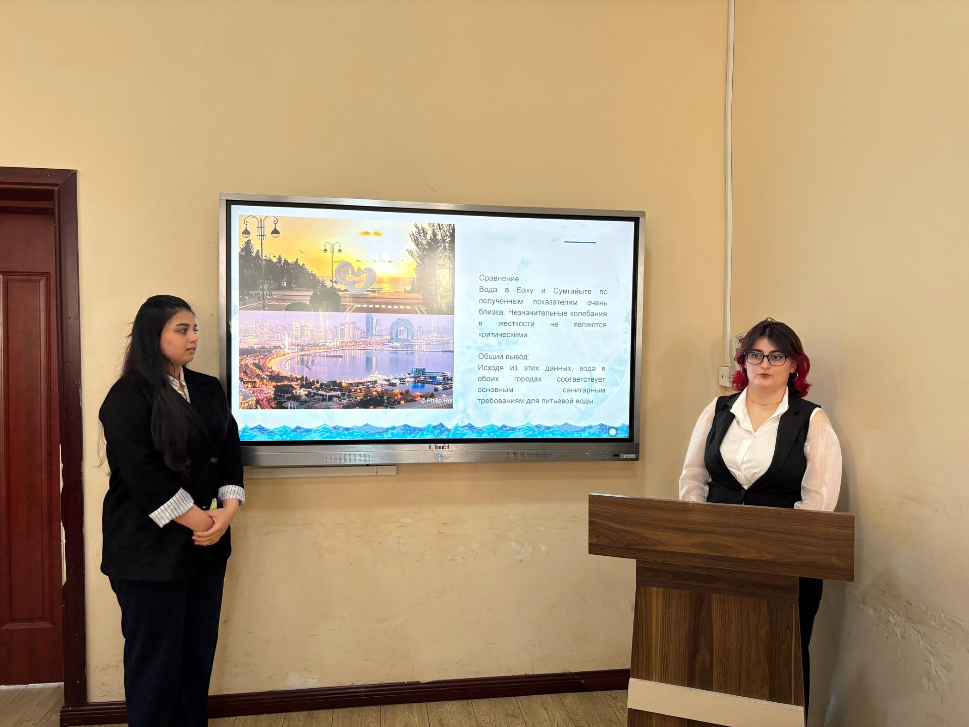 На семинаре студентки Арзу Аскерова и Ламия Гусейнова выступили на тему «Сравнение экохимического состава воды в городах Баку и Сумгаит». В рамках исследования были проанализированы показатели водных ресурсов Баку и Сумгаита, особенно питьевой и поверхностной воды. В пробах воды определялись концентрации тяжелых металлов (свинец, кадмий, медь, цинк и др.), нефтепродуктов, уровень pH, минеральные вещества и другие загрязнителей. Результаты показали, что уровень загрязнения воды в городе Сумгаит выше, чем в Баку. В частности, в результате влияния нефтехимической промышленности некоторые показатели выше нормы. В Баку сильнее наблюдалось влияние градостроительства и транспорта. Докладчики выдвинули предложения по улучшению качества воды, такие как усиление мониторинга, модернизация очистных сооружений и усиление экологического контроля.