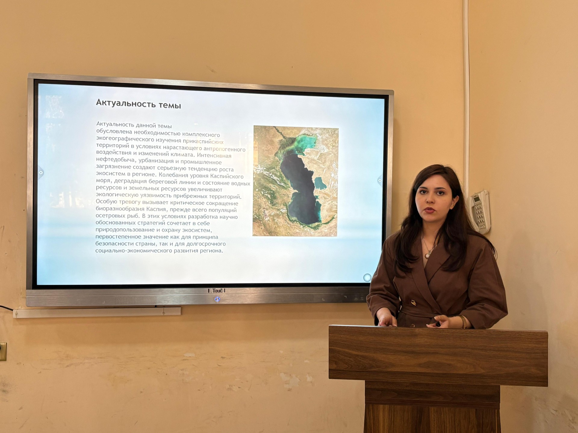 Затем студентка Сакина Гаджиева представила доклад на тему «Экогеографические аспекты устойчивого развития прибрежных территорий Каспийского моря Азербайджана». В докладе подробно проанализированы экогеографические особенности прибрежных зон Каспийского моря (Апшеронский, Хачмазский, Лянкяранский и др. районы), влияние изменения климата, повышения уровня моря, эрозии почв, сокращения биоразнообразия и увеличения антропогенной нагрузки. В исследовании рассмотрены пути защиты экологического баланса на этих территориях, развития зеленой инфраструктуры и эффективного использования природных ресурсов в рамках принципов устойчивого развития. Докладчик подчеркнула важность приоритетного учета экологических критериев в градостроительстве и архитектурных проектах, реализуемых в прибрежных зонах Каспийского моря.