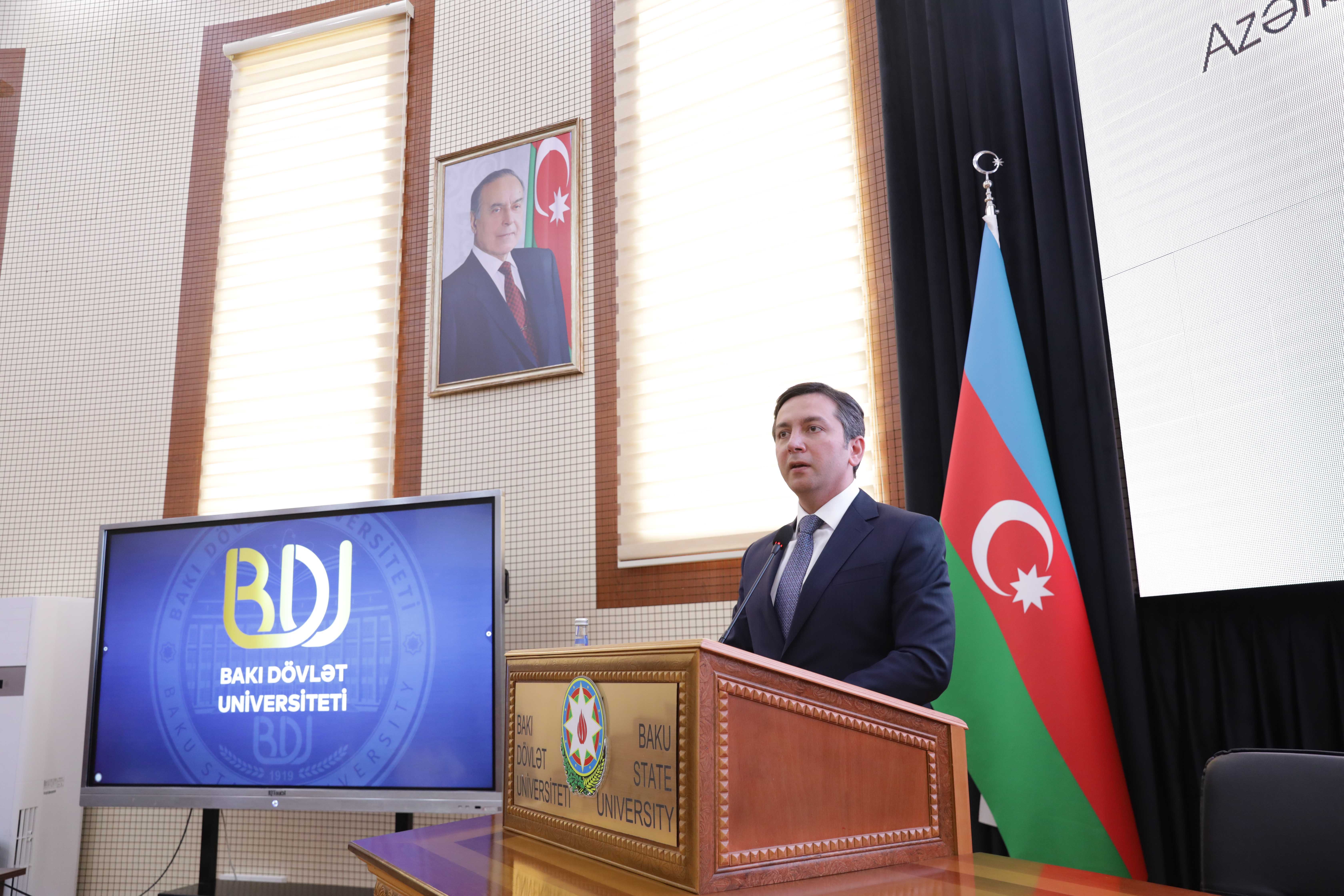 Заместитель министра иностранных дел Ялчин Рафиев выразил удовлетворение встречей со студентами университета, выпускником которого он является. Подчеркнув, что выпускники БГУ вносят большой вклад в успех дипломатической службы, он сказал: «Я бы рекомендовал вам максимально использовать возможности студенческой жизни, быть активными, изучать больше языков и совершенствовать навыки устной и письменной речи. Сегодня внешняя политика Азербайджана - многовекторная и сбалансированная. Обеспечение этого баланса правильным и прагматичным образом при защите национальных интересов требует большой компетентности. Президент Ильхам Алиев, как первый дипломат страны, является примером для всех дипломатов своим личным опытом, профессионализмом и решительностью».